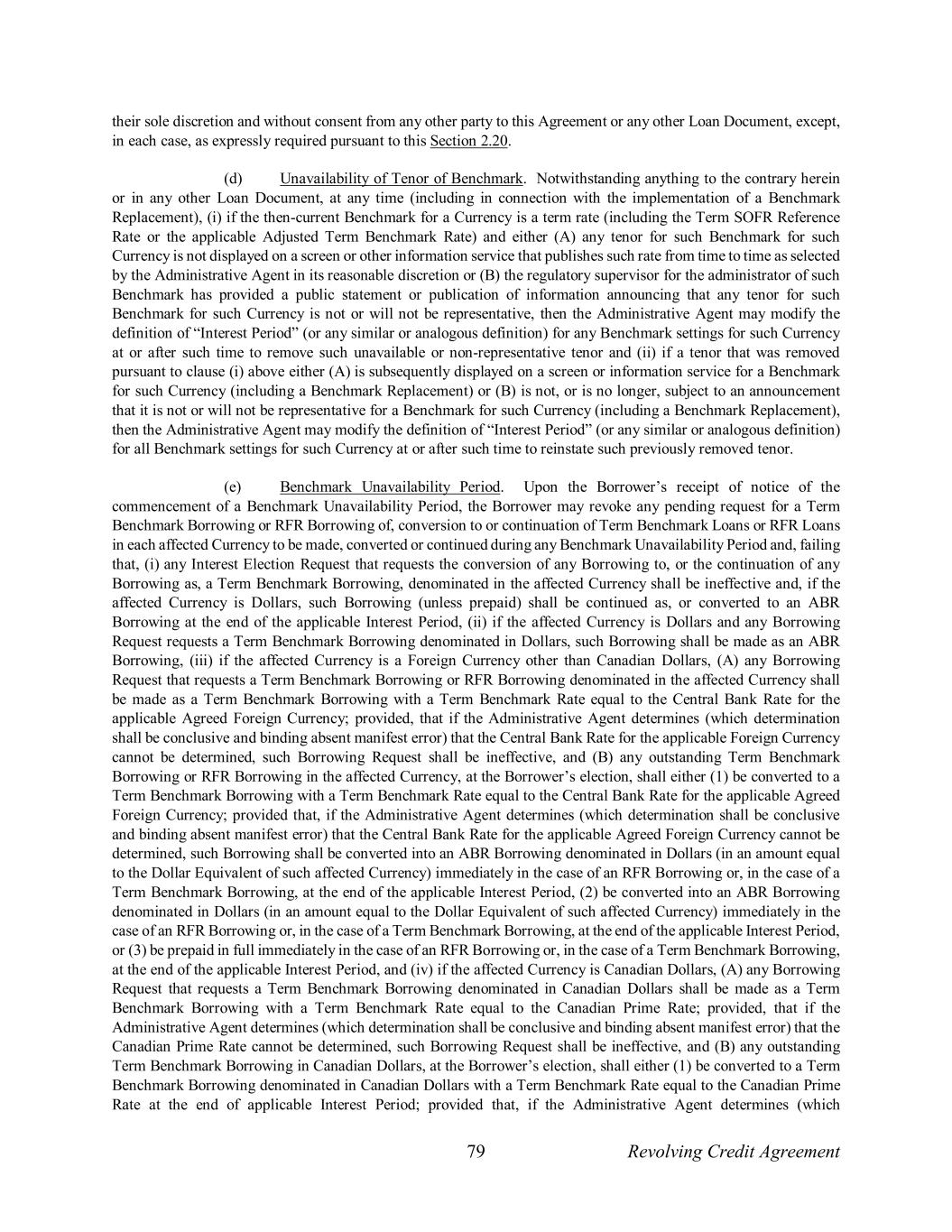 79 Revolving Credit Agreement their sole discretion and without consent from any other party to this Agreement or any other Loan Document, except, in each case, as expressly required pursuant to this Section 2.20. (d) Unavailability of Tenor of Benchmark. Notwithstanding anything to the contrary herein or in any other Loan Document, at any time (including in connection with the implementation of a Benchmark Replacement), (i) if the then-current Benchmark for a Currency is a term rate (including the Term SOFR Reference Rate or the applicable Adjusted Term Benchmark Rate) and either (A) any tenor for such Benchmark for such Currency is not displayed on a screen or other information service that publishes such rate from time to time as selected by the Administrative Agent in its reasonable discretion or (B) the regulatory supervisor for the administrator of such Benchmark has provided a public statement or publication of information announcing that any tenor for such Benchmark for such Currency is not or will not be representative, then the Administrative Agent may modify the definition of “Interest Period” (or any similar or analogous definition) for any Benchmark settings for such Currency at or after such time to remove such unavailable or non-representative tenor and (ii) if a tenor that was removed pursuant to clause (i) above either (A) is subsequently displayed on a screen or information service for a Benchmark for such Currency (including a Benchmark Replacement) or (B) is not, or is no longer, subject to an announcement that it is not or will not be representative for a Benchmark for such Currency (including a Benchmark Replacement), then the Administrative Agent may modify the definition of “Interest Period” (or any similar or analogous definition) for all Benchmark settings for such Currency at or after such time to reinstate such previously removed tenor. (e) Benchmark Unavailability Period. Upon the Borrower’s receipt of notice of the commencement of a Benchmark Unavailability Period, the Borrower may revoke any pending request for a Term Benchmark Borrowing or RFR Borrowing of, conversion to or continuation of Term Benchmark Loans or RFR Loans in each affected Currency to be made, converted or continued during any Benchmark Unavailability Period and, failing that, (i) any Interest Election Request that requests the conversion of any Borrowing to, or the continuation of any Borrowing as, a Term Benchmark Borrowing, denominated in the affected Currency shall be ineffective and, if the affected Currency is Dollars, such Borrowing (unless prepaid) shall be continued as, or converted to an ABR Borrowing at the end of the applicable Interest Period, (ii) if the affected Currency is Dollars and any Borrowing Request requests a Term Benchmark Borrowing denominated in Dollars, such Borrowing shall be made as an ABR Borrowing, (iii) if the affected Currency is a Foreign Currency other than Canadian Dollars, (A) any Borrowing Request that requests a Term Benchmark Borrowing or RFR Borrowing denominated in the affected Currency shall be made as a Term Benchmark Borrowing with a Term Benchmark Rate equal to the Central Bank Rate for the applicable Agreed Foreign Currency; provided, that if the Administrative Agent determines (which determination shall be conclusive and binding absent manifest error) that the Central Bank Rate for the applicable Foreign Currency cannot be determined, such Borrowing Request shall be ineffective, and (B) any outstanding Term Benchmark Borrowing or RFR Borrowing in the affected Currency, at the Borrower’s election, shall either (1) be converted to a Term Benchmark Borrowing with a Term Benchmark Rate equal to the Central Bank Rate for the applicable Agreed Foreign Currency; provided that, if the Administrative Agent determines (which determination shall be conclusive and binding absent manifest error) that the Central Bank Rate for the applicable Agreed Foreign Currency cannot be determined, such Borrowing shall be converted into an ABR Borrowing denominated in Dollars (in an amount equal to the Dollar Equivalent of such affected Currency) immediately in the case of an RFR Borrowing or, in the case of a Term Benchmark Borrowing, at the end of the applicable Interest Period, (2) be converted into an ABR Borrowing denominated in Dollars (in an amount equal to the Dollar Equivalent of such affected Currency) immediately in the case of an RFR Borrowing or, in the case of a Term Benchmark Borrowing, at the end of the applicable Interest Period, or (3) be prepaid in full immediately in the case of an RFR Borrowing or, in the case of a Term Benchmark Borrowing, at the end of the applicable Interest Period, and (iv) if the affected Currency is Canadian Dollars, (A) any Borrowing Request that requests a Term Benchmark Borrowing denominated in Canadian Dollars shall be made as a Term Benchmark Borrowing with a Term Benchmark Rate equal to the Canadian Prime Rate; provided, that if the Administrative Agent determines (which determination shall be conclusive and binding absent manifest error) that the Canadian Prime Rate cannot be determined, such Borrowing Request shall be ineffective, and (B) any outstanding Term Benchmark Borrowing in Canadian Dollars, at the Borrower’s election, shall either (1) be converted to a Term Benchmark Borrowing denominated in Canadian Dollars with a Term Benchmark Rate equal to the Canadian Prime Rate at the end of applicable Interest Period; provided that, if the Administrative Agent determines (which