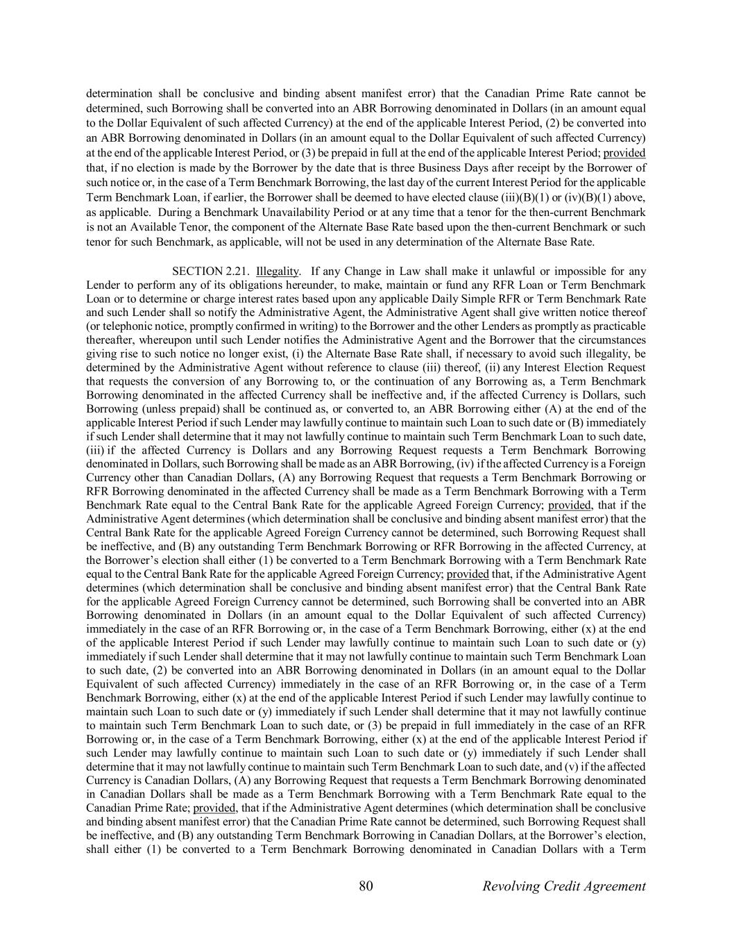 80 Revolving Credit Agreement determination shall be conclusive and binding absent manifest error) that the Canadian Prime Rate cannot be determined, such Borrowing shall be converted into an ABR Borrowing denominated in Dollars (in an amount equal to the Dollar Equivalent of such affected Currency) at the end of the applicable Interest Period, (2) be converted into an ABR Borrowing denominated in Dollars (in an amount equal to the Dollar Equivalent of such affected Currency) at the end of the applicable Interest Period, or (3) be prepaid in full at the end of the applicable Interest Period; provided that, if no election is made by the Borrower by the date that is three Business Days after receipt by the Borrower of such notice or, in the case of a Term Benchmark Borrowing, the last day of the current Interest Period for the applicable Term Benchmark Loan, if earlier, the Borrower shall be deemed to have elected clause (iii)(B)(1) or (iv)(B)(1) above, as applicable. During a Benchmark Unavailability Period or at any time that a tenor for the then-current Benchmark is not an Available Tenor, the component of the Alternate Base Rate based upon the then-current Benchmark or such tenor for such Benchmark, as applicable, will not be used in any determination of the Alternate Base Rate. SECTION 2.21. Illegality. If any Change in Law shall make it unlawful or impossible for any Lender to perform any of its obligations hereunder, to make, maintain or fund any RFR Loan or Term Benchmark Loan or to determine or charge interest rates based upon any applicable Daily Simple RFR or Term Benchmark Rate and such Lender shall so notify the Administrative Agent, the Administrative Agent shall give written notice thereof (or telephonic notice, promptly confirmed in writing) to the Borrower and the other Lenders as promptly as practicable thereafter, whereupon until such Lender notifies the Administrative Agent and the Borrower that the circumstances giving rise to such notice no longer exist, (i) the Alternate Base Rate shall, if necessary to avoid such illegality, be determined by the Administrative Agent without reference to clause (iii) thereof, (ii) any Interest Election Request that requests the conversion of any Borrowing to, or the continuation of any Borrowing as, a Term Benchmark Borrowing denominated in the affected Currency shall be ineffective and, if the affected Currency is Dollars, such Borrowing (unless prepaid) shall be continued as, or converted to, an ABR Borrowing either (A) at the end of the applicable Interest Period if such Lender may lawfully continue to maintain such Loan to such date or (B) immediately if such Lender shall determine that it may not lawfully continue to maintain such Term Benchmark Loan to such date, (iii) if the affected Currency is Dollars and any Borrowing Request requests a Term Benchmark Borrowing denominated in Dollars, such Borrowing shall be made as an ABR Borrowing, (iv) if the affected Currency is a Foreign Currency other than Canadian Dollars, (A) any Borrowing Request that requests a Term Benchmark Borrowing or RFR Borrowing denominated in the affected Currency shall be made as a Term Benchmark Borrowing with a Term Benchmark Rate equal to the Central Bank Rate for the applicable Agreed Foreign Currency; provided, that if the Administrative Agent determines (which determination shall be conclusive and binding absent manifest error) that the Central Bank Rate for the applicable Agreed Foreign Currency cannot be determined, such Borrowing Request shall be ineffective, and (B) any outstanding Term Benchmark Borrowing or RFR Borrowing in the affected Currency, at the Borrower’s election shall either (1) be converted to a Term Benchmark Borrowing with a Term Benchmark Rate equal to the Central Bank Rate for the applicable Agreed Foreign Currency; provided that, if the Administrative Agent determines (which determination shall be conclusive and binding absent manifest error) that the Central Bank Rate for the applicable Agreed Foreign Currency cannot be determined, such Borrowing shall be converted into an ABR Borrowing denominated in Dollars (in an amount equal to the Dollar Equivalent of such affected Currency) immediately in the case of an RFR Borrowing or, in the case of a Term Benchmark Borrowing, either (x) at the end of the applicable Interest Period if such Lender may lawfully continue to maintain such Loan to such date or (y) immediately if such Lender shall determine that it may not lawfully continue to maintain such Term Benchmark Loan to such date, (2) be converted into an ABR Borrowing denominated in Dollars (in an amount equal to the Dollar Equivalent of such affected Currency) immediately in the case of an RFR Borrowing or, in the case of a Term Benchmark Borrowing, either (x) at the end of the applicable Interest Period if such Lender may lawfully continue to maintain such Loan to such date or (y) immediately if such Lender shall determine that it may not lawfully continue to maintain such Term Benchmark Loan to such date, or (3) be prepaid in full immediately in the case of an RFR Borrowing or, in the case of a Term Benchmark Borrowing, either (x) at the end of the applicable Interest Period if such Lender may lawfully continue to maintain such Loan to such date or (y) immediately if such Lender shall determine that it may not lawfully continue to maintain such Term Benchmark Loan to such date, and (v) if the affected Currency is Canadian Dollars, (A) any Borrowing Request that requests a Term Benchmark Borrowing denominated in Canadian Dollars shall be made as a Term Benchmark Borrowing with a Term Benchmark Rate equal to the Canadian Prime Rate; provided, that if the Administrative Agent determines (which determination shall be conclusive and binding absent manifest error) that the Canadian Prime Rate cannot be determined, such Borrowing Request shall be ineffective, and (B) any outstanding Term Benchmark Borrowing in Canadian Dollars, at