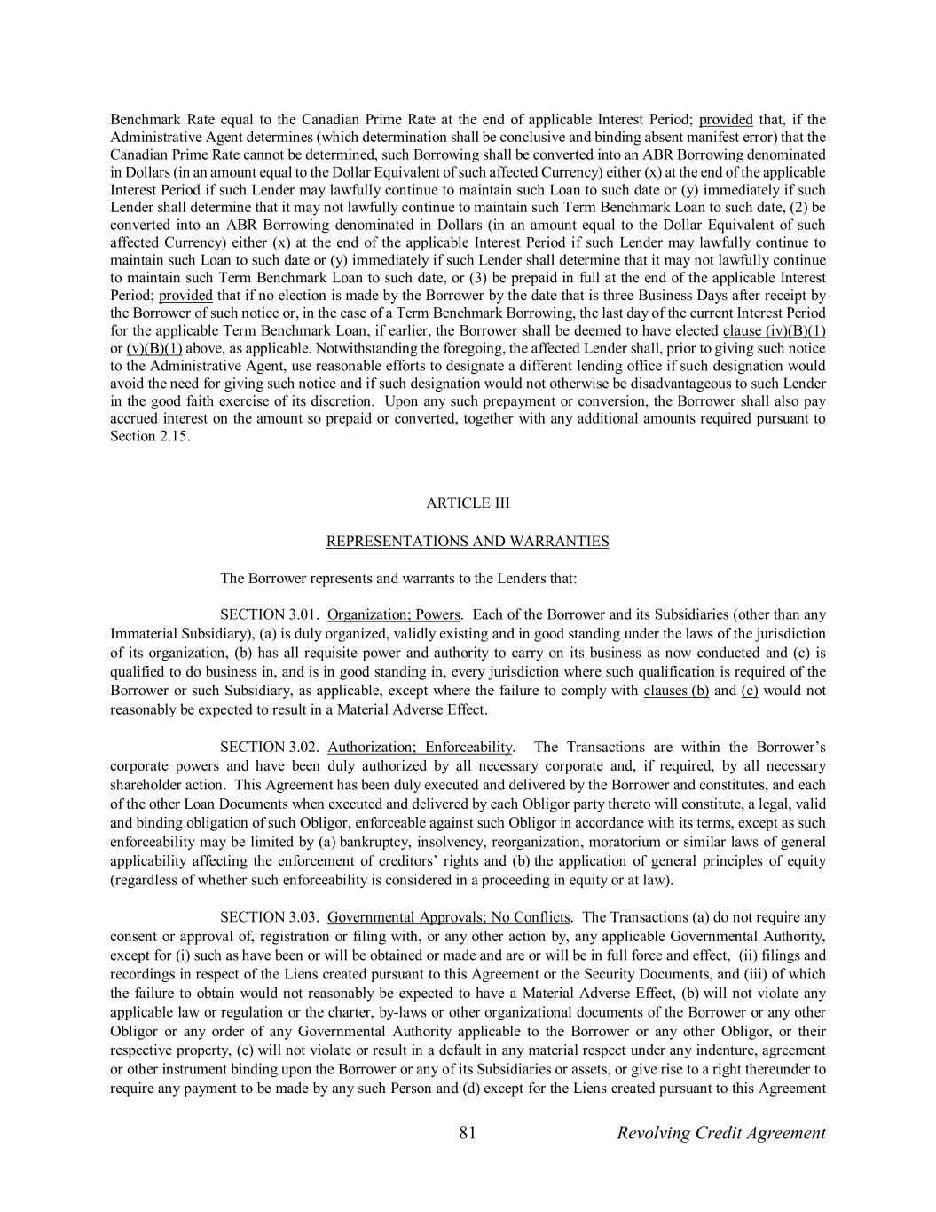 81 Revolving Credit Agreement Benchmark Rate equal to the Canadian Prime Rate at the end of applicable Interest Period; provided that, if the Administrative Agent determines (which determination shall be conclusive and binding absent manifest error) that the Canadian Prime Rate cannot be determined, such Borrowing shall be converted into an ABR Borrowing denominated in Dollars (in an amount equal to the Dollar Equivalent of such affected Currency) either (x) at the end of the applicable Interest Period if such Lender may lawfully continue to maintain such Loan to such date or (y) immediately if such Lender shall determine that it may not lawfully continue to maintain such Term Benchmark Loan to such date, (2) be converted into an ABR Borrowing denominated in Dollars (in an amount equal to the Dollar Equivalent of such affected Currency) either (x) at the end of the applicable Interest Period if such Lender may lawfully continue to maintain such Loan to such date or (y) immediately if such Lender shall determine that it may not lawfully continue to maintain such Term Benchmark Loan to such date, or (3) be prepaid in full at the end of the applicable Interest Period; provided that if no election is made by the Borrower by the date that is three Business Days after receipt by the Borrower of such notice or, in the case of a Term Benchmark Borrowing, the last day of the current Interest Period for the applicable Term Benchmark Loan, if earlier, the Borrower shall be deemed to have elected clause (iv)(B)(1) or (v)(B)(1) above, as applicable. Notwithstanding the foregoing, the affected Lender shall, prior to giving such notice to the Administrative Agent, use reasonable efforts to designate a different lending office if such designation would avoid the need for giving such notice and if such designation would not otherwise be disadvantageous to such Lender in the good faith exercise of its discretion. Upon any such prepayment or conversion, the Borrower shall also pay accrued interest on the amount so prepaid or converted, together with any additional amounts required pursuant to Section 2.15. ARTICLE III REPRESENTATIONS AND WARRANTIES The Borrower represents and warrants to the Lenders that: SECTION 3.01. Organization; Powers. Each of the Borrower and its Subsidiaries (other than any Immaterial Subsidiary), (a) is duly organized, validly existing and in good standing under the laws of the jurisdiction of its organization, (b) has all requisite power and authority to carry on its business as now conducted and (c) is qualified to do business in, and is in good standing in, every jurisdiction where such qualification is required of the Borrower or such Subsidiary, as applicable, except where the failure to comply with clauses (b) and (c) would not reasonably be expected to result in a Material Adverse Effect. SECTION 3.02. Authorization; Enforceability. The Transactions are within the Borrower’s corporate powers and have been duly authorized by all necessary corporate and, if required, by all necessary shareholder action. This Agreement has been duly executed and delivered by the Borrower and constitutes, and each of the other Loan Documents when executed and delivered by each Obligor party thereto will constitute, a legal, valid and binding obligation of such Obligor, enforceable against such Obligor in accordance with its terms, except as such enforceability may be limited by (a) bankruptcy, insolvency, reorganization, moratorium or similar laws of general applicability affecting the enforcement of creditors’ rights and (b) the application of general principles of equity (regardless of whether such enforceability is considered in a proceeding in equity or at law). SECTION 3.03. Governmental Approvals; No Conflicts. The Transactions (a) do not require any consent or approval of, registration or filing with, or any other action by, any applicable Governmental Authority, except for (i) such as have been or will be obtained or made and are or will be in full force and effect, (ii) filings and recordings in respect of the Liens created pursuant to this Agreement or the Security Documents, and (iii) of which the failure to obtain would not reasonably be expected to have a Material Adverse Effect, (b) will not violate any applicable law or regulation or the charter, by-laws or other organizational documents of the Borrower or any other Obligor or any order of any Governmental Authority applicable to the Borrower or any other Obligor, or their respective property, (c) will not violate or result in a default in any material respect under any indenture, agreement or other instrument binding upon the Borrower or any of its Subsidiaries or assets, or give rise to a right thereunder to require any payment to be made by any such Person and (d) except for the Liens created pursuant to this Agreement