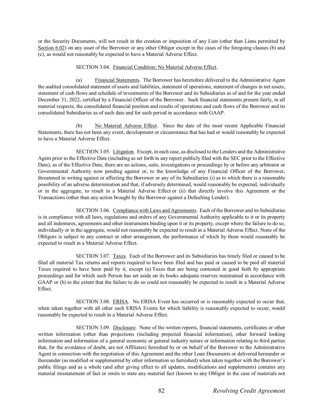 82 Revolving Credit Agreement or the Security Documents, will not result in the creation or imposition of any Lien (other than Liens permitted by Section 6.02) on any asset of the Borrower or any other Obligor except in the cases of the foregoing clauses (b) and (c), as would not reasonably be expected to have a Material Adverse Effect. SECTION 3.04. Financial Condition; No Material Adverse Effect. (a) Financial Statements. The Borrower has heretofore delivered to the Administrative Agent the audited consolidated statement of assets and liabilities, statement of operations, statement of changes in net assets, statement of cash flows and schedule of investments of the Borrower and its Subsidiaries as of and for the year ended December 31, 2022, certified by a Financial Officer of the Borrower. Such financial statements present fairly, in all material respects, the consolidated financial position and results of operations and cash flows of the Borrower and its consolidated Subsidiaries as of such date and for such period in accordance with GAAP. (b) No Material Adverse Effect. Since the date of the most recent Applicable Financial Statements, there has not been any event, development or circumstance that has had or would reasonably be expected to have a Material Adverse Effect. SECTION 3.05. Litigation. Except, in each case, as disclosed to the Lenders and the Administrative Agent prior to the Effective Date (including as set forth in any report publicly filed with the SEC prior to the Effective Date), as of the Effective Date, there are no actions, suits, investigations or proceedings by or before any arbitrator or Governmental Authority now pending against or, to the knowledge of any Financial Officer of the Borrower, threatened in writing against or affecting the Borrower or any of its Subsidiaries (i) as to which there is a reasonable possibility of an adverse determination and that, if adversely determined, would reasonably be expected, individually or in the aggregate, to result in a Material Adverse Effect or (ii) that directly involve this Agreement or the Transactions (other than any action brought by the Borrower against a Defaulting Lender). SECTION 3.06. Compliance with Laws and Agreements. Each of the Borrower and its Subsidiaries is in compliance with all laws, regulations and orders of any Governmental Authority applicable to it or its property and all indentures, agreements and other instruments binding upon it or its property, except where the failure to do so, individually or in the aggregate, would not reasonably be expected to result in a Material Adverse Effect. None of the Obligors is subject to any contract or other arrangement, the performance of which by them would reasonably be expected to result in a Material Adverse Effect. SECTION 3.07. Taxes. Each of the Borrower and its Subsidiaries has timely filed or caused to be filed all material Tax returns and reports required to have been filed and has paid or caused to be paid all material Taxes required to have been paid by it, except (a) Taxes that are being contested in good faith by appropriate proceedings and for which such Person has set aside on its books adequate reserves maintained in accordance with GAAP or (b) to the extent that the failure to do so could not reasonably be expected to result in a Material Adverse Effect. SECTION 3.08. ERISA. No ERISA Event has occurred or is reasonably expected to occur that, when taken together with all other such ERISA Events for which liability is reasonably expected to occur, would reasonably be expected to result in a Material Adverse Effect. SECTION 3.09. Disclosure. None of the written reports, financial statements, certificates or other written information (other than projections (including projected financial information), other forward looking information and information of a general economic or general industry nature or information relating to third parties that, for the avoidance of doubt, are not Affiliates) furnished by or on behalf of the Borrower to the Administrative Agent in connection with the negotiation of this Agreement and the other Loan Documents or delivered hereunder or thereunder (as modified or supplemented by other information so furnished) when taken together with the Borrower’s public filings and as a whole (and after giving effect to all updates, modifications and supplements) contains any material misstatement of fact or omits to state any material fact (known to any Obligor in the case of materials not