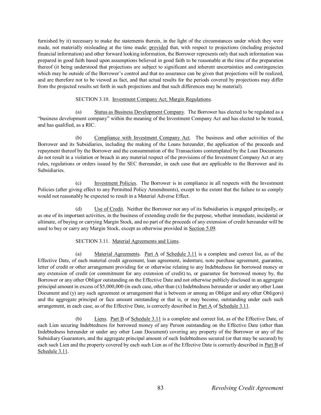 83 Revolving Credit Agreement furnished by it) necessary to make the statements therein, in the light of the circumstances under which they were made, not materially misleading at the time made; provided that, with respect to projections (including projected financial information) and other forward looking information, the Borrower represents only that such information was prepared in good faith based upon assumptions believed in good faith to be reasonable at the time of the preparation thereof (it being understood that projections are subject to significant and inherent uncertainties and contingencies which may be outside of the Borrower’s control and that no assurance can be given that projections will be realized, and are therefore not to be viewed as fact, and that actual results for the periods covered by projections may differ from the projected results set forth in such projections and that such differences may be material). SECTION 3.10. Investment Company Act; Margin Regulations. (a) Status as Business Development Company. The Borrower has elected to be regulated as a “business development company” within the meaning of the Investment Company Act and has elected to be treated, and has qualified, as a RIC. (b) Compliance with Investment Company Act. The business and other activities of the Borrower and its Subsidiaries, including the making of the Loans hereunder, the application of the proceeds and repayment thereof by the Borrower and the consummation of the Transactions contemplated by the Loan Documents do not result in a violation or breach in any material respect of the provisions of the Investment Company Act or any rules, regulations or orders issued by the SEC thereunder, in each case that are applicable to the Borrower and its Subsidiaries. (c) Investment Policies. The Borrower is in compliance in all respects with the Investment Policies (after giving effect to any Permitted Policy Amendments), except to the extent that the failure to so comply would not reasonably be expected to result in a Material Adverse Effect. (d) Use of Credit. Neither the Borrower nor any of its Subsidiaries is engaged principally, or as one of its important activities, in the business of extending credit for the purpose, whether immediate, incidental or ultimate, of buying or carrying Margin Stock, and no part of the proceeds of any extension of credit hereunder will be used to buy or carry any Margin Stock, except as otherwise provided in Section 5.09. SECTION 3.11. Material Agreements and Liens. (a) Material Agreements. Part A of Schedule 3.11 is a complete and correct list, as of the Effective Date, of each material credit agreement, loan agreement, indenture, note purchase agreement, guarantee, letter of credit or other arrangement providing for or otherwise relating to any Indebtedness for borrowed money or any extension of credit (or commitment for any extension of credit) to, or guarantee for borrowed money by, the Borrower or any other Obligor outstanding on the Effective Date and not otherwise publicly disclosed in an aggregate principal amount in excess of $5,000,000 (in each case, other than (x) Indebtedness hereunder or under any other Loan Document and (y) any such agreement or arrangement that is between or among an Obligor and any other Obligors) and the aggregate principal or face amount outstanding or that is, or may become, outstanding under each such arrangement, in each case, as of the Effective Date, is correctly described in Part A of Schedule 3.11. (b) Liens. Part B of Schedule 3.11 is a complete and correct list, as of the Effective Date, of each Lien securing Indebtedness for borrowed money of any Person outstanding on the Effective Date (other than Indebtedness hereunder or under any other Loan Document) covering any property of the Borrower or any of the Subsidiary Guarantors, and the aggregate principal amount of such Indebtedness secured (or that may be secured) by each such Lien and the property covered by each such Lien as of the Effective Date is correctly described in Part B of Schedule 3.11.