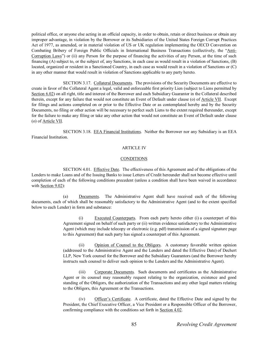 85 Revolving Credit Agreement political office, or anyone else acting in an official capacity, in order to obtain, retain or direct business or obtain any improper advantage, in violation by the Borrower or its Subsidiaries of the United States Foreign Corrupt Practices Act of 1977, as amended, or in material violation of US or UK regulation implementing the OECD Convention on Combating Bribery of Foreign Public Officials in International Business Transactions (collectively, the “Anti- Corruption Laws”) or (ii) any Person for the purpose of financing the activities of any Person, at the time of such financing (A) subject to, or the subject of, any Sanctions, in each case as would result in a violation of Sanctions, (B) located, organized or resident in a Sanctioned Country, in each case as would result in a violation of Sanctions or (C) in any other manner that would result in violation of Sanctions applicable to any party hereto. SECTION 3.17. Collateral Documents. The provisions of the Security Documents are effective to create in favor of the Collateral Agent a legal, valid and enforceable first priority Lien (subject to Liens permitted by Section 6.02) on all right, title and interest of the Borrower and each Subsidiary Guarantor in the Collateral described therein, except for any failure that would not constitute an Event of Default under clause (o) of Article VII. Except for filings and actions completed on or prior to the Effective Date or as contemplated hereby and by the Security Documents, no filing or other action will be necessary to perfect such Liens to the extent required thereunder, except for the failure to make any filing or take any other action that would not constitute an Event of Default under clause (o) of Article VII. SECTION 3.18. EEA Financial Institutions. Neither the Borrower nor any Subsidiary is an EEA Financial Institution. ARTICLE IV CONDITIONS SECTION 4.01. Effective Date. The effectiveness of this Agreement and of the obligations of the Lenders to make Loans and of the Issuing Banks to issue Letters of Credit hereunder shall not become effective until completion of each of the following conditions precedent (unless a condition shall have been waived in accordance with Section 9.02): (a) Documents. The Administrative Agent shall have received each of the following documents, each of which shall be reasonably satisfactory to the Administrative Agent (and to the extent specified below to each Lender) in form and substance: (i) Executed Counterparts. From each party hereto either (i) a counterpart of this Agreement signed on behalf of such party or (ii) written evidence satisfactory to the Administrative Agent (which may include telecopy or electronic (e.g. pdf) transmission of a signed signature page to this Agreement) that such party has signed a counterpart of this Agreement. (ii) Opinion of Counsel to the Obligors. A customary favorable written opinion (addressed to the Administrative Agent and the Lenders and dated the Effective Date) of Dechert LLP, New York counsel for the Borrower and the Subsidiary Guarantors (and the Borrower hereby instructs such counsel to deliver such opinion to the Lenders and the Administrative Agent). (iii) Corporate Documents. Such documents and certificates as the Administrative Agent or its counsel may reasonably request relating to the organization, existence and good standing of the Obligors, the authorization of the Transactions and any other legal matters relating to the Obligors, this Agreement or the Transactions. (iv) Officer’s Certificate. A certificate, dated the Effective Date and signed by the President, the Chief Executive Officer, a Vice President or a Responsible Officer of the Borrower, confirming compliance with the conditions set forth in Section 4.02.