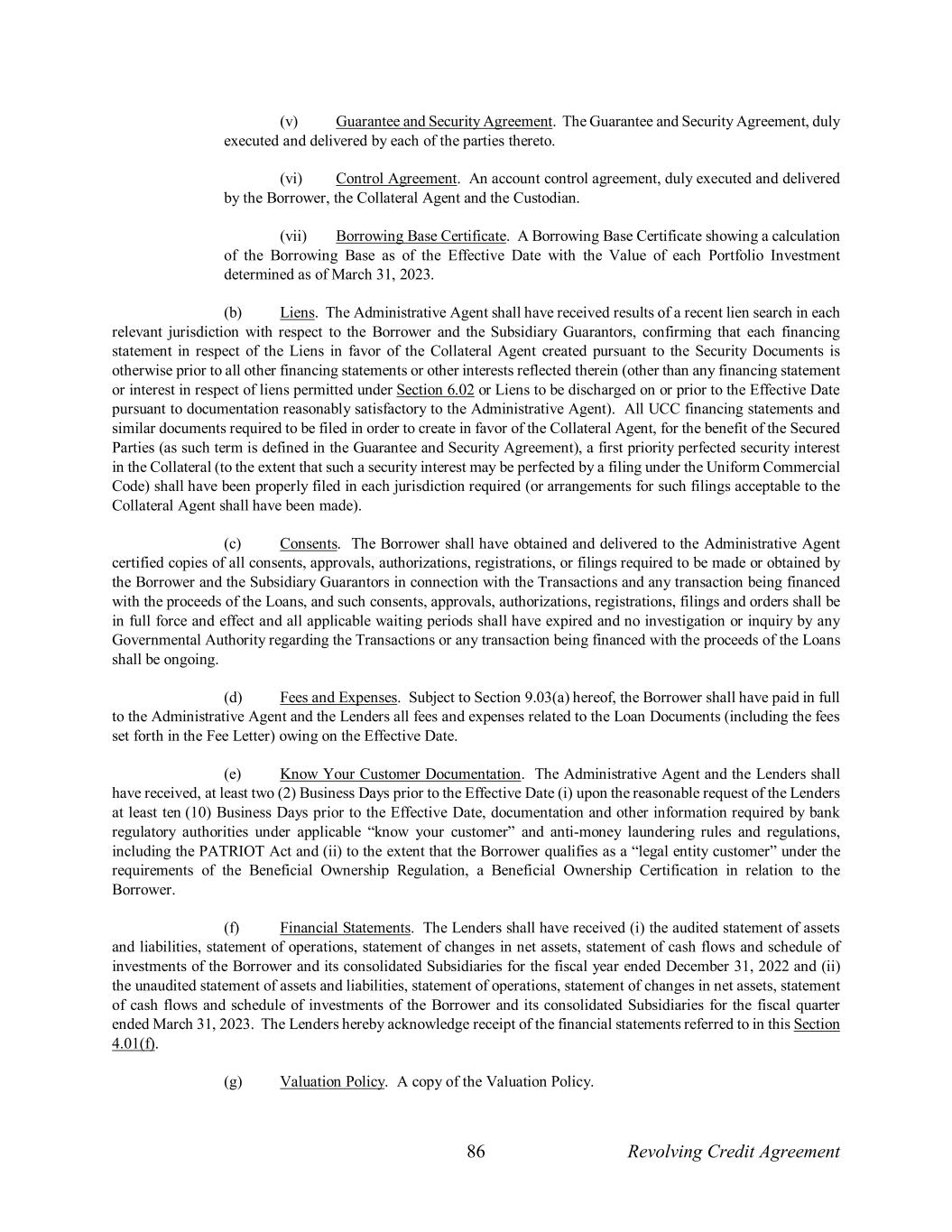 86 Revolving Credit Agreement (v) Guarantee and Security Agreement. The Guarantee and Security Agreement, duly executed and delivered by each of the parties thereto. (vi) Control Agreement. An account control agreement, duly executed and delivered by the Borrower, the Collateral Agent and the Custodian. (vii) Borrowing Base Certificate. A Borrowing Base Certificate showing a calculation of the Borrowing Base as of the Effective Date with the Value of each Portfolio Investment determined as of March 31, 2023. (b) Liens. The Administrative Agent shall have received results of a recent lien search in each relevant jurisdiction with respect to the Borrower and the Subsidiary Guarantors, confirming that each financing statement in respect of the Liens in favor of the Collateral Agent created pursuant to the Security Documents is otherwise prior to all other financing statements or other interests reflected therein (other than any financing statement or interest in respect of liens permitted under Section 6.02 or Liens to be discharged on or prior to the Effective Date pursuant to documentation reasonably satisfactory to the Administrative Agent). All UCC financing statements and similar documents required to be filed in order to create in favor of the Collateral Agent, for the benefit of the Secured Parties (as such term is defined in the Guarantee and Security Agreement), a first priority perfected security interest in the Collateral (to the extent that such a security interest may be perfected by a filing under the Uniform Commercial Code) shall have been properly filed in each jurisdiction required (or arrangements for such filings acceptable to the Collateral Agent shall have been made). (c) Consents. The Borrower shall have obtained and delivered to the Administrative Agent certified copies of all consents, approvals, authorizations, registrations, or filings required to be made or obtained by the Borrower and the Subsidiary Guarantors in connection with the Transactions and any transaction being financed with the proceeds of the Loans, and such consents, approvals, authorizations, registrations, filings and orders shall be in full force and effect and all applicable waiting periods shall have expired and no investigation or inquiry by any Governmental Authority regarding the Transactions or any transaction being financed with the proceeds of the Loans shall be ongoing. (d) Fees and Expenses. Subject to Section 9.03(a) hereof, the Borrower shall have paid in full to the Administrative Agent and the Lenders all fees and expenses related to the Loan Documents (including the fees set forth in the Fee Letter) owing on the Effective Date. (e) Know Your Customer Documentation. The Administrative Agent and the Lenders shall have received, at least two (2) Business Days prior to the Effective Date (i) upon the reasonable request of the Lenders at least ten (10) Business Days prior to the Effective Date, documentation and other information required by bank regulatory authorities under applicable “know your customer” and anti-money laundering rules and regulations, including the PATRIOT Act and (ii) to the extent that the Borrower qualifies as a “legal entity customer” under the requirements of the Beneficial Ownership Regulation, a Beneficial Ownership Certification in relation to the Borrower. (f) Financial Statements. The Lenders shall have received (i) the audited statement of assets and liabilities, statement of operations, statement of changes in net assets, statement of cash flows and schedule of investments of the Borrower and its consolidated Subsidiaries for the fiscal year ended December 31, 2022 and (ii) the unaudited statement of assets and liabilities, statement of operations, statement of changes in net assets, statement of cash flows and schedule of investments of the Borrower and its consolidated Subsidiaries for the fiscal quarter ended March 31, 2023. The Lenders hereby acknowledge receipt of the financial statements referred to in this Section 4.01(f). (g) Valuation Policy. A copy of the Valuation Policy.