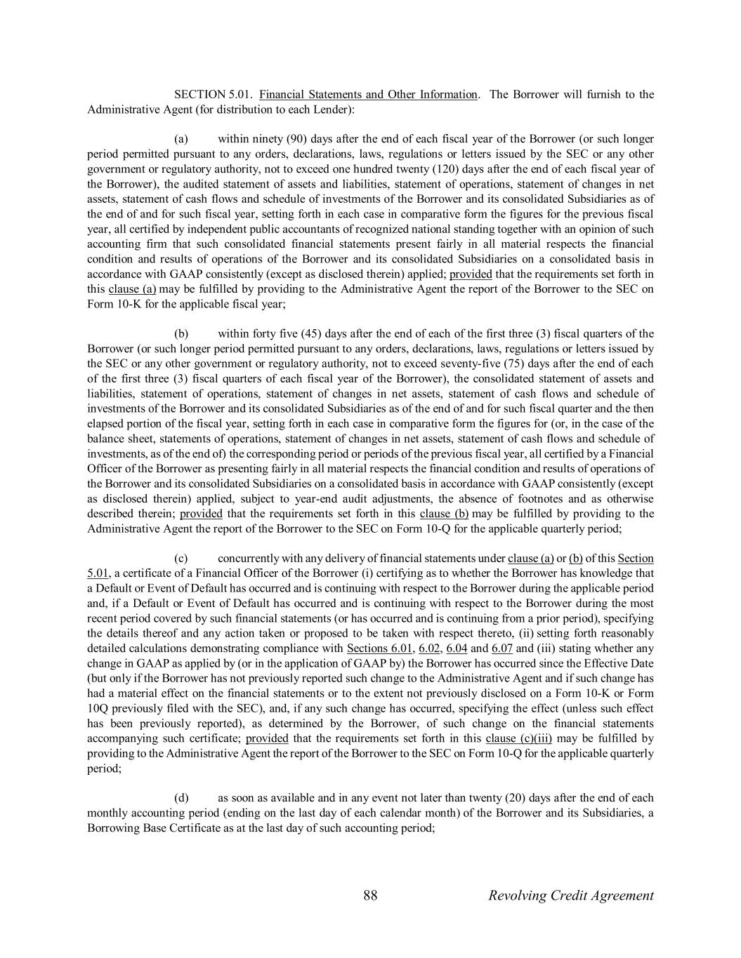 88 Revolving Credit Agreement SECTION 5.01. Financial Statements and Other Information. The Borrower will furnish to the Administrative Agent (for distribution to each Lender): (a) within ninety (90) days after the end of each fiscal year of the Borrower (or such longer period permitted pursuant to any orders, declarations, laws, regulations or letters issued by the SEC or any other government or regulatory authority, not to exceed one hundred twenty (120) days after the end of each fiscal year of the Borrower), the audited statement of assets and liabilities, statement of operations, statement of changes in net assets, statement of cash flows and schedule of investments of the Borrower and its consolidated Subsidiaries as of the end of and for such fiscal year, setting forth in each case in comparative form the figures for the previous fiscal year, all certified by independent public accountants of recognized national standing together with an opinion of such accounting firm that such consolidated financial statements present fairly in all material respects the financial condition and results of operations of the Borrower and its consolidated Subsidiaries on a consolidated basis in accordance with GAAP consistently (except as disclosed therein) applied; provided that the requirements set forth in this clause (a) may be fulfilled by providing to the Administrative Agent the report of the Borrower to the SEC on Form 10-K for the applicable fiscal year; (b) within forty five (45) days after the end of each of the first three (3) fiscal quarters of the Borrower (or such longer period permitted pursuant to any orders, declarations, laws, regulations or letters issued by the SEC or any other government or regulatory authority, not to exceed seventy-five (75) days after the end of each of the first three (3) fiscal quarters of each fiscal year of the Borrower), the consolidated statement of assets and liabilities, statement of operations, statement of changes in net assets, statement of cash flows and schedule of investments of the Borrower and its consolidated Subsidiaries as of the end of and for such fiscal quarter and the then elapsed portion of the fiscal year, setting forth in each case in comparative form the figures for (or, in the case of the balance sheet, statements of operations, statement of changes in net assets, statement of cash flows and schedule of investments, as of the end of) the corresponding period or periods of the previous fiscal year, all certified by a Financial Officer of the Borrower as presenting fairly in all material respects the financial condition and results of operations of the Borrower and its consolidated Subsidiaries on a consolidated basis in accordance with GAAP consistently (except as disclosed therein) applied, subject to year-end audit adjustments, the absence of footnotes and as otherwise described therein; provided that the requirements set forth in this clause (b) may be fulfilled by providing to the Administrative Agent the report of the Borrower to the SEC on Form 10-Q for the applicable quarterly period; (c) concurrently with any delivery of financial statements under clause (a) or (b) of this Section 5.01, a certificate of a Financial Officer of the Borrower (i) certifying as to whether the Borrower has knowledge that a Default or Event of Default has occurred and is continuing with respect to the Borrower during the applicable period and, if a Default or Event of Default has occurred and is continuing with respect to the Borrower during the most recent period covered by such financial statements (or has occurred and is continuing from a prior period), specifying the details thereof and any action taken or proposed to be taken with respect thereto, (ii) setting forth reasonably detailed calculations demonstrating compliance with Sections 6.01, 6.02, 6.04 and 6.07 and (iii) stating whether any change in GAAP as applied by (or in the application of GAAP by) the Borrower has occurred since the Effective Date (but only if the Borrower has not previously reported such change to the Administrative Agent and if such change has had a material effect on the financial statements or to the extent not previously disclosed on a Form 10-K or Form 10Q previously filed with the SEC), and, if any such change has occurred, specifying the effect (unless such effect has been previously reported), as determined by the Borrower, of such change on the financial statements accompanying such certificate; provided that the requirements set forth in this clause (c)(iii) may be fulfilled by providing to the Administrative Agent the report of the Borrower to the SEC on Form 10-Q for the applicable quarterly period; (d) as soon as available and in any event not later than twenty (20) days after the end of each monthly accounting period (ending on the last day of each calendar month) of the Borrower and its Subsidiaries, a Borrowing Base Certificate as at the last day of such accounting period;