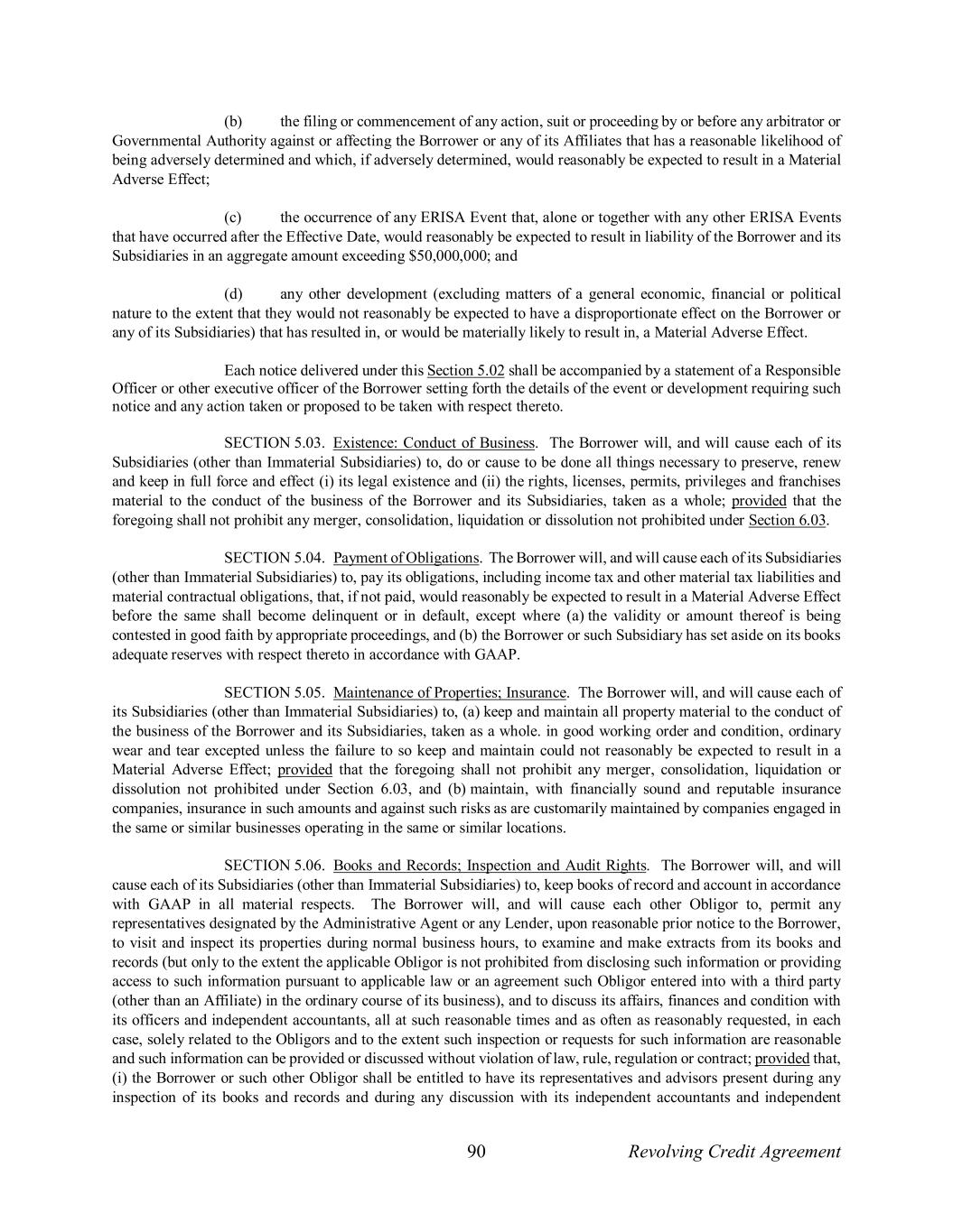 90 Revolving Credit Agreement (b) the filing or commencement of any action, suit or proceeding by or before any arbitrator or Governmental Authority against or affecting the Borrower or any of its Affiliates that has a reasonable likelihood of being adversely determined and which, if adversely determined, would reasonably be expected to result in a Material Adverse Effect; (c) the occurrence of any ERISA Event that, alone or together with any other ERISA Events that have occurred after the Effective Date, would reasonably be expected to result in liability of the Borrower and its Subsidiaries in an aggregate amount exceeding $50,000,000; and (d) any other development (excluding matters of a general economic, financial or political nature to the extent that they would not reasonably be expected to have a disproportionate effect on the Borrower or any of its Subsidiaries) that has resulted in, or would be materially likely to result in, a Material Adverse Effect. Each notice delivered under this Section 5.02 shall be accompanied by a statement of a Responsible Officer or other executive officer of the Borrower setting forth the details of the event or development requiring such notice and any action taken or proposed to be taken with respect thereto. SECTION 5.03. Existence: Conduct of Business. The Borrower will, and will cause each of its Subsidiaries (other than Immaterial Subsidiaries) to, do or cause to be done all things necessary to preserve, renew and keep in full force and effect (i) its legal existence and (ii) the rights, licenses, permits, privileges and franchises material to the conduct of the business of the Borrower and its Subsidiaries, taken as a whole; provided that the foregoing shall not prohibit any merger, consolidation, liquidation or dissolution not prohibited under Section 6.03. SECTION 5.04. Payment of Obligations. The Borrower will, and will cause each of its Subsidiaries (other than Immaterial Subsidiaries) to, pay its obligations, including income tax and other material tax liabilities and material contractual obligations, that, if not paid, would reasonably be expected to result in a Material Adverse Effect before the same shall become delinquent or in default, except where (a) the validity or amount thereof is being contested in good faith by appropriate proceedings, and (b) the Borrower or such Subsidiary has set aside on its books adequate reserves with respect thereto in accordance with GAAP. SECTION 5.05. Maintenance of Properties; Insurance. The Borrower will, and will cause each of its Subsidiaries (other than Immaterial Subsidiaries) to, (a) keep and maintain all property material to the conduct of the business of the Borrower and its Subsidiaries, taken as a whole. in good working order and condition, ordinary wear and tear excepted unless the failure to so keep and maintain could not reasonably be expected to result in a Material Adverse Effect; provided that the foregoing shall not prohibit any merger, consolidation, liquidation or dissolution not prohibited under Section 6.03, and (b) maintain, with financially sound and reputable insurance companies, insurance in such amounts and against such risks as are customarily maintained by companies engaged in the same or similar businesses operating in the same or similar locations. SECTION 5.06. Books and Records; Inspection and Audit Rights. The Borrower will, and will cause each of its Subsidiaries (other than Immaterial Subsidiaries) to, keep books of record and account in accordance with GAAP in all material respects. The Borrower will, and will cause each other Obligor to, permit any representatives designated by the Administrative Agent or any Lender, upon reasonable prior notice to the Borrower, to visit and inspect its properties during normal business hours, to examine and make extracts from its books and records (but only to the extent the applicable Obligor is not prohibited from disclosing such information or providing access to such information pursuant to applicable law or an agreement such Obligor entered into with a third party (other than an Affiliate) in the ordinary course of its business), and to discuss its affairs, finances and condition with its officers and independent accountants, all at such reasonable times and as often as reasonably requested, in each case, solely related to the Obligors and to the extent such inspection or requests for such information are reasonable and such information can be provided or discussed without violation of law, rule, regulation or contract; provided that, (i) the Borrower or such other Obligor shall be entitled to have its representatives and advisors present during any inspection of its books and records and during any discussion with its independent accountants and independent
