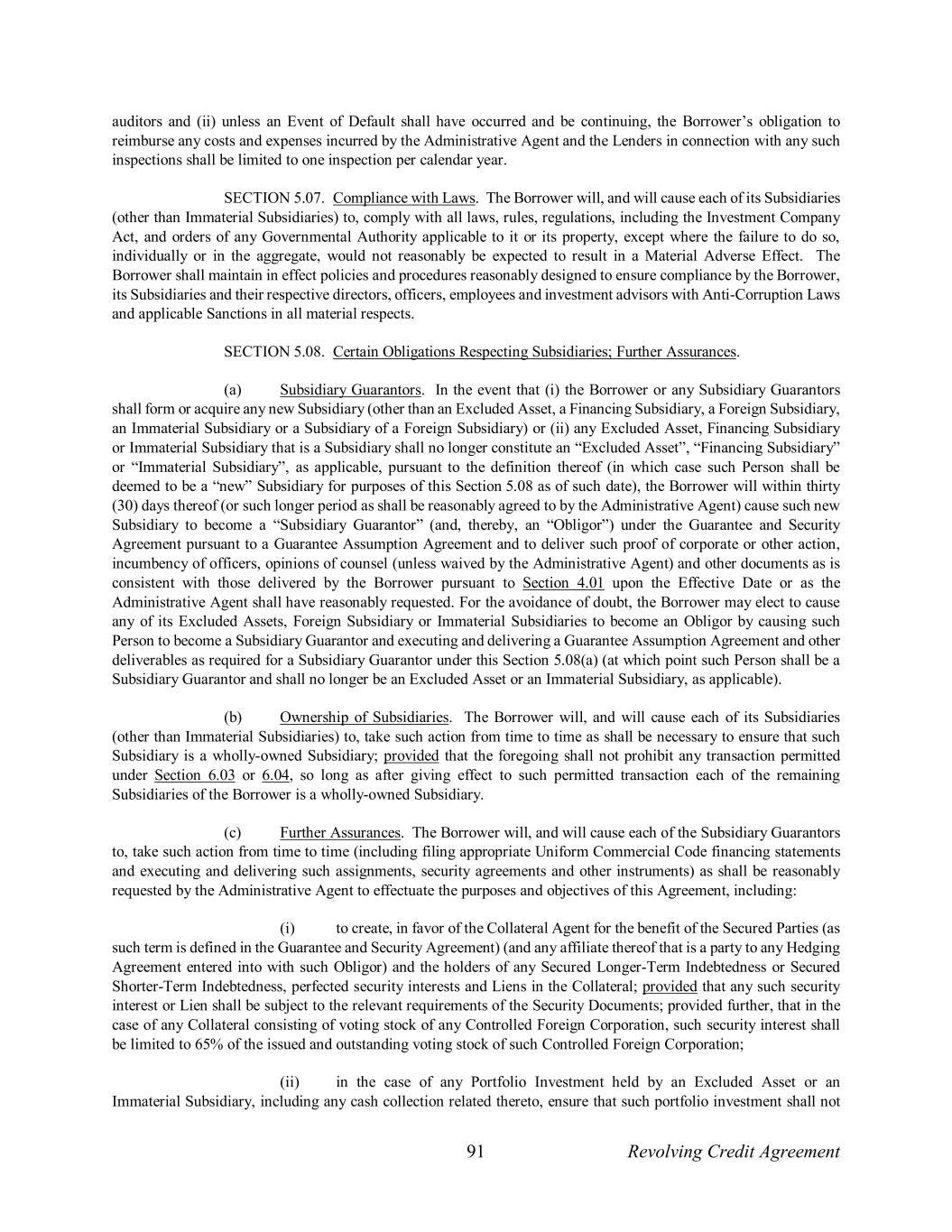 91 Revolving Credit Agreement auditors and (ii) unless an Event of Default shall have occurred and be continuing, the Borrower’s obligation to reimburse any costs and expenses incurred by the Administrative Agent and the Lenders in connection with any such inspections shall be limited to one inspection per calendar year. SECTION 5.07. Compliance with Laws. The Borrower will, and will cause each of its Subsidiaries (other than Immaterial Subsidiaries) to, comply with all laws, rules, regulations, including the Investment Company Act, and orders of any Governmental Authority applicable to it or its property, except where the failure to do so, individually or in the aggregate, would not reasonably be expected to result in a Material Adverse Effect. The Borrower shall maintain in effect policies and procedures reasonably designed to ensure compliance by the Borrower, its Subsidiaries and their respective directors, officers, employees and investment advisors with Anti-Corruption Laws and applicable Sanctions in all material respects. SECTION 5.08. Certain Obligations Respecting Subsidiaries; Further Assurances. (a) Subsidiary Guarantors. In the event that (i) the Borrower or any Subsidiary Guarantors shall form or acquire any new Subsidiary (other than an Excluded Asset, a Financing Subsidiary, a Foreign Subsidiary, an Immaterial Subsidiary or a Subsidiary of a Foreign Subsidiary) or (ii) any Excluded Asset, Financing Subsidiary or Immaterial Subsidiary that is a Subsidiary shall no longer constitute an “Excluded Asset”, “Financing Subsidiary” or “Immaterial Subsidiary”, as applicable, pursuant to the definition thereof (in which case such Person shall be deemed to be a “new” Subsidiary for purposes of this Section 5.08 as of such date), the Borrower will within thirty (30) days thereof (or such longer period as shall be reasonably agreed to by the Administrative Agent) cause such new Subsidiary to become a “Subsidiary Guarantor” (and, thereby, an “Obligor”) under the Guarantee and Security Agreement pursuant to a Guarantee Assumption Agreement and to deliver such proof of corporate or other action, incumbency of officers, opinions of counsel (unless waived by the Administrative Agent) and other documents as is consistent with those delivered by the Borrower pursuant to Section 4.01 upon the Effective Date or as the Administrative Agent shall have reasonably requested. For the avoidance of doubt, the Borrower may elect to cause any of its Excluded Assets, Foreign Subsidiary or Immaterial Subsidiaries to become an Obligor by causing such Person to become a Subsidiary Guarantor and executing and delivering a Guarantee Assumption Agreement and other deliverables as required for a Subsidiary Guarantor under this Section 5.08(a) (at which point such Person shall be a Subsidiary Guarantor and shall no longer be an Excluded Asset or an Immaterial Subsidiary, as applicable). (b) Ownership of Subsidiaries. The Borrower will, and will cause each of its Subsidiaries (other than Immaterial Subsidiaries) to, take such action from time to time as shall be necessary to ensure that such Subsidiary is a wholly-owned Subsidiary; provided that the foregoing shall not prohibit any transaction permitted under Section 6.03 or 6.04, so long as after giving effect to such permitted transaction each of the remaining Subsidiaries of the Borrower is a wholly-owned Subsidiary. (c) Further Assurances. The Borrower will, and will cause each of the Subsidiary Guarantors to, take such action from time to time (including filing appropriate Uniform Commercial Code financing statements and executing and delivering such assignments, security agreements and other instruments) as shall be reasonably requested by the Administrative Agent to effectuate the purposes and objectives of this Agreement, including: (i) to create, in favor of the Collateral Agent for the benefit of the Secured Parties (as such term is defined in the Guarantee and Security Agreement) (and any affiliate thereof that is a party to any Hedging Agreement entered into with such Obligor) and the holders of any Secured Longer-Term Indebtedness or Secured Shorter-Term Indebtedness, perfected security interests and Liens in the Collateral; provided that any such security interest or Lien shall be subject to the relevant requirements of the Security Documents; provided further, that in the case of any Collateral consisting of voting stock of any Controlled Foreign Corporation, such security interest shall be limited to 65% of the issued and outstanding voting stock of such Controlled Foreign Corporation; (ii) in the case of any Portfolio Investment held by an Excluded Asset or an Immaterial Subsidiary, including any cash collection related thereto, ensure that such portfolio investment shall not