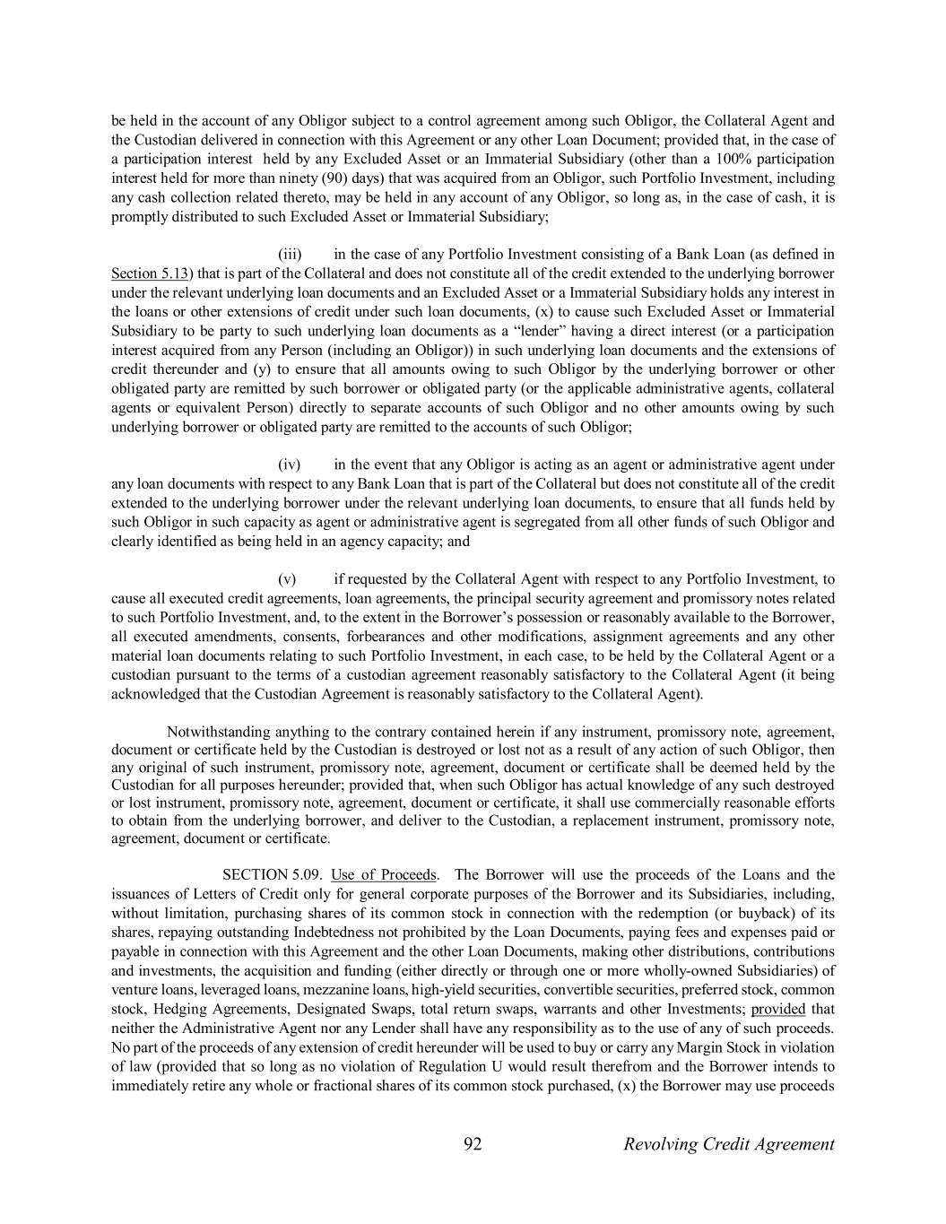92 Revolving Credit Agreement be held in the account of any Obligor subject to a control agreement among such Obligor, the Collateral Agent and the Custodian delivered in connection with this Agreement or any other Loan Document; provided that, in the case of a participation interest held by any Excluded Asset or an Immaterial Subsidiary (other than a 100% participation interest held for more than ninety (90) days) that was acquired from an Obligor, such Portfolio Investment, including any cash collection related thereto, may be held in any account of any Obligor, so long as, in the case of cash, it is promptly distributed to such Excluded Asset or Immaterial Subsidiary; (iii) in the case of any Portfolio Investment consisting of a Bank Loan (as defined in Section 5.13) that is part of the Collateral and does not constitute all of the credit extended to the underlying borrower under the relevant underlying loan documents and an Excluded Asset or a Immaterial Subsidiary holds any interest in the loans or other extensions of credit under such loan documents, (x) to cause such Excluded Asset or Immaterial Subsidiary to be party to such underlying loan documents as a “lender” having a direct interest (or a participation interest acquired from any Person (including an Obligor)) in such underlying loan documents and the extensions of credit thereunder and (y) to ensure that all amounts owing to such Obligor by the underlying borrower or other obligated party are remitted by such borrower or obligated party (or the applicable administrative agents, collateral agents or equivalent Person) directly to separate accounts of such Obligor and no other amounts owing by such underlying borrower or obligated party are remitted to the accounts of such Obligor; (iv) in the event that any Obligor is acting as an agent or administrative agent under any loan documents with respect to any Bank Loan that is part of the Collateral but does not constitute all of the credit extended to the underlying borrower under the relevant underlying loan documents, to ensure that all funds held by such Obligor in such capacity as agent or administrative agent is segregated from all other funds of such Obligor and clearly identified as being held in an agency capacity; and (v) if requested by the Collateral Agent with respect to any Portfolio Investment, to cause all executed credit agreements, loan agreements, the principal security agreement and promissory notes related to such Portfolio Investment, and, to the extent in the Borrower’s possession or reasonably available to the Borrower, all executed amendments, consents, forbearances and other modifications, assignment agreements and any other material loan documents relating to such Portfolio Investment, in each case, to be held by the Collateral Agent or a custodian pursuant to the terms of a custodian agreement reasonably satisfactory to the Collateral Agent (it being acknowledged that the Custodian Agreement is reasonably satisfactory to the Collateral Agent). Notwithstanding anything to the contrary contained herein if any instrument, promissory note, agreement, document or certificate held by the Custodian is destroyed or lost not as a result of any action of such Obligor, then any original of such instrument, promissory note, agreement, document or certificate shall be deemed held by the Custodian for all purposes hereunder; provided that, when such Obligor has actual knowledge of any such destroyed or lost instrument, promissory note, agreement, document or certificate, it shall use commercially reasonable efforts to obtain from the underlying borrower, and deliver to the Custodian, a replacement instrument, promissory note, agreement, document or certificate. SECTION 5.09. Use of Proceeds. The Borrower will use the proceeds of the Loans and the issuances of Letters of Credit only for general corporate purposes of the Borrower and its Subsidiaries, including, without limitation, purchasing shares of its common stock in connection with the redemption (or buyback) of its shares, repaying outstanding Indebtedness not prohibited by the Loan Documents, paying fees and expenses paid or payable in connection with this Agreement and the other Loan Documents, making other distributions, contributions and investments, the acquisition and funding (either directly or through one or more wholly-owned Subsidiaries) of venture loans, leveraged loans, mezzanine loans, high-yield securities, convertible securities, preferred stock, common stock, Hedging Agreements, Designated Swaps, total return swaps, warrants and other Investments; provided that neither the Administrative Agent nor any Lender shall have any responsibility as to the use of any of such proceeds. No part of the proceeds of any extension of credit hereunder will be used to buy or carry any Margin Stock in violation of law (provided that so long as no violation of Regulation U would result therefrom and the Borrower intends to immediately retire any whole or fractional shares of its common stock purchased, (x) the Borrower may use proceeds