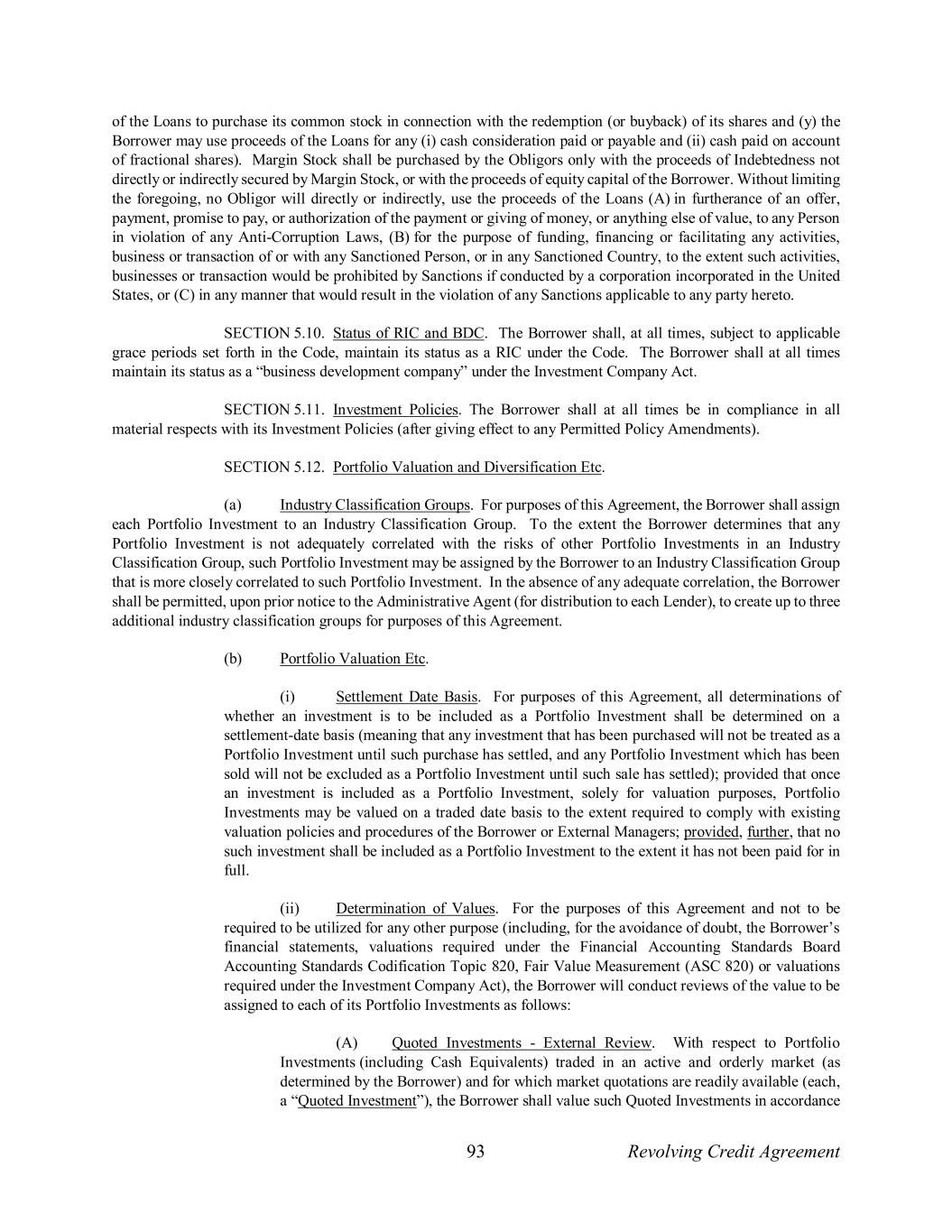 93 Revolving Credit Agreement of the Loans to purchase its common stock in connection with the redemption (or buyback) of its shares and (y) the Borrower may use proceeds of the Loans for any (i) cash consideration paid or payable and (ii) cash paid on account of fractional shares). Margin Stock shall be purchased by the Obligors only with the proceeds of Indebtedness not directly or indirectly secured by Margin Stock, or with the proceeds of equity capital of the Borrower. Without limiting the foregoing, no Obligor will directly or indirectly, use the proceeds of the Loans (A) in furtherance of an offer, payment, promise to pay, or authorization of the payment or giving of money, or anything else of value, to any Person in violation of any Anti-Corruption Laws, (B) for the purpose of funding, financing or facilitating any activities, business or transaction of or with any Sanctioned Person, or in any Sanctioned Country, to the extent such activities, businesses or transaction would be prohibited by Sanctions if conducted by a corporation incorporated in the United States, or (C) in any manner that would result in the violation of any Sanctions applicable to any party hereto. SECTION 5.10. Status of RIC and BDC. The Borrower shall, at all times, subject to applicable grace periods set forth in the Code, maintain its status as a RIC under the Code. The Borrower shall at all times maintain its status as a “business development company” under the Investment Company Act. SECTION 5.11. Investment Policies. The Borrower shall at all times be in compliance in all material respects with its Investment Policies (after giving effect to any Permitted Policy Amendments). SECTION 5.12. Portfolio Valuation and Diversification Etc. (a) Industry Classification Groups. For purposes of this Agreement, the Borrower shall assign each Portfolio Investment to an Industry Classification Group. To the extent the Borrower determines that any Portfolio Investment is not adequately correlated with the risks of other Portfolio Investments in an Industry Classification Group, such Portfolio Investment may be assigned by the Borrower to an Industry Classification Group that is more closely correlated to such Portfolio Investment. In the absence of any adequate correlation, the Borrower shall be permitted, upon prior notice to the Administrative Agent (for distribution to each Lender), to create up to three additional industry classification groups for purposes of this Agreement. (b) Portfolio Valuation Etc. (i) Settlement Date Basis. For purposes of this Agreement, all determinations of whether an investment is to be included as a Portfolio Investment shall be determined on a settlement-date basis (meaning that any investment that has been purchased will not be treated as a Portfolio Investment until such purchase has settled, and any Portfolio Investment which has been sold will not be excluded as a Portfolio Investment until such sale has settled); provided that once an investment is included as a Portfolio Investment, solely for valuation purposes, Portfolio Investments may be valued on a traded date basis to the extent required to comply with existing valuation policies and procedures of the Borrower or External Managers; provided, further, that no such investment shall be included as a Portfolio Investment to the extent it has not been paid for in full. (ii) Determination of Values. For the purposes of this Agreement and not to be required to be utilized for any other purpose (including, for the avoidance of doubt, the Borrower’s financial statements, valuations required under the Financial Accounting Standards Board Accounting Standards Codification Topic 820, Fair Value Measurement (ASC 820) or valuations required under the Investment Company Act), the Borrower will conduct reviews of the value to be assigned to each of its Portfolio Investments as follows: (A) Quoted Investments - External Review. With respect to Portfolio Investments (including Cash Equivalents) traded in an active and orderly market (as determined by the Borrower) and for which market quotations are readily available (each, a “Quoted Investment”), the Borrower shall value such Quoted Investments in accordance