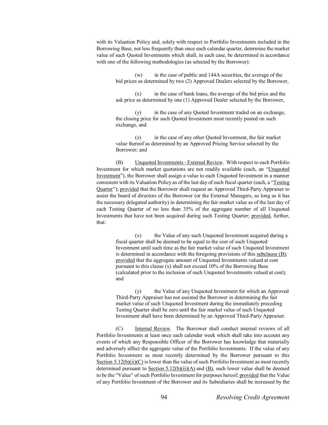 94 Revolving Credit Agreement with its Valuation Policy and, solely with respect to Portfolio Investments included in the Borrowing Base, not less frequently than once each calendar quarter, determine the market value of such Quoted Investments which shall, in each case, be determined in accordance with one of the following methodologies (as selected by the Borrower): (w) in the case of public and 144A securities, the average of the bid prices as determined by two (2) Approved Dealers selected by the Borrower, (x) in the case of bank loans, the average of the bid price and the ask price as determined by one (1) Approved Dealer selected by the Borrower, (y) in the case of any Quoted Investment traded on an exchange, the closing price for such Quoted Investment most recently posted on such exchange, and (z) in the case of any other Quoted Investment, the fair market value thereof as determined by an Approved Pricing Service selected by the Borrower; and (B) Unquoted Investments - External Review. With respect to each Portfolio Investment for which market quotations are not readily available (each, an “Unquoted Investment”), the Borrower shall assign a value to each Unquoted Investment in a manner consistent with its Valuation Policy as of the last day of each fiscal quarter (each, a “Testing Quarter”); provided that the Borrower shall request an Approved Third-Party Appraiser to assist the board of directors of the Borrower (or the External Managers, so long as it has the necessary delegated authority) in determining the fair market value as of the last day of each Testing Quarter of no less than 35% of the aggregate number of all Unquoted Investments that have not been acquired during such Testing Quarter; provided, further, that: (x) the Value of any such Unquoted Investment acquired during a fiscal quarter shall be deemed to be equal to the cost of such Unquoted Investment until such time as the fair market value of such Unquoted Investment is determined in accordance with the foregoing provisions of this subclause (B); provided that the aggregate amount of Unquoted Investments valued at cost pursuant to this clause (x) shall not exceed 10% of the Borrowing Base (calculated prior to the inclusion of such Unquoted Investments valued at cost); and (y) the Value of any Unquoted Investment for which an Approved Third-Party Appraiser has not assisted the Borrower in determining the fair market value of such Unquoted Investment during the immediately preceding Testing Quarter shall be zero until the fair market value of such Unquoted Investment shall have been determined by an Approved Third-Party Appraiser. (C) Internal Review. The Borrower shall conduct internal reviews of all Portfolio Investments at least once each calendar week which shall take into account any events of which any Responsible Officer of the Borrower has knowledge that materially and adversely affect the aggregate value of the Portfolio Investments. If the value of any Portfolio Investment as most recently determined by the Borrower pursuant to this Section 5.12(b)(ii)(C) is lower than the value of such Portfolio Investment as most recently determined pursuant to Section 5.12(b)(ii)(A) and (B), such lower value shall be deemed to be the “Value” of such Portfolio Investment for purposes hereof; provided that the Value of any Portfolio Investment of the Borrower and its Subsidiaries shall be increased by the