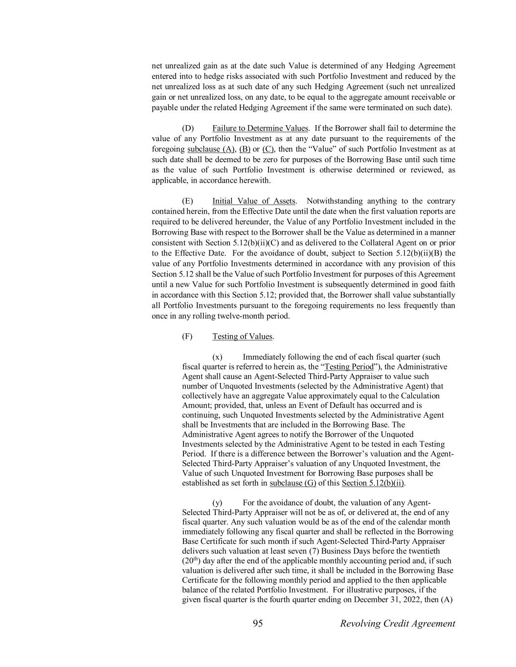 95 Revolving Credit Agreement net unrealized gain as at the date such Value is determined of any Hedging Agreement entered into to hedge risks associated with such Portfolio Investment and reduced by the net unrealized loss as at such date of any such Hedging Agreement (such net unrealized gain or net unrealized loss, on any date, to be equal to the aggregate amount receivable or payable under the related Hedging Agreement if the same were terminated on such date). (D) Failure to Determine Values. If the Borrower shall fail to determine the value of any Portfolio Investment as at any date pursuant to the requirements of the foregoing subclause (A), (B) or (C), then the “Value” of such Portfolio Investment as at such date shall be deemed to be zero for purposes of the Borrowing Base until such time as the value of such Portfolio Investment is otherwise determined or reviewed, as applicable, in accordance herewith. (E) Initial Value of Assets. Notwithstanding anything to the contrary contained herein, from the Effective Date until the date when the first valuation reports are required to be delivered hereunder, the Value of any Portfolio Investment included in the Borrowing Base with respect to the Borrower shall be the Value as determined in a manner consistent with Section 5.12(b)(ii)(C) and as delivered to the Collateral Agent on or prior to the Effective Date. For the avoidance of doubt, subject to Section 5.12(b)(ii)(B) the value of any Portfolio Investments determined in accordance with any provision of this Section 5.12 shall be the Value of such Portfolio Investment for purposes of this Agreement until a new Value for such Portfolio Investment is subsequently determined in good faith in accordance with this Section 5.12; provided that, the Borrower shall value substantially all Portfolio Investments pursuant to the foregoing requirements no less frequently than once in any rolling twelve-month period. (F) Testing of Values. (x) Immediately following the end of each fiscal quarter (such fiscal quarter is referred to herein as, the “Testing Period”), the Administrative Agent shall cause an Agent-Selected Third-Party Appraiser to value such number of Unquoted Investments (selected by the Administrative Agent) that collectively have an aggregate Value approximately equal to the Calculation Amount; provided, that, unless an Event of Default has occurred and is continuing, such Unquoted Investments selected by the Administrative Agent shall be Investments that are included in the Borrowing Base. The Administrative Agent agrees to notify the Borrower of the Unquoted Investments selected by the Administrative Agent to be tested in each Testing Period. If there is a difference between the Borrower’s valuation and the Agent- Selected Third-Party Appraiser’s valuation of any Unquoted Investment, the Value of such Unquoted Investment for Borrowing Base purposes shall be established as set forth in subclause (G) of this Section 5.12(b)(ii). (y) For the avoidance of doubt, the valuation of any Agent- Selected Third-Party Appraiser will not be as of, or delivered at, the end of any fiscal quarter. Any such valuation would be as of the end of the calendar month immediately following any fiscal quarter and shall be reflected in the Borrowing Base Certificate for such month if such Agent-Selected Third-Party Appraiser delivers such valuation at least seven (7) Business Days before the twentieth (20th) day after the end of the applicable monthly accounting period and, if such valuation is delivered after such time, it shall be included in the Borrowing Base Certificate for the following monthly period and applied to the then applicable balance of the related Portfolio Investment. For illustrative purposes, if the given fiscal quarter is the fourth quarter ending on December 31, 2022, then (A)
