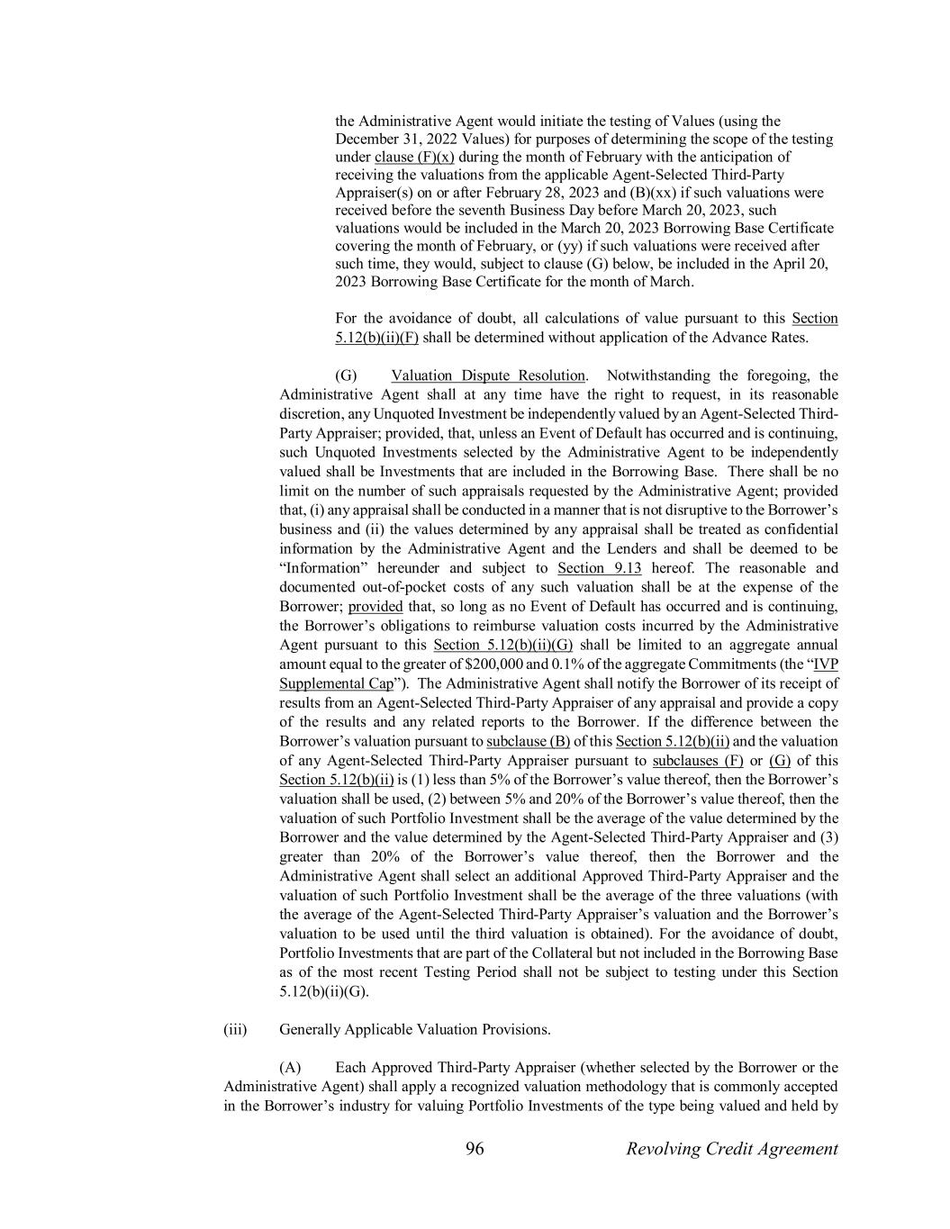 96 Revolving Credit Agreement the Administrative Agent would initiate the testing of Values (using the December 31, 2022 Values) for purposes of determining the scope of the testing under clause (F)(x) during the month of February with the anticipation of receiving the valuations from the applicable Agent-Selected Third-Party Appraiser(s) on or after February 28, 2023 and (B)(xx) if such valuations were received before the seventh Business Day before March 20, 2023, such valuations would be included in the March 20, 2023 Borrowing Base Certificate covering the month of February, or (yy) if such valuations were received after such time, they would, subject to clause (G) below, be included in the April 20, 2023 Borrowing Base Certificate for the month of March. For the avoidance of doubt, all calculations of value pursuant to this Section 5.12(b)(ii)(F) shall be determined without application of the Advance Rates. (G) Valuation Dispute Resolution. Notwithstanding the foregoing, the Administrative Agent shall at any time have the right to request, in its reasonable discretion, any Unquoted Investment be independently valued by an Agent-Selected Third- Party Appraiser; provided, that, unless an Event of Default has occurred and is continuing, such Unquoted Investments selected by the Administrative Agent to be independently valued shall be Investments that are included in the Borrowing Base. There shall be no limit on the number of such appraisals requested by the Administrative Agent; provided that, (i) any appraisal shall be conducted in a manner that is not disruptive to the Borrower’s business and (ii) the values determined by any appraisal shall be treated as confidential information by the Administrative Agent and the Lenders and shall be deemed to be “Information” hereunder and subject to Section 9.13 hereof. The reasonable and documented out-of-pocket costs of any such valuation shall be at the expense of the Borrower; provided that, so long as no Event of Default has occurred and is continuing, the Borrower’s obligations to reimburse valuation costs incurred by the Administrative Agent pursuant to this Section 5.12(b)(ii)(G) shall be limited to an aggregate annual amount equal to the greater of $200,000 and 0.1% of the aggregate Commitments (the “IVP Supplemental Cap”). The Administrative Agent shall notify the Borrower of its receipt of results from an Agent-Selected Third-Party Appraiser of any appraisal and provide a copy of the results and any related reports to the Borrower. If the difference between the Borrower’s valuation pursuant to subclause (B) of this Section 5.12(b)(ii) and the valuation of any Agent-Selected Third-Party Appraiser pursuant to subclauses (F) or (G) of this Section 5.12(b)(ii) is (1) less than 5% of the Borrower’s value thereof, then the Borrower’s valuation shall be used, (2) between 5% and 20% of the Borrower’s value thereof, then the valuation of such Portfolio Investment shall be the average of the value determined by the Borrower and the value determined by the Agent-Selected Third-Party Appraiser and (3) greater than 20% of the Borrower’s value thereof, then the Borrower and the Administrative Agent shall select an additional Approved Third-Party Appraiser and the valuation of such Portfolio Investment shall be the average of the three valuations (with the average of the Agent-Selected Third-Party Appraiser’s valuation and the Borrower’s valuation to be used until the third valuation is obtained). For the avoidance of doubt, Portfolio Investments that are part of the Collateral but not included in the Borrowing Base as of the most recent Testing Period shall not be subject to testing under this Section 5.12(b)(ii)(G). (iii) Generally Applicable Valuation Provisions. (A) Each Approved Third-Party Appraiser (whether selected by the Borrower or the Administrative Agent) shall apply a recognized valuation methodology that is commonly accepted in the Borrower’s industry for valuing Portfolio Investments of the type being valued and held by
