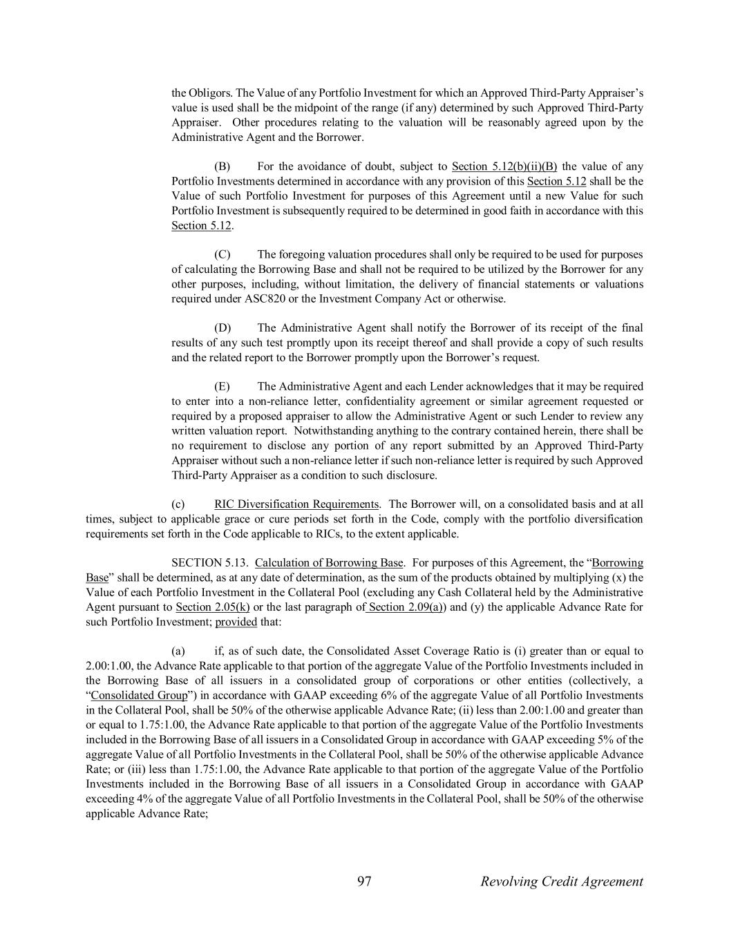 97 Revolving Credit Agreement the Obligors. The Value of any Portfolio Investment for which an Approved Third-Party Appraiser’s value is used shall be the midpoint of the range (if any) determined by such Approved Third-Party Appraiser. Other procedures relating to the valuation will be reasonably agreed upon by the Administrative Agent and the Borrower. (B) For the avoidance of doubt, subject to Section 5.12(b)(ii)(B) the value of any Portfolio Investments determined in accordance with any provision of this Section 5.12 shall be the Value of such Portfolio Investment for purposes of this Agreement until a new Value for such Portfolio Investment is subsequently required to be determined in good faith in accordance with this Section 5.12. (C) The foregoing valuation procedures shall only be required to be used for purposes of calculating the Borrowing Base and shall not be required to be utilized by the Borrower for any other purposes, including, without limitation, the delivery of financial statements or valuations required under ASC820 or the Investment Company Act or otherwise. (D) The Administrative Agent shall notify the Borrower of its receipt of the final results of any such test promptly upon its receipt thereof and shall provide a copy of such results and the related report to the Borrower promptly upon the Borrower’s request. (E) The Administrative Agent and each Lender acknowledges that it may be required to enter into a non-reliance letter, confidentiality agreement or similar agreement requested or required by a proposed appraiser to allow the Administrative Agent or such Lender to review any written valuation report. Notwithstanding anything to the contrary contained herein, there shall be no requirement to disclose any portion of any report submitted by an Approved Third-Party Appraiser without such a non-reliance letter if such non-reliance letter is required by such Approved Third-Party Appraiser as a condition to such disclosure. (c) RIC Diversification Requirements. The Borrower will, on a consolidated basis and at all times, subject to applicable grace or cure periods set forth in the Code, comply with the portfolio diversification requirements set forth in the Code applicable to RICs, to the extent applicable. SECTION 5.13. Calculation of Borrowing Base. For purposes of this Agreement, the “Borrowing Base” shall be determined, as at any date of determination, as the sum of the products obtained by multiplying (x) the Value of each Portfolio Investment in the Collateral Pool (excluding any Cash Collateral held by the Administrative Agent pursuant to Section 2.05(k) or the last paragraph of Section 2.09(a)) and (y) the applicable Advance Rate for such Portfolio Investment; provided that: (a) if, as of such date, the Consolidated Asset Coverage Ratio is (i) greater than or equal to 2.00:1.00, the Advance Rate applicable to that portion of the aggregate Value of the Portfolio Investments included in the Borrowing Base of all issuers in a consolidated group of corporations or other entities (collectively, a “Consolidated Group”) in accordance with GAAP exceeding 6% of the aggregate Value of all Portfolio Investments in the Collateral Pool, shall be 50% of the otherwise applicable Advance Rate; (ii) less than 2.00:1.00 and greater than or equal to 1.75:1.00, the Advance Rate applicable to that portion of the aggregate Value of the Portfolio Investments included in the Borrowing Base of all issuers in a Consolidated Group in accordance with GAAP exceeding 5% of the aggregate Value of all Portfolio Investments in the Collateral Pool, shall be 50% of the otherwise applicable Advance Rate; or (iii) less than 1.75:1.00, the Advance Rate applicable to that portion of the aggregate Value of the Portfolio Investments included in the Borrowing Base of all issuers in a Consolidated Group in accordance with GAAP exceeding 4% of the aggregate Value of all Portfolio Investments in the Collateral Pool, shall be 50% of the otherwise applicable Advance Rate;