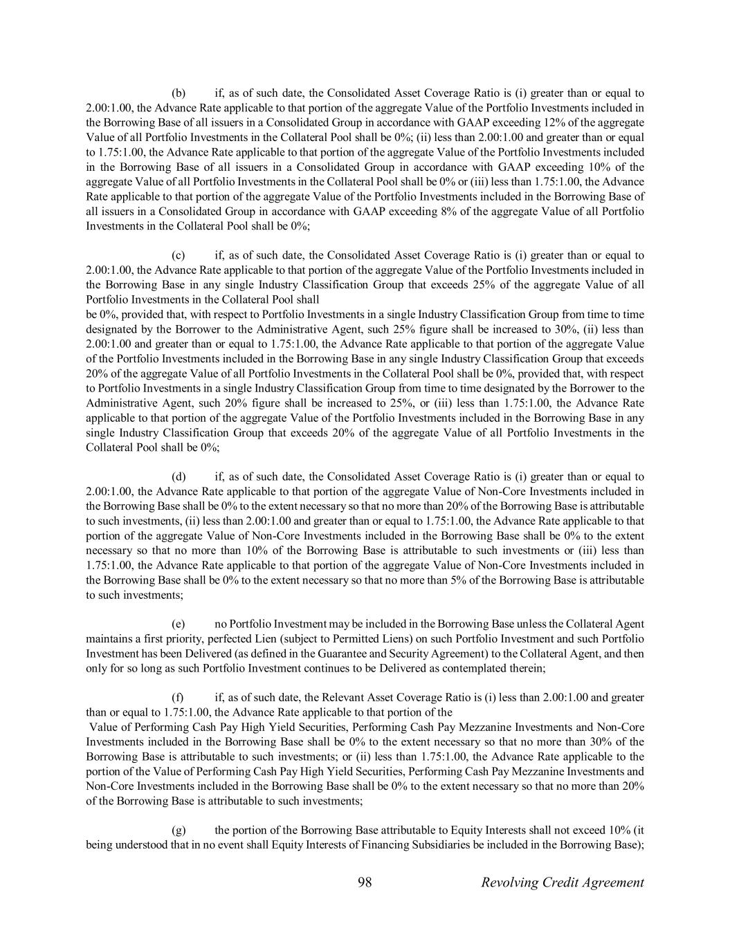 98 Revolving Credit Agreement (b) if, as of such date, the Consolidated Asset Coverage Ratio is (i) greater than or equal to 2.00:1.00, the Advance Rate applicable to that portion of the aggregate Value of the Portfolio Investments included in the Borrowing Base of all issuers in a Consolidated Group in accordance with GAAP exceeding 12% of the aggregate Value of all Portfolio Investments in the Collateral Pool shall be 0%; (ii) less than 2.00:1.00 and greater than or equal to 1.75:1.00, the Advance Rate applicable to that portion of the aggregate Value of the Portfolio Investments included in the Borrowing Base of all issuers in a Consolidated Group in accordance with GAAP exceeding 10% of the aggregate Value of all Portfolio Investments in the Collateral Pool shall be 0% or (iii) less than 1.75:1.00, the Advance Rate applicable to that portion of the aggregate Value of the Portfolio Investments included in the Borrowing Base of all issuers in a Consolidated Group in accordance with GAAP exceeding 8% of the aggregate Value of all Portfolio Investments in the Collateral Pool shall be 0%; (c) if, as of such date, the Consolidated Asset Coverage Ratio is (i) greater than or equal to 2.00:1.00, the Advance Rate applicable to that portion of the aggregate Value of the Portfolio Investments included in the Borrowing Base in any single Industry Classification Group that exceeds 25% of the aggregate Value of all Portfolio Investments in the Collateral Pool shall be 0%, provided that, with respect to Portfolio Investments in a single Industry Classification Group from time to time designated by the Borrower to the Administrative Agent, such 25% figure shall be increased to 30%, (ii) less than 2.00:1.00 and greater than or equal to 1.75:1.00, the Advance Rate applicable to that portion of the aggregate Value of the Portfolio Investments included in the Borrowing Base in any single Industry Classification Group that exceeds 20% of the aggregate Value of all Portfolio Investments in the Collateral Pool shall be 0%, provided that, with respect to Portfolio Investments in a single Industry Classification Group from time to time designated by the Borrower to the Administrative Agent, such 20% figure shall be increased to 25%, or (iii) less than 1.75:1.00, the Advance Rate applicable to that portion of the aggregate Value of the Portfolio Investments included in the Borrowing Base in any single Industry Classification Group that exceeds 20% of the aggregate Value of all Portfolio Investments in the Collateral Pool shall be 0%; (d) if, as of such date, the Consolidated Asset Coverage Ratio is (i) greater than or equal to 2.00:1.00, the Advance Rate applicable to that portion of the aggregate Value of Non-Core Investments included in the Borrowing Base shall be 0% to the extent necessary so that no more than 20% of the Borrowing Base is attributable to such investments, (ii) less than 2.00:1.00 and greater than or equal to 1.75:1.00, the Advance Rate applicable to that portion of the aggregate Value of Non-Core Investments included in the Borrowing Base shall be 0% to the extent necessary so that no more than 10% of the Borrowing Base is attributable to such investments or (iii) less than 1.75:1.00, the Advance Rate applicable to that portion of the aggregate Value of Non-Core Investments included in the Borrowing Base shall be 0% to the extent necessary so that no more than 5% of the Borrowing Base is attributable to such investments; (e) no Portfolio Investment may be included in the Borrowing Base unless the Collateral Agent maintains a first priority, perfected Lien (subject to Permitted Liens) on such Portfolio Investment and such Portfolio Investment has been Delivered (as defined in the Guarantee and Security Agreement) to the Collateral Agent, and then only for so long as such Portfolio Investment continues to be Delivered as contemplated therein; (f) if, as of such date, the Relevant Asset Coverage Ratio is (i) less than 2.00:1.00 and greater than or equal to 1.75:1.00, the Advance Rate applicable to that portion of the Value of Performing Cash Pay High Yield Securities, Performing Cash Pay Mezzanine Investments and Non-Core Investments included in the Borrowing Base shall be 0% to the extent necessary so that no more than 30% of the Borrowing Base is attributable to such investments; or (ii) less than 1.75:1.00, the Advance Rate applicable to the portion of the Value of Performing Cash Pay High Yield Securities, Performing Cash Pay Mezzanine Investments and Non-Core Investments included in the Borrowing Base shall be 0% to the extent necessary so that no more than 20% of the Borrowing Base is attributable to such investments; (g) the portion of the Borrowing Base attributable to Equity Interests shall not exceed 10% (it being understood that in no event shall Equity Interests of Financing Subsidiaries be included in the Borrowing Base);