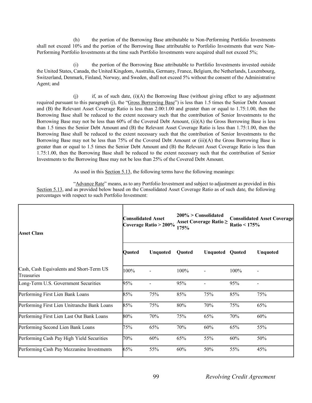 99 Revolving Credit Agreement (h) the portion of the Borrowing Base attributable to Non-Performing Portfolio Investments shall not exceed 10% and the portion of the Borrowing Base attributable to Portfolio Investments that were Non- Performing Portfolio Investments at the time such Portfolio Investments were acquired shall not exceed 5%; (i) the portion of the Borrowing Base attributable to Portfolio Investments invested outside the United States, Canada, the United Kingdom, Australia, Germany, France, Belgium, the Netherlands, Luxembourg, Switzerland, Denmark, Finland, Norway, and Sweden, shall not exceed 5% without the consent of the Administrative Agent; and (j) if, as of such date, (i)(A) the Borrowing Base (without giving effect to any adjustment required pursuant to this paragraph (j), the “Gross Borrowing Base”) is less than 1.5 times the Senior Debt Amount and (B) the Relevant Asset Coverage Ratio is less than 2.00:1.00 and greater than or equal to 1.75:1.00, then the Borrowing Base shall be reduced to the extent necessary such that the contribution of Senior Investments to the Borrowing Base may not be less than 60% of the Covered Debt Amount, (ii)(A) the Gross Borrowing Base is less than 1.5 times the Senior Debt Amount and (B) the Relevant Asset Coverage Ratio is less than 1.75:1.00, then the Borrowing Base shall be reduced to the extent necessary such that the contribution of Senior Investments to the Borrowing Base may not be less than 75% of the Covered Debt Amount or (iii)(A) the Gross Borrowing Base is greater than or equal to 1.5 times the Senior Debt Amount and (B) the Relevant Asset Coverage Ratio is less than 1.75:1.00, then the Borrowing Base shall be reduced to the extent necessary such that the contribution of Senior Investments to the Borrowing Base may not be less than 25% of the Covered Debt Amount. As used in this Section 5.13, the following terms have the following meanings: “Advance Rate” means, as to any Portfolio Investment and subject to adjustment as provided in this Section 5.13, and as provided below based on the Consolidated Asset Coverage Ratio as of such date, the following percentages with respect to such Portfolio Investment: Asset Class Consolidated Asset Coverage Ratio > 200% 200% > Consolidated Asset Coverage Ratio ≥ 175% Consolidated Asset Coverage Ratio < 175% Quoted Unquoted Quoted Unquoted Quoted Unquoted Cash, Cash Equivalents and Short-Term US Treasuries 100% - 100% - 100% - Long-Term U.S. Government Securities 95% - 95% - 95% - Performing First Lien Bank Loans 85% 75% 85% 75% 85% 75% Performing First Lien Unitranche Bank Loans 85% 75% 80% 70% 75% 65% Performing First Lien Last Out Bank Loans 80% 70% 75% 65% 70% 60% Performing Second Lien Bank Loans 75% 65% 70% 60% 65% 55% Performing Cash Pay High Yield Securities 70% 60% 65% 55% 60% 50% Performing Cash Pay Mezzanine Investments 65% 55% 60% 50% 55% 45%