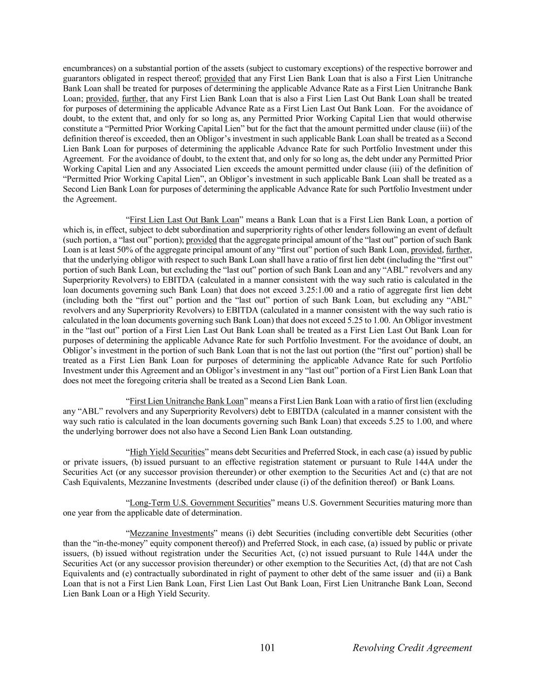 101 Revolving Credit Agreement encumbrances) on a substantial portion of the assets (subject to customary exceptions) of the respective borrower and guarantors obligated in respect thereof; provided that any First Lien Bank Loan that is also a First Lien Unitranche Bank Loan shall be treated for purposes of determining the applicable Advance Rate as a First Lien Unitranche Bank Loan; provided, further, that any First Lien Bank Loan that is also a First Lien Last Out Bank Loan shall be treated for purposes of determining the applicable Advance Rate as a First Lien Last Out Bank Loan. For the avoidance of doubt, to the extent that, and only for so long as, any Permitted Prior Working Capital Lien that would otherwise constitute a “Permitted Prior Working Capital Lien” but for the fact that the amount permitted under clause (iii) of the definition thereof is exceeded, then an Obligor’s investment in such applicable Bank Loan shall be treated as a Second Lien Bank Loan for purposes of determining the applicable Advance Rate for such Portfolio Investment under this Agreement. For the avoidance of doubt, to the extent that, and only for so long as, the debt under any Permitted Prior Working Capital Lien and any Associated Lien exceeds the amount permitted under clause (iii) of the definition of “Permitted Prior Working Capital Lien”, an Obligor’s investment in such applicable Bank Loan shall be treated as a Second Lien Bank Loan for purposes of determining the applicable Advance Rate for such Portfolio Investment under the Agreement. “First Lien Last Out Bank Loan” means a Bank Loan that is a First Lien Bank Loan, a portion of which is, in effect, subject to debt subordination and superpriority rights of other lenders following an event of default (such portion, a “last out” portion); provided that the aggregate principal amount of the “last out” portion of such Bank Loan is at least 50% of the aggregate principal amount of any “first out” portion of such Bank Loan, provided, further, that the underlying obligor with respect to such Bank Loan shall have a ratio of first lien debt (including the “first out” portion of such Bank Loan, but excluding the “last out” portion of such Bank Loan and any “ABL” revolvers and any Superpriority Revolvers) to EBITDA (calculated in a manner consistent with the way such ratio is calculated in the loan documents governing such Bank Loan) that does not exceed 3.25:1.00 and a ratio of aggregate first lien debt (including both the “first out” portion and the “last out” portion of such Bank Loan, but excluding any “ABL” revolvers and any Superpriority Revolvers) to EBITDA (calculated in a manner consistent with the way such ratio is calculated in the loan documents governing such Bank Loan) that does not exceed 5.25 to 1.00. An Obligor investment in the “last out” portion of a First Lien Last Out Bank Loan shall be treated as a First Lien Last Out Bank Loan for purposes of determining the applicable Advance Rate for such Portfolio Investment. For the avoidance of doubt, an Obligor’s investment in the portion of such Bank Loan that is not the last out portion (the “first out” portion) shall be treated as a First Lien Bank Loan for purposes of determining the applicable Advance Rate for such Portfolio Investment under this Agreement and an Obligor’s investment in any “last out” portion of a First Lien Bank Loan that does not meet the foregoing criteria shall be treated as a Second Lien Bank Loan. “First Lien Unitranche Bank Loan” means a First Lien Bank Loan with a ratio of first lien (excluding any “ABL” revolvers and any Superpriority Revolvers) debt to EBITDA (calculated in a manner consistent with the way such ratio is calculated in the loan documents governing such Bank Loan) that exceeds 5.25 to 1.00, and where the underlying borrower does not also have a Second Lien Bank Loan outstanding. “High Yield Securities” means debt Securities and Preferred Stock, in each case (a) issued by public or private issuers, (b) issued pursuant to an effective registration statement or pursuant to Rule 144A under the Securities Act (or any successor provision thereunder) or other exemption to the Securities Act and (c) that are not Cash Equivalents, Mezzanine Investments (described under clause (i) of the definition thereof) or Bank Loans. “Long-Term U.S. Government Securities” means U.S. Government Securities maturing more than one year from the applicable date of determination. “Mezzanine Investments” means (i) debt Securities (including convertible debt Securities (other than the “in-the-money” equity component thereof)) and Preferred Stock, in each case, (a) issued by public or private issuers, (b) issued without registration under the Securities Act, (c) not issued pursuant to Rule 144A under the Securities Act (or any successor provision thereunder) or other exemption to the Securities Act, (d) that are not Cash Equivalents and (e) contractually subordinated in right of payment to other debt of the same issuer and (ii) a Bank Loan that is not a First Lien Bank Loan, First Lien Last Out Bank Loan, First Lien Unitranche Bank Loan, Second Lien Bank Loan or a High Yield Security.