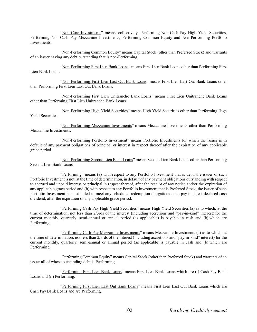 102 Revolving Credit Agreement “Non-Core Investments” means, collectively, Performing Non-Cash Pay High Yield Securities, Performing Non-Cash Pay Mezzanine Investments, Performing Common Equity and Non-Performing Portfolio Investments. “Non-Performing Common Equity” means Capital Stock (other than Preferred Stock) and warrants of an issuer having any debt outstanding that is non-Performing. “Non-Performing First Lien Bank Loans” means First Lien Bank Loans other than Performing First Lien Bank Loans. “Non-Performing First Lien Last Out Bank Loans” means First Lien Last Out Bank Loans other than Performing First Lien Last Out Bank Loans. “Non-Performing First Lien Unitranche Bank Loans” means First Lien Unitranche Bank Loans other than Performing First Lien Unitranche Bank Loans. “Non-Performing High Yield Securities” means High Yield Securities other than Performing High Yield Securities. “Non-Performing Mezzanine Investments” means Mezzanine Investments other than Performing Mezzanine Investments. “Non-Performing Portfolio Investment” means Portfolio Investments for which the issuer is in default of any payment obligations of principal or interest in respect thereof after the expiration of any applicable grace period. “Non-Performing Second Lien Bank Loans” means Second Lien Bank Loans other than Performing Second Lien Bank Loans. “Performing” means (a) with respect to any Portfolio Investment that is debt, the issuer of such Portfolio Investment is not, at the time of determination, in default of any payment obligations outstanding with respect to accrued and unpaid interest or principal in respect thereof, after the receipt of any notice and/or the expiration of any applicable grace period and (b) with respect to any Portfolio Investment that is Preferred Stock, the issuer of such Portfolio Investment has not failed to meet any scheduled redemption obligations or to pay its latest declared cash dividend, after the expiration of any applicable grace period. “Performing Cash Pay High Yield Securities” means High Yield Securities (a) as to which, at the time of determination, not less than 2/3rds of the interest (including accretions and “pay-in-kind” interest) for the current monthly, quarterly, semi-annual or annual period (as applicable) is payable in cash and (b) which are Performing. “Performing Cash Pay Mezzanine Investments” means Mezzanine Investments (a) as to which, at the time of determination, not less than 2/3rds of the interest (including accretions and “pay-in-kind” interest) for the current monthly, quarterly, semi-annual or annual period (as applicable) is payable in cash and (b) which are Performing. “Performing Common Equity” means Capital Stock (other than Preferred Stock) and warrants of an issuer all of whose outstanding debt is Performing. “Performing First Lien Bank Loans” means First Lien Bank Loans which are (i) Cash Pay Bank Loans and (ii) Performing. “Performing First Lien Last Out Bank Loans” means First Lien Last Out Bank Loans which are Cash Pay Bank Loans and are Performing.