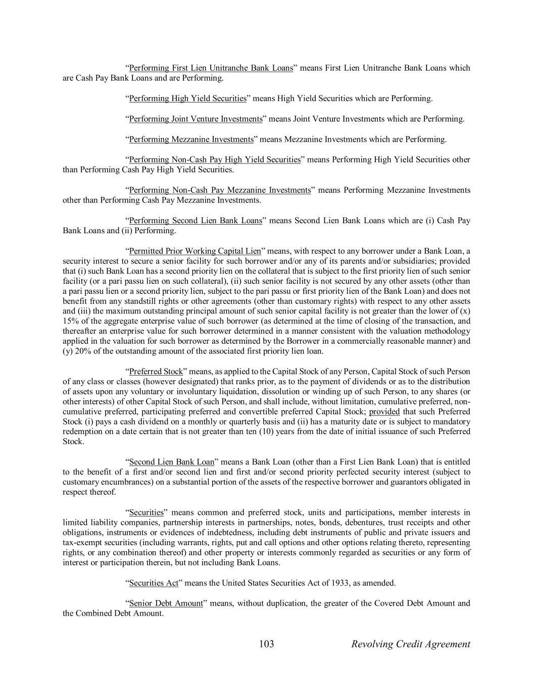103 Revolving Credit Agreement “Performing First Lien Unitranche Bank Loans” means First Lien Unitranche Bank Loans which are Cash Pay Bank Loans and are Performing. “Performing High Yield Securities” means High Yield Securities which are Performing. “Performing Joint Venture Investments” means Joint Venture Investments which are Performing. “Performing Mezzanine Investments” means Mezzanine Investments which are Performing. “Performing Non-Cash Pay High Yield Securities” means Performing High Yield Securities other than Performing Cash Pay High Yield Securities. “Performing Non-Cash Pay Mezzanine Investments” means Performing Mezzanine Investments other than Performing Cash Pay Mezzanine Investments. “Performing Second Lien Bank Loans” means Second Lien Bank Loans which are (i) Cash Pay Bank Loans and (ii) Performing. “Permitted Prior Working Capital Lien” means, with respect to any borrower under a Bank Loan, a security interest to secure a senior facility for such borrower and/or any of its parents and/or subsidiaries; provided that (i) such Bank Loan has a second priority lien on the collateral that is subject to the first priority lien of such senior facility (or a pari passu lien on such collateral), (ii) such senior facility is not secured by any other assets (other than a pari passu lien or a second priority lien, subject to the pari passu or first priority lien of the Bank Loan) and does not benefit from any standstill rights or other agreements (other than customary rights) with respect to any other assets and (iii) the maximum outstanding principal amount of such senior capital facility is not greater than the lower of (x) 15% of the aggregate enterprise value of such borrower (as determined at the time of closing of the transaction, and thereafter an enterprise value for such borrower determined in a manner consistent with the valuation methodology applied in the valuation for such borrower as determined by the Borrower in a commercially reasonable manner) and (y) 20% of the outstanding amount of the associated first priority lien loan. “Preferred Stock” means, as applied to the Capital Stock of any Person, Capital Stock of such Person of any class or classes (however designated) that ranks prior, as to the payment of dividends or as to the distribution of assets upon any voluntary or involuntary liquidation, dissolution or winding up of such Person, to any shares (or other interests) of other Capital Stock of such Person, and shall include, without limitation, cumulative preferred, non- cumulative preferred, participating preferred and convertible preferred Capital Stock; provided that such Preferred Stock (i) pays a cash dividend on a monthly or quarterly basis and (ii) has a maturity date or is subject to mandatory redemption on a date certain that is not greater than ten (10) years from the date of initial issuance of such Preferred Stock. “Second Lien Bank Loan” means a Bank Loan (other than a First Lien Bank Loan) that is entitled to the benefit of a first and/or second lien and first and/or second priority perfected security interest (subject to customary encumbrances) on a substantial portion of the assets of the respective borrower and guarantors obligated in respect thereof. “Securities” means common and preferred stock, units and participations, member interests in limited liability companies, partnership interests in partnerships, notes, bonds, debentures, trust receipts and other obligations, instruments or evidences of indebtedness, including debt instruments of public and private issuers and tax-exempt securities (including warrants, rights, put and call options and other options relating thereto, representing rights, or any combination thereof) and other property or interests commonly regarded as securities or any form of interest or participation therein, but not including Bank Loans. “Securities Act” means the United States Securities Act of 1933, as amended. “Senior Debt Amount” means, without duplication, the greater of the Covered Debt Amount and the Combined Debt Amount.