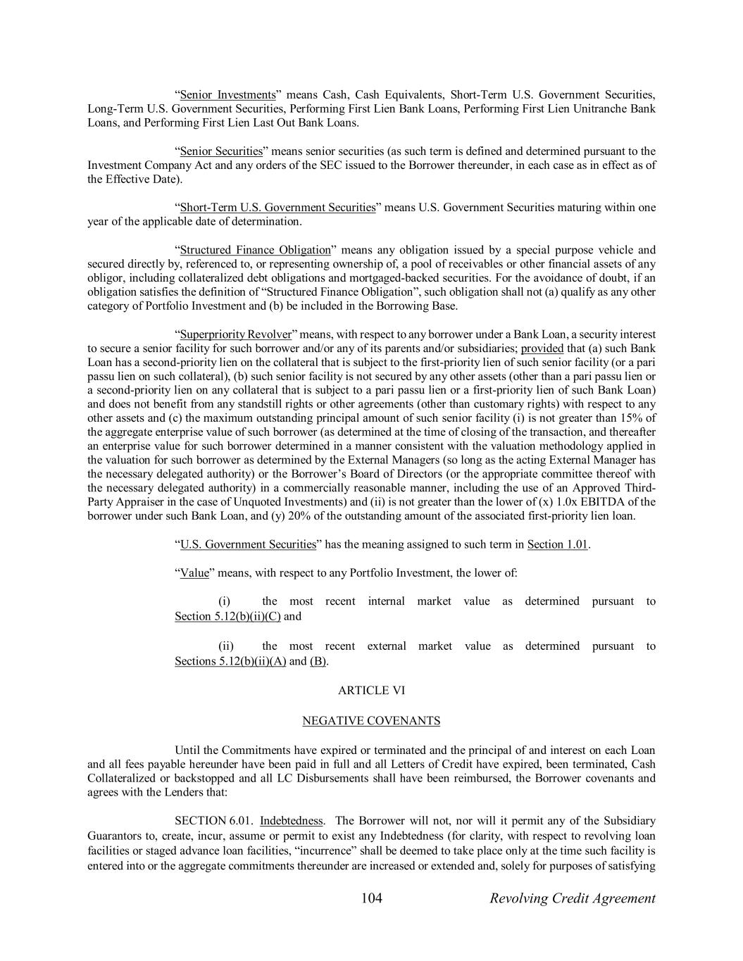 104 Revolving Credit Agreement “Senior Investments” means Cash, Cash Equivalents, Short-Term U.S. Government Securities, Long-Term U.S. Government Securities, Performing First Lien Bank Loans, Performing First Lien Unitranche Bank Loans, and Performing First Lien Last Out Bank Loans. “Senior Securities” means senior securities (as such term is defined and determined pursuant to the Investment Company Act and any orders of the SEC issued to the Borrower thereunder, in each case as in effect as of the Effective Date). “Short-Term U.S. Government Securities” means U.S. Government Securities maturing within one year of the applicable date of determination. “Structured Finance Obligation” means any obligation issued by a special purpose vehicle and secured directly by, referenced to, or representing ownership of, a pool of receivables or other financial assets of any obligor, including collateralized debt obligations and mortgaged-backed securities. For the avoidance of doubt, if an obligation satisfies the definition of “Structured Finance Obligation”, such obligation shall not (a) qualify as any other category of Portfolio Investment and (b) be included in the Borrowing Base. “Superpriority Revolver” means, with respect to any borrower under a Bank Loan, a security interest to secure a senior facility for such borrower and/or any of its parents and/or subsidiaries; provided that (a) such Bank Loan has a second-priority lien on the collateral that is subject to the first-priority lien of such senior facility (or a pari passu lien on such collateral), (b) such senior facility is not secured by any other assets (other than a pari passu lien or a second-priority lien on any collateral that is subject to a pari passu lien or a first-priority lien of such Bank Loan) and does not benefit from any standstill rights or other agreements (other than customary rights) with respect to any other assets and (c) the maximum outstanding principal amount of such senior facility (i) is not greater than 15% of the aggregate enterprise value of such borrower (as determined at the time of closing of the transaction, and thereafter an enterprise value for such borrower determined in a manner consistent with the valuation methodology applied in the valuation for such borrower as determined by the External Managers (so long as the acting External Manager has the necessary delegated authority) or the Borrower’s Board of Directors (or the appropriate committee thereof with the necessary delegated authority) in a commercially reasonable manner, including the use of an Approved Third- Party Appraiser in the case of Unquoted Investments) and (ii) is not greater than the lower of (x) 1.0x EBITDA of the borrower under such Bank Loan, and (y) 20% of the outstanding amount of the associated first-priority lien loan. “U.S. Government Securities” has the meaning assigned to such term in Section 1.01. “Value” means, with respect to any Portfolio Investment, the lower of: (i) the most recent internal market value as determined pursuant to Section 5.12(b)(ii)(C) and (ii) the most recent external market value as determined pursuant to Sections 5.12(b)(ii)(A) and (B). ARTICLE VI NEGATIVE COVENANTS Until the Commitments have expired or terminated and the principal of and interest on each Loan and all fees payable hereunder have been paid in full and all Letters of Credit have expired, been terminated, Cash Collateralized or backstopped and all LC Disbursements shall have been reimbursed, the Borrower covenants and agrees with the Lenders that: SECTION 6.01. Indebtedness. The Borrower will not, nor will it permit any of the Subsidiary Guarantors to, create, incur, assume or permit to exist any Indebtedness (for clarity, with respect to revolving loan facilities or staged advance loan facilities, “incurrence” shall be deemed to take place only at the time such facility is entered into or the aggregate commitments thereunder are increased or extended and, solely for purposes of satisfying