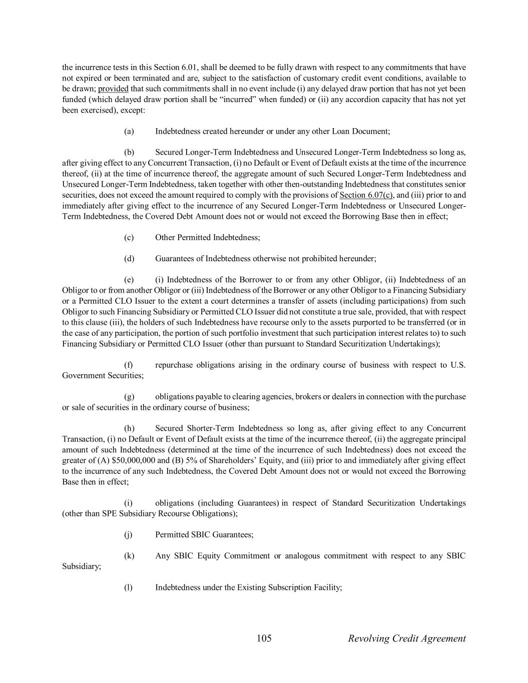 105 Revolving Credit Agreement the incurrence tests in this Section 6.01, shall be deemed to be fully drawn with respect to any commitments that have not expired or been terminated and are, subject to the satisfaction of customary credit event conditions, available to be drawn; provided that such commitments shall in no event include (i) any delayed draw portion that has not yet been funded (which delayed draw portion shall be “incurred” when funded) or (ii) any accordion capacity that has not yet been exercised), except: (a) Indebtedness created hereunder or under any other Loan Document; (b) Secured Longer-Term Indebtedness and Unsecured Longer-Term Indebtedness so long as, after giving effect to any Concurrent Transaction, (i) no Default or Event of Default exists at the time of the incurrence thereof, (ii) at the time of incurrence thereof, the aggregate amount of such Secured Longer-Term Indebtedness and Unsecured Longer-Term Indebtedness, taken together with other then-outstanding Indebtedness that constitutes senior securities, does not exceed the amount required to comply with the provisions of Section 6.07(c), and (iii) prior to and immediately after giving effect to the incurrence of any Secured Longer-Term Indebtedness or Unsecured Longer- Term Indebtedness, the Covered Debt Amount does not or would not exceed the Borrowing Base then in effect; (c) Other Permitted Indebtedness; (d) Guarantees of Indebtedness otherwise not prohibited hereunder; (e) (i) Indebtedness of the Borrower to or from any other Obligor, (ii) Indebtedness of an Obligor to or from another Obligor or (iii) Indebtedness of the Borrower or any other Obligor to a Financing Subsidiary or a Permitted CLO Issuer to the extent a court determines a transfer of assets (including participations) from such Obligor to such Financing Subsidiary or Permitted CLO Issuer did not constitute a true sale, provided, that with respect to this clause (iii), the holders of such Indebtedness have recourse only to the assets purported to be transferred (or in the case of any participation, the portion of such portfolio investment that such participation interest relates to) to such Financing Subsidiary or Permitted CLO Issuer (other than pursuant to Standard Securitization Undertakings); (f) repurchase obligations arising in the ordinary course of business with respect to U.S. Government Securities; (g) obligations payable to clearing agencies, brokers or dealers in connection with the purchase or sale of securities in the ordinary course of business; (h) Secured Shorter-Term Indebtedness so long as, after giving effect to any Concurrent Transaction, (i) no Default or Event of Default exists at the time of the incurrence thereof, (ii) the aggregate principal amount of such Indebtedness (determined at the time of the incurrence of such Indebtedness) does not exceed the greater of (A) $50,000,000 and (B) 5% of Shareholders’ Equity, and (iii) prior to and immediately after giving effect to the incurrence of any such Indebtedness, the Covered Debt Amount does not or would not exceed the Borrowing Base then in effect; (i) obligations (including Guarantees) in respect of Standard Securitization Undertakings (other than SPE Subsidiary Recourse Obligations); (j) Permitted SBIC Guarantees; (k) Any SBIC Equity Commitment or analogous commitment with respect to any SBIC Subsidiary; (l) Indebtedness under the Existing Subscription Facility;