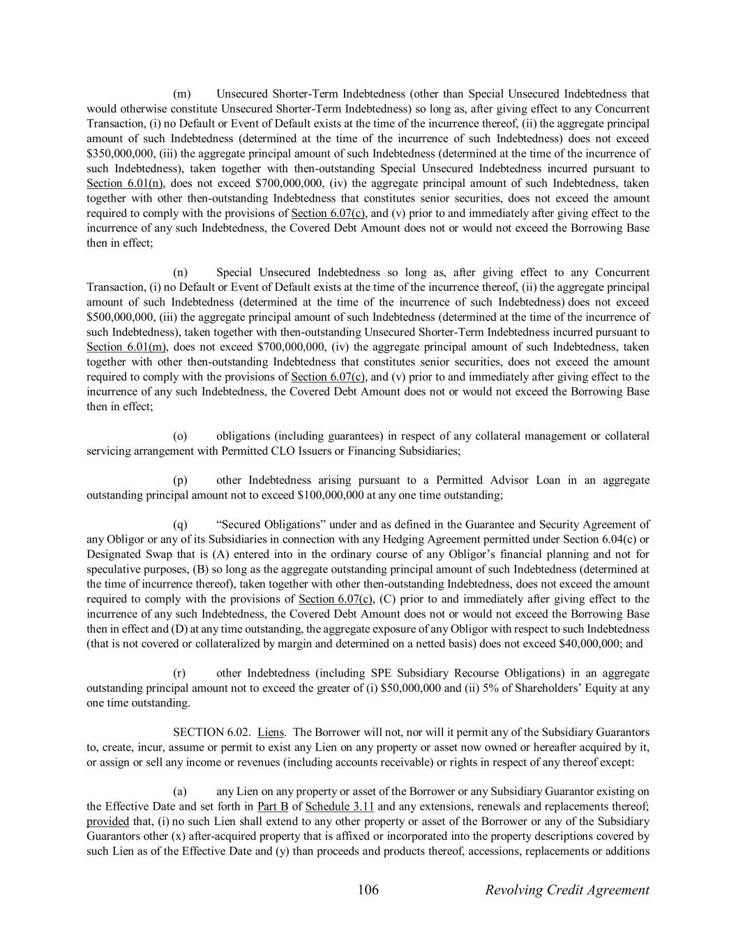 106 Revolving Credit Agreement (m) Unsecured Shorter-Term Indebtedness (other than Special Unsecured Indebtedness that would otherwise constitute Unsecured Shorter-Term Indebtedness) so long as, after giving effect to any Concurrent Transaction, (i) no Default or Event of Default exists at the time of the incurrence thereof, (ii) the aggregate principal amount of such Indebtedness (determined at the time of the incurrence of such Indebtedness) does not exceed $350,000,000, (iii) the aggregate principal amount of such Indebtedness (determined at the time of the incurrence of such Indebtedness), taken together with then-outstanding Special Unsecured Indebtedness incurred pursuant to Section 6.01(n), does not exceed $700,000,000, (iv) the aggregate principal amount of such Indebtedness, taken together with other then-outstanding Indebtedness that constitutes senior securities, does not exceed the amount required to comply with the provisions of Section 6.07(c), and (v) prior to and immediately after giving effect to the incurrence of any such Indebtedness, the Covered Debt Amount does not or would not exceed the Borrowing Base then in effect; (n) Special Unsecured Indebtedness so long as, after giving effect to any Concurrent Transaction, (i) no Default or Event of Default exists at the time of the incurrence thereof, (ii) the aggregate principal amount of such Indebtedness (determined at the time of the incurrence of such Indebtedness) does not exceed $500,000,000, (iii) the aggregate principal amount of such Indebtedness (determined at the time of the incurrence of such Indebtedness), taken together with then-outstanding Unsecured Shorter-Term Indebtedness incurred pursuant to Section 6.01(m), does not exceed $700,000,000, (iv) the aggregate principal amount of such Indebtedness, taken together with other then-outstanding Indebtedness that constitutes senior securities, does not exceed the amount required to comply with the provisions of Section 6.07(c), and (v) prior to and immediately after giving effect to the incurrence of any such Indebtedness, the Covered Debt Amount does not or would not exceed the Borrowing Base then in effect; (o) obligations (including guarantees) in respect of any collateral management or collateral servicing arrangement with Permitted CLO Issuers or Financing Subsidiaries; (p) other Indebtedness arising pursuant to a Permitted Advisor Loan in an aggregate outstanding principal amount not to exceed $100,000,000 at any one time outstanding; (q) “Secured Obligations” under and as defined in the Guarantee and Security Agreement of any Obligor or any of its Subsidiaries in connection with any Hedging Agreement permitted under Section 6.04(c) or Designated Swap that is (A) entered into in the ordinary course of any Obligor’s financial planning and not for speculative purposes, (B) so long as the aggregate outstanding principal amount of such Indebtedness (determined at the time of incurrence thereof), taken together with other then-outstanding Indebtedness, does not exceed the amount required to comply with the provisions of Section 6.07(c), (C) prior to and immediately after giving effect to the incurrence of any such Indebtedness, the Covered Debt Amount does not or would not exceed the Borrowing Base then in effect and (D) at any time outstanding, the aggregate exposure of any Obligor with respect to such Indebtedness (that is not covered or collateralized by margin and determined on a netted basis) does not exceed $40,000,000; and (r) other Indebtedness (including SPE Subsidiary Recourse Obligations) in an aggregate outstanding principal amount not to exceed the greater of (i) $50,000,000 and (ii) 5% of Shareholders’ Equity at any one time outstanding. SECTION 6.02. Liens. The Borrower will not, nor will it permit any of the Subsidiary Guarantors to, create, incur, assume or permit to exist any Lien on any property or asset now owned or hereafter acquired by it, or assign or sell any income or revenues (including accounts receivable) or rights in respect of any thereof except: (a) any Lien on any property or asset of the Borrower or any Subsidiary Guarantor existing on the Effective Date and set forth in Part B of Schedule 3.11 and any extensions, renewals and replacements thereof; provided that, (i) no such Lien shall extend to any other property or asset of the Borrower or any of the Subsidiary Guarantors other (x) after-acquired property that is affixed or incorporated into the property descriptions covered by such Lien as of the Effective Date and (y) than proceeds and products thereof, accessions, replacements or additions