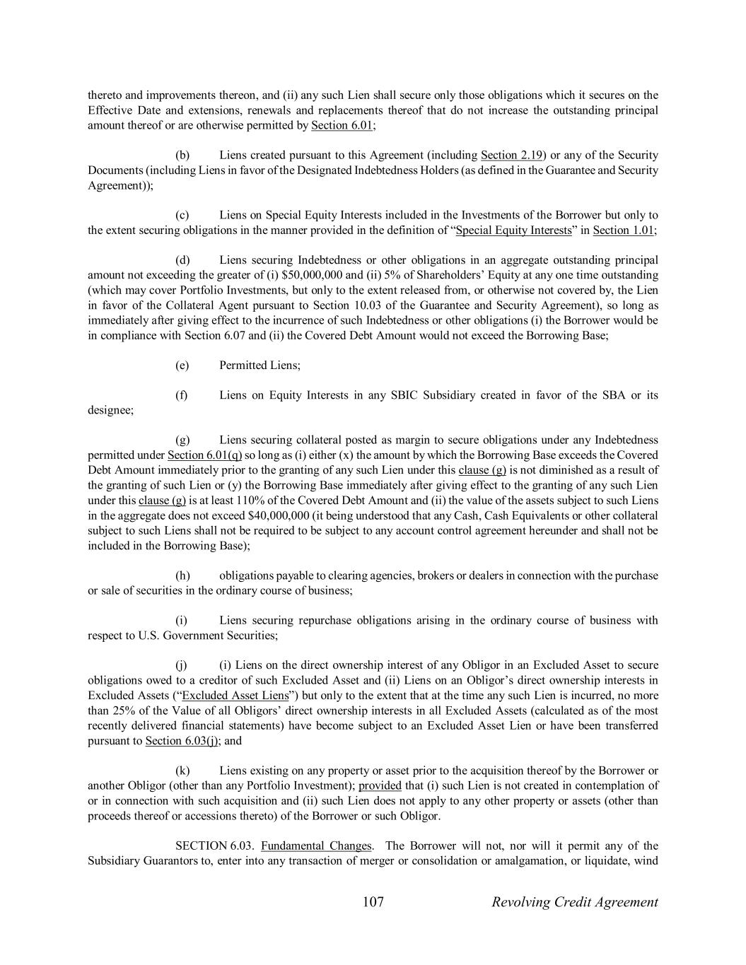 107 Revolving Credit Agreement thereto and improvements thereon, and (ii) any such Lien shall secure only those obligations which it secures on the Effective Date and extensions, renewals and replacements thereof that do not increase the outstanding principal amount thereof or are otherwise permitted by Section 6.01; (b) Liens created pursuant to this Agreement (including Section 2.19) or any of the Security Documents (including Liens in favor of the Designated Indebtedness Holders (as defined in the Guarantee and Security Agreement)); (c) Liens on Special Equity Interests included in the Investments of the Borrower but only to the extent securing obligations in the manner provided in the definition of “Special Equity Interests” in Section 1.01; (d) Liens securing Indebtedness or other obligations in an aggregate outstanding principal amount not exceeding the greater of (i) $50,000,000 and (ii) 5% of Shareholders’ Equity at any one time outstanding (which may cover Portfolio Investments, but only to the extent released from, or otherwise not covered by, the Lien in favor of the Collateral Agent pursuant to Section 10.03 of the Guarantee and Security Agreement), so long as immediately after giving effect to the incurrence of such Indebtedness or other obligations (i) the Borrower would be in compliance with Section 6.07 and (ii) the Covered Debt Amount would not exceed the Borrowing Base; (e) Permitted Liens; (f) Liens on Equity Interests in any SBIC Subsidiary created in favor of the SBA or its designee; (g) Liens securing collateral posted as margin to secure obligations under any Indebtedness permitted under Section 6.01(q) so long as (i) either (x) the amount by which the Borrowing Base exceeds the Covered Debt Amount immediately prior to the granting of any such Lien under this clause (g) is not diminished as a result of the granting of such Lien or (y) the Borrowing Base immediately after giving effect to the granting of any such Lien under this clause (g) is at least 110% of the Covered Debt Amount and (ii) the value of the assets subject to such Liens in the aggregate does not exceed $40,000,000 (it being understood that any Cash, Cash Equivalents or other collateral subject to such Liens shall not be required to be subject to any account control agreement hereunder and shall not be included in the Borrowing Base); (h) obligations payable to clearing agencies, brokers or dealers in connection with the purchase or sale of securities in the ordinary course of business; (i) Liens securing repurchase obligations arising in the ordinary course of business with respect to U.S. Government Securities; (j) (i) Liens on the direct ownership interest of any Obligor in an Excluded Asset to secure obligations owed to a creditor of such Excluded Asset and (ii) Liens on an Obligor’s direct ownership interests in Excluded Assets (“Excluded Asset Liens”) but only to the extent that at the time any such Lien is incurred, no more than 25% of the Value of all Obligors’ direct ownership interests in all Excluded Assets (calculated as of the most recently delivered financial statements) have become subject to an Excluded Asset Lien or have been transferred pursuant to Section 6.03(j); and (k) Liens existing on any property or asset prior to the acquisition thereof by the Borrower or another Obligor (other than any Portfolio Investment); provided that (i) such Lien is not created in contemplation of or in connection with such acquisition and (ii) such Lien does not apply to any other property or assets (other than proceeds thereof or accessions thereto) of the Borrower or such Obligor. SECTION 6.03. Fundamental Changes. The Borrower will not, nor will it permit any of the Subsidiary Guarantors to, enter into any transaction of merger or consolidation or amalgamation, or liquidate, wind