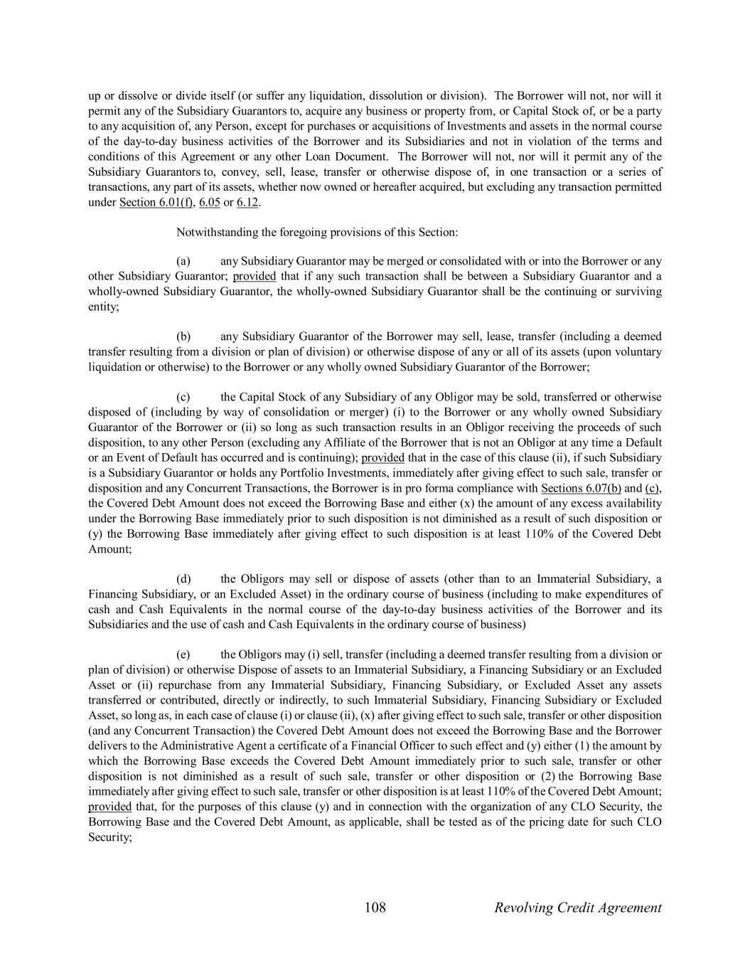 108 Revolving Credit Agreement up or dissolve or divide itself (or suffer any liquidation, dissolution or division). The Borrower will not, nor will it permit any of the Subsidiary Guarantors to, acquire any business or property from, or Capital Stock of, or be a party to any acquisition of, any Person, except for purchases or acquisitions of Investments and assets in the normal course of the day-to-day business activities of the Borrower and its Subsidiaries and not in violation of the terms and conditions of this Agreement or any other Loan Document. The Borrower will not, nor will it permit any of the Subsidiary Guarantors to, convey, sell, lease, transfer or otherwise dispose of, in one transaction or a series of transactions, any part of its assets, whether now owned or hereafter acquired, but excluding any transaction permitted under Section 6.01(f), 6.05 or 6.12. Notwithstanding the foregoing provisions of this Section: (a) any Subsidiary Guarantor may be merged or consolidated with or into the Borrower or any other Subsidiary Guarantor; provided that if any such transaction shall be between a Subsidiary Guarantor and a wholly-owned Subsidiary Guarantor, the wholly-owned Subsidiary Guarantor shall be the continuing or surviving entity; (b) any Subsidiary Guarantor of the Borrower may sell, lease, transfer (including a deemed transfer resulting from a division or plan of division) or otherwise dispose of any or all of its assets (upon voluntary liquidation or otherwise) to the Borrower or any wholly owned Subsidiary Guarantor of the Borrower; (c) the Capital Stock of any Subsidiary of any Obligor may be sold, transferred or otherwise disposed of (including by way of consolidation or merger) (i) to the Borrower or any wholly owned Subsidiary Guarantor of the Borrower or (ii) so long as such transaction results in an Obligor receiving the proceeds of such disposition, to any other Person (excluding any Affiliate of the Borrower that is not an Obligor at any time a Default or an Event of Default has occurred and is continuing); provided that in the case of this clause (ii), if such Subsidiary is a Subsidiary Guarantor or holds any Portfolio Investments, immediately after giving effect to such sale, transfer or disposition and any Concurrent Transactions, the Borrower is in pro forma compliance with Sections 6.07(b) and (c), the Covered Debt Amount does not exceed the Borrowing Base and either (x) the amount of any excess availability under the Borrowing Base immediately prior to such disposition is not diminished as a result of such disposition or (y) the Borrowing Base immediately after giving effect to such disposition is at least 110% of the Covered Debt Amount; (d) the Obligors may sell or dispose of assets (other than to an Immaterial Subsidiary, a Financing Subsidiary, or an Excluded Asset) in the ordinary course of business (including to make expenditures of cash and Cash Equivalents in the normal course of the day-to-day business activities of the Borrower and its Subsidiaries and the use of cash and Cash Equivalents in the ordinary course of business) (e) the Obligors may (i) sell, transfer (including a deemed transfer resulting from a division or plan of division) or otherwise Dispose of assets to an Immaterial Subsidiary, a Financing Subsidiary or an Excluded Asset or (ii) repurchase from any Immaterial Subsidiary, Financing Subsidiary, or Excluded Asset any assets transferred or contributed, directly or indirectly, to such Immaterial Subsidiary, Financing Subsidiary or Excluded Asset, so long as, in each case of clause (i) or clause (ii), (x) after giving effect to such sale, transfer or other disposition (and any Concurrent Transaction) the Covered Debt Amount does not exceed the Borrowing Base and the Borrower delivers to the Administrative Agent a certificate of a Financial Officer to such effect and (y) either (1) the amount by which the Borrowing Base exceeds the Covered Debt Amount immediately prior to such sale, transfer or other disposition is not diminished as a result of such sale, transfer or other disposition or (2) the Borrowing Base immediately after giving effect to such sale, transfer or other disposition is at least 110% of the Covered Debt Amount; provided that, for the purposes of this clause (y) and in connection with the organization of any CLO Security, the Borrowing Base and the Covered Debt Amount, as applicable, shall be tested as of the pricing date for such CLO Security;