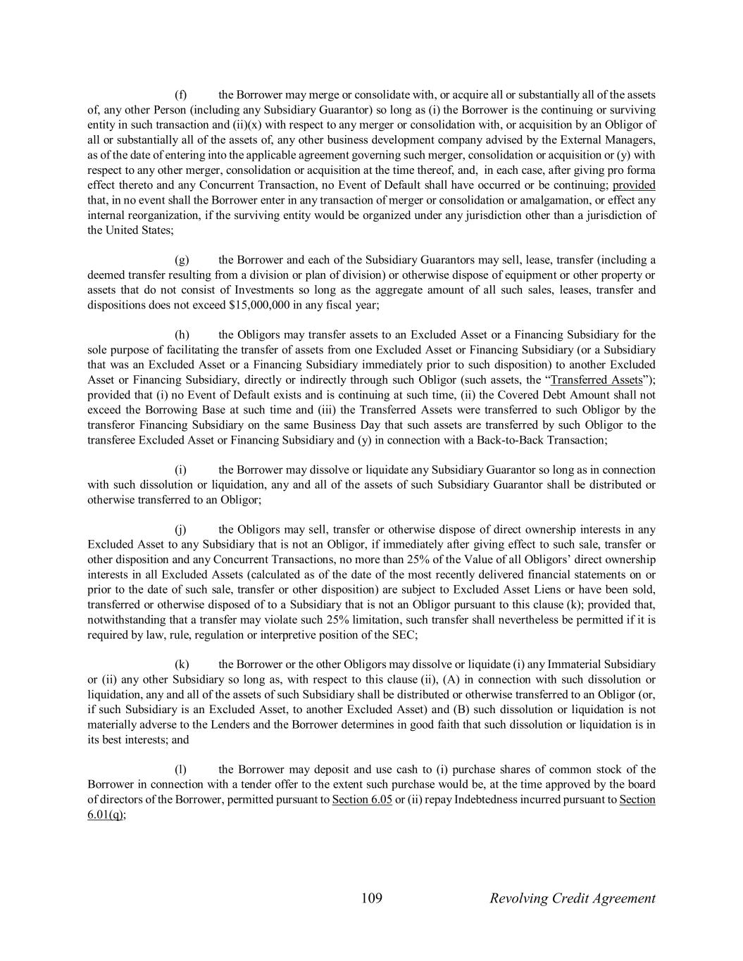 109 Revolving Credit Agreement (f) the Borrower may merge or consolidate with, or acquire all or substantially all of the assets of, any other Person (including any Subsidiary Guarantor) so long as (i) the Borrower is the continuing or surviving entity in such transaction and (ii)(x) with respect to any merger or consolidation with, or acquisition by an Obligor of all or substantially all of the assets of, any other business development company advised by the External Managers, as of the date of entering into the applicable agreement governing such merger, consolidation or acquisition or (y) with respect to any other merger, consolidation or acquisition at the time thereof, and, in each case, after giving pro forma effect thereto and any Concurrent Transaction, no Event of Default shall have occurred or be continuing; provided that, in no event shall the Borrower enter in any transaction of merger or consolidation or amalgamation, or effect any internal reorganization, if the surviving entity would be organized under any jurisdiction other than a jurisdiction of the United States; (g) the Borrower and each of the Subsidiary Guarantors may sell, lease, transfer (including a deemed transfer resulting from a division or plan of division) or otherwise dispose of equipment or other property or assets that do not consist of Investments so long as the aggregate amount of all such sales, leases, transfer and dispositions does not exceed $15,000,000 in any fiscal year; (h) the Obligors may transfer assets to an Excluded Asset or a Financing Subsidiary for the sole purpose of facilitating the transfer of assets from one Excluded Asset or Financing Subsidiary (or a Subsidiary that was an Excluded Asset or a Financing Subsidiary immediately prior to such disposition) to another Excluded Asset or Financing Subsidiary, directly or indirectly through such Obligor (such assets, the “Transferred Assets”); provided that (i) no Event of Default exists and is continuing at such time, (ii) the Covered Debt Amount shall not exceed the Borrowing Base at such time and (iii) the Transferred Assets were transferred to such Obligor by the transferor Financing Subsidiary on the same Business Day that such assets are transferred by such Obligor to the transferee Excluded Asset or Financing Subsidiary and (y) in connection with a Back-to-Back Transaction; (i) the Borrower may dissolve or liquidate any Subsidiary Guarantor so long as in connection with such dissolution or liquidation, any and all of the assets of such Subsidiary Guarantor shall be distributed or otherwise transferred to an Obligor; (j) the Obligors may sell, transfer or otherwise dispose of direct ownership interests in any Excluded Asset to any Subsidiary that is not an Obligor, if immediately after giving effect to such sale, transfer or other disposition and any Concurrent Transactions, no more than 25% of the Value of all Obligors’ direct ownership interests in all Excluded Assets (calculated as of the date of the most recently delivered financial statements on or prior to the date of such sale, transfer or other disposition) are subject to Excluded Asset Liens or have been sold, transferred or otherwise disposed of to a Subsidiary that is not an Obligor pursuant to this clause (k); provided that, notwithstanding that a transfer may violate such 25% limitation, such transfer shall nevertheless be permitted if it is required by law, rule, regulation or interpretive position of the SEC; (k) the Borrower or the other Obligors may dissolve or liquidate (i) any Immaterial Subsidiary or (ii) any other Subsidiary so long as, with respect to this clause (ii), (A) in connection with such dissolution or liquidation, any and all of the assets of such Subsidiary shall be distributed or otherwise transferred to an Obligor (or, if such Subsidiary is an Excluded Asset, to another Excluded Asset) and (B) such dissolution or liquidation is not materially adverse to the Lenders and the Borrower determines in good faith that such dissolution or liquidation is in its best interests; and (l) the Borrower may deposit and use cash to (i) purchase shares of common stock of the Borrower in connection with a tender offer to the extent such purchase would be, at the time approved by the board of directors of the Borrower, permitted pursuant to Section 6.05 or (ii) repay Indebtedness incurred pursuant to Section 6.01(q);