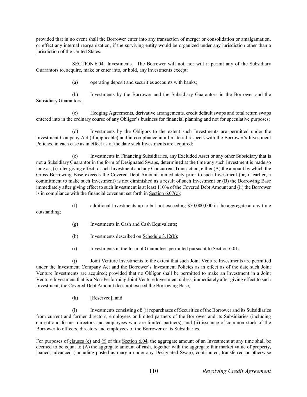 110 Revolving Credit Agreement provided that in no event shall the Borrower enter into any transaction of merger or consolidation or amalgamation, or effect any internal reorganization, if the surviving entity would be organized under any jurisdiction other than a jurisdiction of the United States. SECTION 6.04. Investments. The Borrower will not, nor will it permit any of the Subsidiary Guarantors to, acquire, make or enter into, or hold, any Investments except: (a) operating deposit and securities accounts with banks; (b) Investments by the Borrower and the Subsidiary Guarantors in the Borrower and the Subsidiary Guarantors; (c) Hedging Agreements, derivative arrangements, credit default swaps and total return swaps entered into in the ordinary course of any Obligor’s business for financial planning and not for speculative purposes; (d) Investments by the Obligors to the extent such Investments are permitted under the Investment Company Act (if applicable) and in compliance in all material respects with the Borrower’s Investment Policies, in each case as in effect as of the date such Investments are acquired; (e) Investments in Financing Subsidiaries, any Excluded Asset or any other Subsidiary that is not a Subsidiary Guarantor in the form of Designated Swaps, determined at the time any such Investment is made so long as, (i) after giving effect to such Investment and any Concurrent Transaction, either (A) the amount by which the Gross Borrowing Base exceeds the Covered Debt Amount immediately prior to such Investment (or, if earlier, a commitment to make such Investment) is not diminished as a result of such Investment or (B) the Borrowing Base immediately after giving effect to such Investment is at least 110% of the Covered Debt Amount and (ii) the Borrower is in compliance with the financial covenant set forth in Section 6.07(c); (f) additional Investments up to but not exceeding $50,000,000 in the aggregate at any time outstanding; (g) Investments in Cash and Cash Equivalents; (h) Investments described on Schedule 3.12(b); (i) Investments in the form of Guarantees permitted pursuant to Section 6.01; (j) Joint Venture Investments to the extent that such Joint Venture Investments are permitted under the Investment Company Act and the Borrower’s Investment Policies as in effect as of the date such Joint Venture Investments are acquired; provided that no Obligor shall be permitted to make an Investment in a Joint Venture Investment that is a Non-Performing Joint Venture Investment unless, immediately after giving effect to such Investment, the Covered Debt Amount does not exceed the Borrowing Base; (k) [Reserved]; and (l) Investments consisting of: (i) repurchases of Securities of the Borrower and its Subsidiaries from current and former directors, employees or limited partners of the Borrower and its Subsidiaries (including current and former directors and employees who are limited partners); and (ii) issuance of common stock of the Borrower to officers, directors and employees of the Borrower or its Subsidiaries. For purposes of clauses (e) and (f) of this Section 6.04, the aggregate amount of an Investment at any time shall be deemed to be equal to (A) the aggregate amount of cash, together with the aggregate fair market value of property, loaned, advanced (including posted as margin under any Designated Swap), contributed, transferred or otherwise