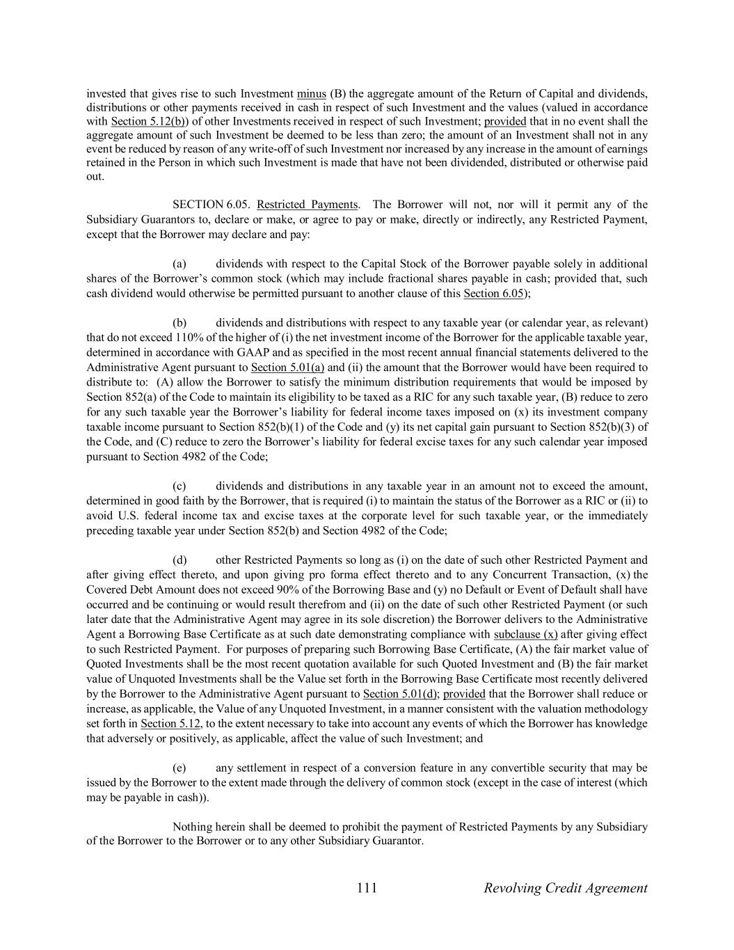 111 Revolving Credit Agreement invested that gives rise to such Investment minus (B) the aggregate amount of the Return of Capital and dividends, distributions or other payments received in cash in respect of such Investment and the values (valued in accordance with Section 5.12(b)) of other Investments received in respect of such Investment; provided that in no event shall the aggregate amount of such Investment be deemed to be less than zero; the amount of an Investment shall not in any event be reduced by reason of any write-off of such Investment nor increased by any increase in the amount of earnings retained in the Person in which such Investment is made that have not been dividended, distributed or otherwise paid out. SECTION 6.05. Restricted Payments. The Borrower will not, nor will it permit any of the Subsidiary Guarantors to, declare or make, or agree to pay or make, directly or indirectly, any Restricted Payment, except that the Borrower may declare and pay: (a) dividends with respect to the Capital Stock of the Borrower payable solely in additional shares of the Borrower’s common stock (which may include fractional shares payable in cash; provided that, such cash dividend would otherwise be permitted pursuant to another clause of this Section 6.05); (b) dividends and distributions with respect to any taxable year (or calendar year, as relevant) that do not exceed 110% of the higher of (i) the net investment income of the Borrower for the applicable taxable year, determined in accordance with GAAP and as specified in the most recent annual financial statements delivered to the Administrative Agent pursuant to Section 5.01(a) and (ii) the amount that the Borrower would have been required to distribute to: (A) allow the Borrower to satisfy the minimum distribution requirements that would be imposed by Section 852(a) of the Code to maintain its eligibility to be taxed as a RIC for any such taxable year, (B) reduce to zero for any such taxable year the Borrower’s liability for federal income taxes imposed on (x) its investment company taxable income pursuant to Section 852(b)(1) of the Code and (y) its net capital gain pursuant to Section 852(b)(3) of the Code, and (C) reduce to zero the Borrower’s liability for federal excise taxes for any such calendar year imposed pursuant to Section 4982 of the Code; (c) dividends and distributions in any taxable year in an amount not to exceed the amount, determined in good faith by the Borrower, that is required (i) to maintain the status of the Borrower as a RIC or (ii) to avoid U.S. federal income tax and excise taxes at the corporate level for such taxable year, or the immediately preceding taxable year under Section 852(b) and Section 4982 of the Code; (d) other Restricted Payments so long as (i) on the date of such other Restricted Payment and after giving effect thereto, and upon giving pro forma effect thereto and to any Concurrent Transaction, (x) the Covered Debt Amount does not exceed 90% of the Borrowing Base and (y) no Default or Event of Default shall have occurred and be continuing or would result therefrom and (ii) on the date of such other Restricted Payment (or such later date that the Administrative Agent may agree in its sole discretion) the Borrower delivers to the Administrative Agent a Borrowing Base Certificate as at such date demonstrating compliance with subclause (x) after giving effect to such Restricted Payment. For purposes of preparing such Borrowing Base Certificate, (A) the fair market value of Quoted Investments shall be the most recent quotation available for such Quoted Investment and (B) the fair market value of Unquoted Investments shall be the Value set forth in the Borrowing Base Certificate most recently delivered by the Borrower to the Administrative Agent pursuant to Section 5.01(d); provided that the Borrower shall reduce or increase, as applicable, the Value of any Unquoted Investment, in a manner consistent with the valuation methodology set forth in Section 5.12, to the extent necessary to take into account any events of which the Borrower has knowledge that adversely or positively, as applicable, affect the value of such Investment; and (e) any settlement in respect of a conversion feature in any convertible security that may be issued by the Borrower to the extent made through the delivery of common stock (except in the case of interest (which may be payable in cash)). Nothing herein shall be deemed to prohibit the payment of Restricted Payments by any Subsidiary of the Borrower to the Borrower or to any other Subsidiary Guarantor.