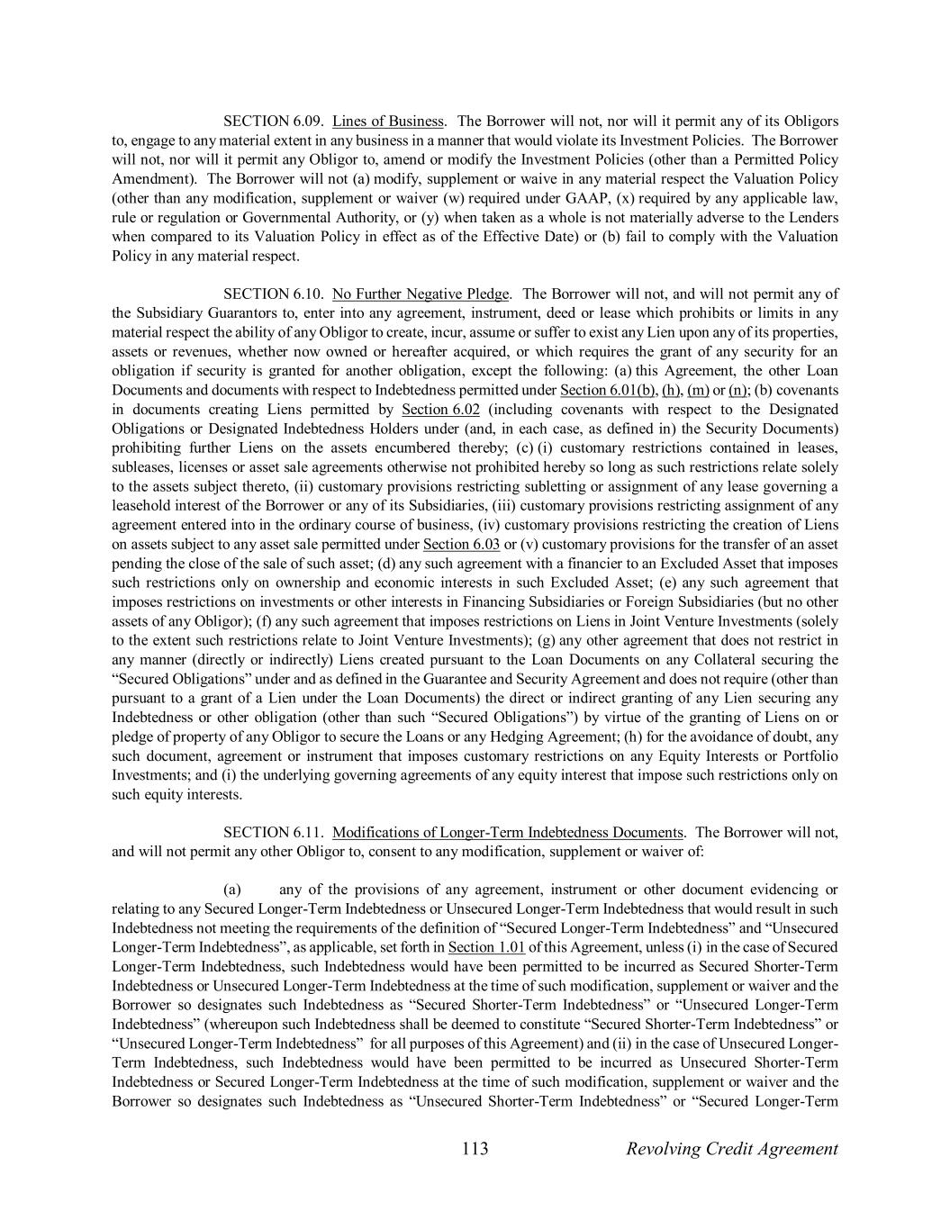 113 Revolving Credit Agreement SECTION 6.09. Lines of Business. The Borrower will not, nor will it permit any of its Obligors to, engage to any material extent in any business in a manner that would violate its Investment Policies. The Borrower will not, nor will it permit any Obligor to, amend or modify the Investment Policies (other than a Permitted Policy Amendment). The Borrower will not (a) modify, supplement or waive in any material respect the Valuation Policy (other than any modification, supplement or waiver (w) required under GAAP, (x) required by any applicable law, rule or regulation or Governmental Authority, or (y) when taken as a whole is not materially adverse to the Lenders when compared to its Valuation Policy in effect as of the Effective Date) or (b) fail to comply with the Valuation Policy in any material respect. SECTION 6.10. No Further Negative Pledge. The Borrower will not, and will not permit any of the Subsidiary Guarantors to, enter into any agreement, instrument, deed or lease which prohibits or limits in any material respect the ability of any Obligor to create, incur, assume or suffer to exist any Lien upon any of its properties, assets or revenues, whether now owned or hereafter acquired, or which requires the grant of any security for an obligation if security is granted for another obligation, except the following: (a) this Agreement, the other Loan Documents and documents with respect to Indebtedness permitted under Section 6.01(b), (h), (m) or (n); (b) covenants in documents creating Liens permitted by Section 6.02 (including covenants with respect to the Designated Obligations or Designated Indebtedness Holders under (and, in each case, as defined in) the Security Documents) prohibiting further Liens on the assets encumbered thereby; (c) (i) customary restrictions contained in leases, subleases, licenses or asset sale agreements otherwise not prohibited hereby so long as such restrictions relate solely to the assets subject thereto, (ii) customary provisions restricting subletting or assignment of any lease governing a leasehold interest of the Borrower or any of its Subsidiaries, (iii) customary provisions restricting assignment of any agreement entered into in the ordinary course of business, (iv) customary provisions restricting the creation of Liens on assets subject to any asset sale permitted under Section 6.03 or (v) customary provisions for the transfer of an asset pending the close of the sale of such asset; (d) any such agreement with a financier to an Excluded Asset that imposes such restrictions only on ownership and economic interests in such Excluded Asset; (e) any such agreement that imposes restrictions on investments or other interests in Financing Subsidiaries or Foreign Subsidiaries (but no other assets of any Obligor); (f) any such agreement that imposes restrictions on Liens in Joint Venture Investments (solely to the extent such restrictions relate to Joint Venture Investments); (g) any other agreement that does not restrict in any manner (directly or indirectly) Liens created pursuant to the Loan Documents on any Collateral securing the “Secured Obligations” under and as defined in the Guarantee and Security Agreement and does not require (other than pursuant to a grant of a Lien under the Loan Documents) the direct or indirect granting of any Lien securing any Indebtedness or other obligation (other than such “Secured Obligations”) by virtue of the granting of Liens on or pledge of property of any Obligor to secure the Loans or any Hedging Agreement; (h) for the avoidance of doubt, any such document, agreement or instrument that imposes customary restrictions on any Equity Interests or Portfolio Investments; and (i) the underlying governing agreements of any equity interest that impose such restrictions only on such equity interests. SECTION 6.11. Modifications of Longer-Term Indebtedness Documents. The Borrower will not, and will not permit any other Obligor to, consent to any modification, supplement or waiver of: (a) any of the provisions of any agreement, instrument or other document evidencing or relating to any Secured Longer-Term Indebtedness or Unsecured Longer-Term Indebtedness that would result in such Indebtedness not meeting the requirements of the definition of “Secured Longer-Term Indebtedness” and “Unsecured Longer-Term Indebtedness”, as applicable, set forth in Section 1.01 of this Agreement, unless (i) in the case of Secured Longer-Term Indebtedness, such Indebtedness would have been permitted to be incurred as Secured Shorter-Term Indebtedness or Unsecured Longer-Term Indebtedness at the time of such modification, supplement or waiver and the Borrower so designates such Indebtedness as “Secured Shorter-Term Indebtedness” or “Unsecured Longer-Term Indebtedness” (whereupon such Indebtedness shall be deemed to constitute “Secured Shorter-Term Indebtedness” or “Unsecured Longer-Term Indebtedness” for all purposes of this Agreement) and (ii) in the case of Unsecured Longer- Term Indebtedness, such Indebtedness would have been permitted to be incurred as Unsecured Shorter-Term Indebtedness or Secured Longer-Term Indebtedness at the time of such modification, supplement or waiver and the Borrower so designates such Indebtedness as “Unsecured Shorter-Term Indebtedness” or “Secured Longer-Term
