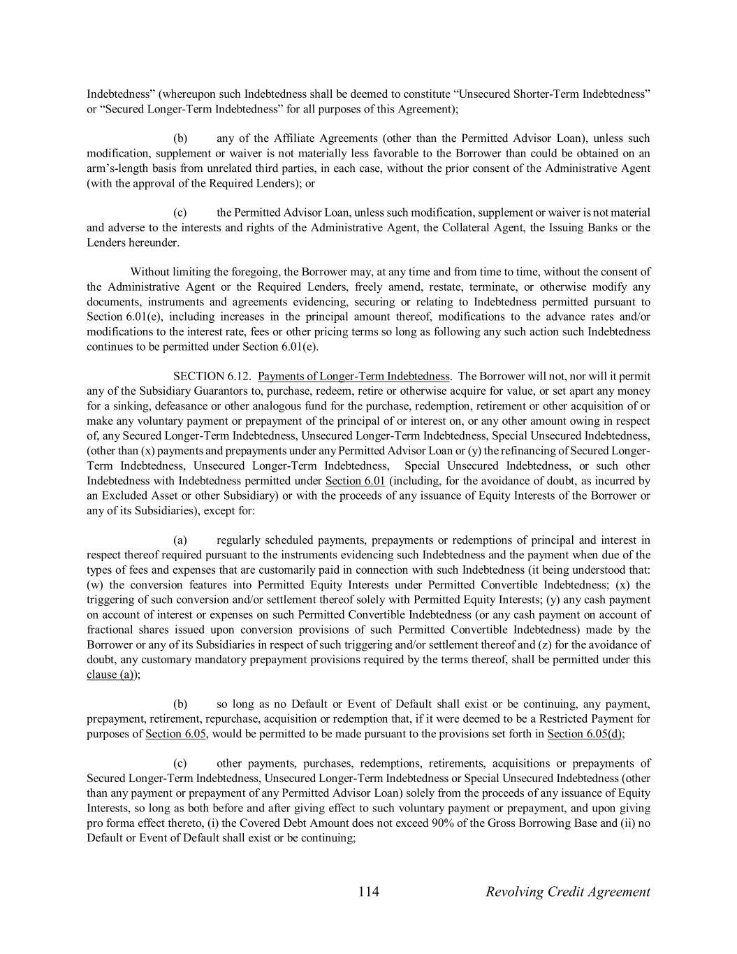114 Revolving Credit Agreement Indebtedness” (whereupon such Indebtedness shall be deemed to constitute “Unsecured Shorter-Term Indebtedness” or “Secured Longer-Term Indebtedness” for all purposes of this Agreement); (b) any of the Affiliate Agreements (other than the Permitted Advisor Loan), unless such modification, supplement or waiver is not materially less favorable to the Borrower than could be obtained on an arm’s-length basis from unrelated third parties, in each case, without the prior consent of the Administrative Agent (with the approval of the Required Lenders); or (c) the Permitted Advisor Loan, unless such modification, supplement or waiver is not material and adverse to the interests and rights of the Administrative Agent, the Collateral Agent, the Issuing Banks or the Lenders hereunder. Without limiting the foregoing, the Borrower may, at any time and from time to time, without the consent of the Administrative Agent or the Required Lenders, freely amend, restate, terminate, or otherwise modify any documents, instruments and agreements evidencing, securing or relating to Indebtedness permitted pursuant to Section 6.01(e), including increases in the principal amount thereof, modifications to the advance rates and/or modifications to the interest rate, fees or other pricing terms so long as following any such action such Indebtedness continues to be permitted under Section 6.01(e). SECTION 6.12. Payments of Longer-Term Indebtedness. The Borrower will not, nor will it permit any of the Subsidiary Guarantors to, purchase, redeem, retire or otherwise acquire for value, or set apart any money for a sinking, defeasance or other analogous fund for the purchase, redemption, retirement or other acquisition of or make any voluntary payment or prepayment of the principal of or interest on, or any other amount owing in respect of, any Secured Longer-Term Indebtedness, Unsecured Longer-Term Indebtedness, Special Unsecured Indebtedness, (other than (x) payments and prepayments under any Permitted Advisor Loan or (y) the refinancing of Secured Longer- Term Indebtedness, Unsecured Longer-Term Indebtedness, Special Unsecured Indebtedness, or such other Indebtedness with Indebtedness permitted under Section 6.01 (including, for the avoidance of doubt, as incurred by an Excluded Asset or other Subsidiary) or with the proceeds of any issuance of Equity Interests of the Borrower or any of its Subsidiaries), except for: (a) regularly scheduled payments, prepayments or redemptions of principal and interest in respect thereof required pursuant to the instruments evidencing such Indebtedness and the payment when due of the types of fees and expenses that are customarily paid in connection with such Indebtedness (it being understood that: (w) the conversion features into Permitted Equity Interests under Permitted Convertible Indebtedness; (x) the triggering of such conversion and/or settlement thereof solely with Permitted Equity Interests; (y) any cash payment on account of interest or expenses on such Permitted Convertible Indebtedness (or any cash payment on account of fractional shares issued upon conversion provisions of such Permitted Convertible Indebtedness) made by the Borrower or any of its Subsidiaries in respect of such triggering and/or settlement thereof and (z) for the avoidance of doubt, any customary mandatory prepayment provisions required by the terms thereof, shall be permitted under this clause (a)); (b) so long as no Default or Event of Default shall exist or be continuing, any payment, prepayment, retirement, repurchase, acquisition or redemption that, if it were deemed to be a Restricted Payment for purposes of Section 6.05, would be permitted to be made pursuant to the provisions set forth in Section 6.05(d); (c) other payments, purchases, redemptions, retirements, acquisitions or prepayments of Secured Longer-Term Indebtedness, Unsecured Longer-Term Indebtedness or Special Unsecured Indebtedness (other than any payment or prepayment of any Permitted Advisor Loan) solely from the proceeds of any issuance of Equity Interests, so long as both before and after giving effect to such voluntary payment or prepayment, and upon giving pro forma effect thereto, (i) the Covered Debt Amount does not exceed 90% of the Gross Borrowing Base and (ii) no Default or Event of Default shall exist or be continuing;