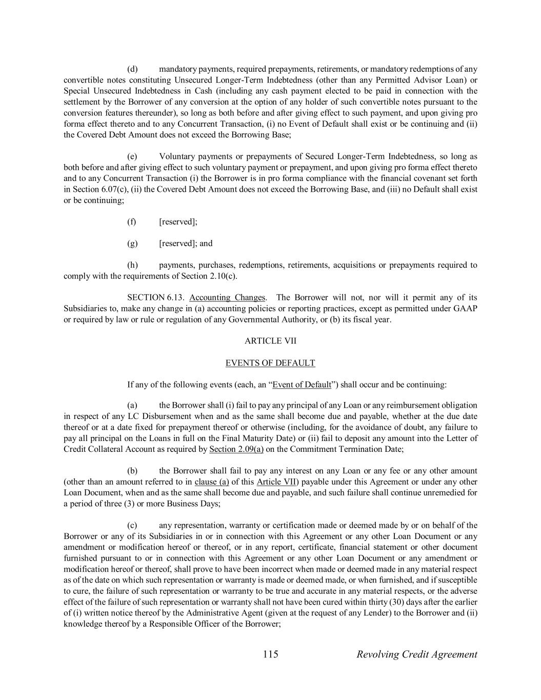 115 Revolving Credit Agreement (d) mandatory payments, required prepayments, retirements, or mandatory redemptions of any convertible notes constituting Unsecured Longer-Term Indebtedness (other than any Permitted Advisor Loan) or Special Unsecured Indebtedness in Cash (including any cash payment elected to be paid in connection with the settlement by the Borrower of any conversion at the option of any holder of such convertible notes pursuant to the conversion features thereunder), so long as both before and after giving effect to such payment, and upon giving pro forma effect thereto and to any Concurrent Transaction, (i) no Event of Default shall exist or be continuing and (ii) the Covered Debt Amount does not exceed the Borrowing Base; (e) Voluntary payments or prepayments of Secured Longer-Term Indebtedness, so long as both before and after giving effect to such voluntary payment or prepayment, and upon giving pro forma effect thereto and to any Concurrent Transaction (i) the Borrower is in pro forma compliance with the financial covenant set forth in Section 6.07(c), (ii) the Covered Debt Amount does not exceed the Borrowing Base, and (iii) no Default shall exist or be continuing; (f) [reserved]; (g) [reserved]; and (h) payments, purchases, redemptions, retirements, acquisitions or prepayments required to comply with the requirements of Section 2.10(c). SECTION 6.13. Accounting Changes. The Borrower will not, nor will it permit any of its Subsidiaries to, make any change in (a) accounting policies or reporting practices, except as permitted under GAAP or required by law or rule or regulation of any Governmental Authority, or (b) its fiscal year. ARTICLE VII EVENTS OF DEFAULT If any of the following events (each, an “Event of Default”) shall occur and be continuing: (a) the Borrower shall (i) fail to pay any principal of any Loan or any reimbursement obligation in respect of any LC Disbursement when and as the same shall become due and payable, whether at the due date thereof or at a date fixed for prepayment thereof or otherwise (including, for the avoidance of doubt, any failure to pay all principal on the Loans in full on the Final Maturity Date) or (ii) fail to deposit any amount into the Letter of Credit Collateral Account as required by Section 2.09(a) on the Commitment Termination Date; (b) the Borrower shall fail to pay any interest on any Loan or any fee or any other amount (other than an amount referred to in clause (a) of this Article VII) payable under this Agreement or under any other Loan Document, when and as the same shall become due and payable, and such failure shall continue unremedied for a period of three (3) or more Business Days; (c) any representation, warranty or certification made or deemed made by or on behalf of the Borrower or any of its Subsidiaries in or in connection with this Agreement or any other Loan Document or any amendment or modification hereof or thereof, or in any report, certificate, financial statement or other document furnished pursuant to or in connection with this Agreement or any other Loan Document or any amendment or modification hereof or thereof, shall prove to have been incorrect when made or deemed made in any material respect as of the date on which such representation or warranty is made or deemed made, or when furnished, and if susceptible to cure, the failure of such representation or warranty to be true and accurate in any material respects, or the adverse effect of the failure of such representation or warranty shall not have been cured within thirty (30) days after the earlier of (i) written notice thereof by the Administrative Agent (given at the request of any Lender) to the Borrower and (ii) knowledge thereof by a Responsible Officer of the Borrower;