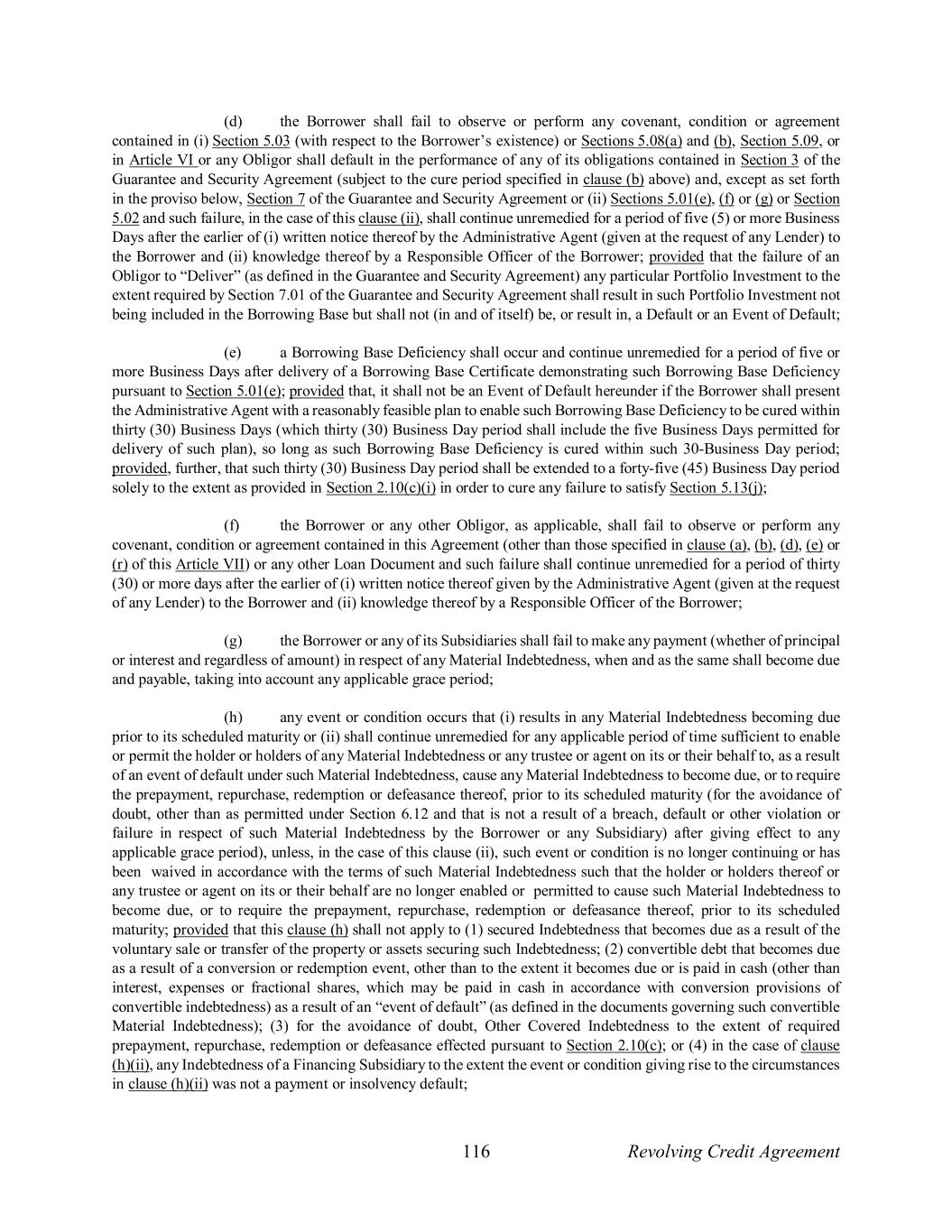 116 Revolving Credit Agreement (d) the Borrower shall fail to observe or perform any covenant, condition or agreement contained in (i) Section 5.03 (with respect to the Borrower’s existence) or Sections 5.08(a) and (b), Section 5.09, or in Article VI or any Obligor shall default in the performance of any of its obligations contained in Section 3 of the Guarantee and Security Agreement (subject to the cure period specified in clause (b) above) and, except as set forth in the proviso below, Section 7 of the Guarantee and Security Agreement or (ii) Sections 5.01(e), (f) or (g) or Section 5.02 and such failure, in the case of this clause (ii), shall continue unremedied for a period of five (5) or more Business Days after the earlier of (i) written notice thereof by the Administrative Agent (given at the request of any Lender) to the Borrower and (ii) knowledge thereof by a Responsible Officer of the Borrower; provided that the failure of an Obligor to “Deliver” (as defined in the Guarantee and Security Agreement) any particular Portfolio Investment to the extent required by Section 7.01 of the Guarantee and Security Agreement shall result in such Portfolio Investment not being included in the Borrowing Base but shall not (in and of itself) be, or result in, a Default or an Event of Default; (e) a Borrowing Base Deficiency shall occur and continue unremedied for a period of five or more Business Days after delivery of a Borrowing Base Certificate demonstrating such Borrowing Base Deficiency pursuant to Section 5.01(e); provided that, it shall not be an Event of Default hereunder if the Borrower shall present the Administrative Agent with a reasonably feasible plan to enable such Borrowing Base Deficiency to be cured within thirty (30) Business Days (which thirty (30) Business Day period shall include the five Business Days permitted for delivery of such plan), so long as such Borrowing Base Deficiency is cured within such 30-Business Day period; provided, further, that such thirty (30) Business Day period shall be extended to a forty-five (45) Business Day period solely to the extent as provided in Section 2.10(c)(i) in order to cure any failure to satisfy Section 5.13(j); (f) the Borrower or any other Obligor, as applicable, shall fail to observe or perform any covenant, condition or agreement contained in this Agreement (other than those specified in clause (a), (b), (d), (e) or (r) of this Article VII) or any other Loan Document and such failure shall continue unremedied for a period of thirty (30) or more days after the earlier of (i) written notice thereof given by the Administrative Agent (given at the request of any Lender) to the Borrower and (ii) knowledge thereof by a Responsible Officer of the Borrower; (g) the Borrower or any of its Subsidiaries shall fail to make any payment (whether of principal or interest and regardless of amount) in respect of any Material Indebtedness, when and as the same shall become due and payable, taking into account any applicable grace period; (h) any event or condition occurs that (i) results in any Material Indebtedness becoming due prior to its scheduled maturity or (ii) shall continue unremedied for any applicable period of time sufficient to enable or permit the holder or holders of any Material Indebtedness or any trustee or agent on its or their behalf to, as a result of an event of default under such Material Indebtedness, cause any Material Indebtedness to become due, or to require the prepayment, repurchase, redemption or defeasance thereof, prior to its scheduled maturity (for the avoidance of doubt, other than as permitted under Section 6.12 and that is not a result of a breach, default or other violation or failure in respect of such Material Indebtedness by the Borrower or any Subsidiary) after giving effect to any applicable grace period), unless, in the case of this clause (ii), such event or condition is no longer continuing or has been waived in accordance with the terms of such Material Indebtedness such that the holder or holders thereof or any trustee or agent on its or their behalf are no longer enabled or permitted to cause such Material Indebtedness to become due, or to require the prepayment, repurchase, redemption or defeasance thereof, prior to its scheduled maturity; provided that this clause (h) shall not apply to (1) secured Indebtedness that becomes due as a result of the voluntary sale or transfer of the property or assets securing such Indebtedness; (2) convertible debt that becomes due as a result of a conversion or redemption event, other than to the extent it becomes due or is paid in cash (other than interest, expenses or fractional shares, which may be paid in cash in accordance with conversion provisions of convertible indebtedness) as a result of an “event of default” (as defined in the documents governing such convertible Material Indebtedness); (3) for the avoidance of doubt, Other Covered Indebtedness to the extent of required prepayment, repurchase, redemption or defeasance effected pursuant to Section 2.10(c); or (4) in the case of clause (h)(ii), any Indebtedness of a Financing Subsidiary to the extent the event or condition giving rise to the circumstances in clause (h)(ii) was not a payment or insolvency default;