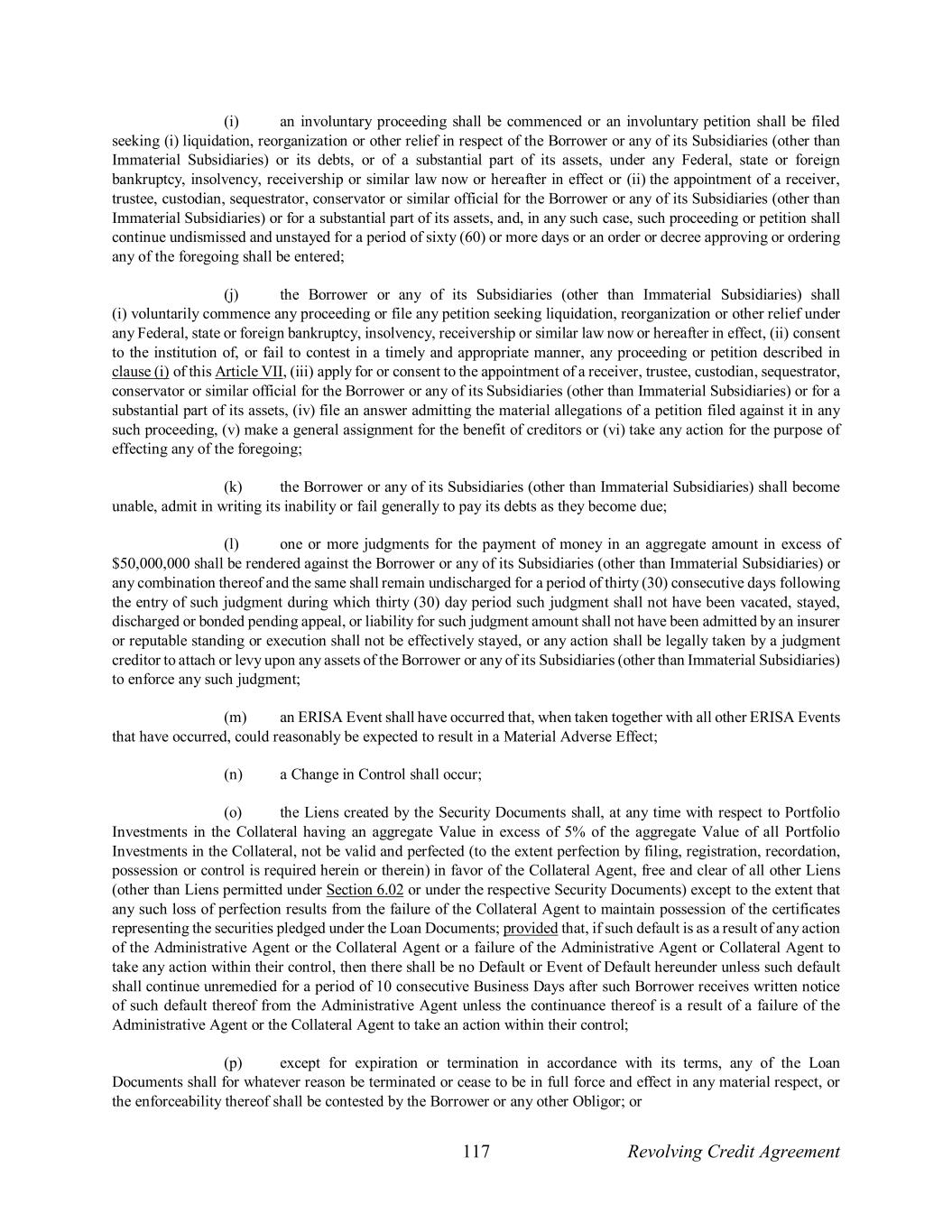 117 Revolving Credit Agreement (i) an involuntary proceeding shall be commenced or an involuntary petition shall be filed seeking (i) liquidation, reorganization or other relief in respect of the Borrower or any of its Subsidiaries (other than Immaterial Subsidiaries) or its debts, or of a substantial part of its assets, under any Federal, state or foreign bankruptcy, insolvency, receivership or similar law now or hereafter in effect or (ii) the appointment of a receiver, trustee, custodian, sequestrator, conservator or similar official for the Borrower or any of its Subsidiaries (other than Immaterial Subsidiaries) or for a substantial part of its assets, and, in any such case, such proceeding or petition shall continue undismissed and unstayed for a period of sixty (60) or more days or an order or decree approving or ordering any of the foregoing shall be entered; (j) the Borrower or any of its Subsidiaries (other than Immaterial Subsidiaries) shall (i) voluntarily commence any proceeding or file any petition seeking liquidation, reorganization or other relief under any Federal, state or foreign bankruptcy, insolvency, receivership or similar law now or hereafter in effect, (ii) consent to the institution of, or fail to contest in a timely and appropriate manner, any proceeding or petition described in clause (i) of this Article VII, (iii) apply for or consent to the appointment of a receiver, trustee, custodian, sequestrator, conservator or similar official for the Borrower or any of its Subsidiaries (other than Immaterial Subsidiaries) or for a substantial part of its assets, (iv) file an answer admitting the material allegations of a petition filed against it in any such proceeding, (v) make a general assignment for the benefit of creditors or (vi) take any action for the purpose of effecting any of the foregoing; (k) the Borrower or any of its Subsidiaries (other than Immaterial Subsidiaries) shall become unable, admit in writing its inability or fail generally to pay its debts as they become due; (l) one or more judgments for the payment of money in an aggregate amount in excess of $50,000,000 shall be rendered against the Borrower or any of its Subsidiaries (other than Immaterial Subsidiaries) or any combination thereof and the same shall remain undischarged for a period of thirty (30) consecutive days following the entry of such judgment during which thirty (30) day period such judgment shall not have been vacated, stayed, discharged or bonded pending appeal, or liability for such judgment amount shall not have been admitted by an insurer or reputable standing or execution shall not be effectively stayed, or any action shall be legally taken by a judgment creditor to attach or levy upon any assets of the Borrower or any of its Subsidiaries (other than Immaterial Subsidiaries) to enforce any such judgment; (m) an ERISA Event shall have occurred that, when taken together with all other ERISA Events that have occurred, could reasonably be expected to result in a Material Adverse Effect; (n) a Change in Control shall occur; (o) the Liens created by the Security Documents shall, at any time with respect to Portfolio Investments in the Collateral having an aggregate Value in excess of 5% of the aggregate Value of all Portfolio Investments in the Collateral, not be valid and perfected (to the extent perfection by filing, registration, recordation, possession or control is required herein or therein) in favor of the Collateral Agent, free and clear of all other Liens (other than Liens permitted under Section 6.02 or under the respective Security Documents) except to the extent that any such loss of perfection results from the failure of the Collateral Agent to maintain possession of the certificates representing the securities pledged under the Loan Documents; provided that, if such default is as a result of any action of the Administrative Agent or the Collateral Agent or a failure of the Administrative Agent or Collateral Agent to take any action within their control, then there shall be no Default or Event of Default hereunder unless such default shall continue unremedied for a period of 10 consecutive Business Days after such Borrower receives written notice of such default thereof from the Administrative Agent unless the continuance thereof is a result of a failure of the Administrative Agent or the Collateral Agent to take an action within their control; (p) except for expiration or termination in accordance with its terms, any of the Loan Documents shall for whatever reason be terminated or cease to be in full force and effect in any material respect, or the enforceability thereof shall be contested by the Borrower or any other Obligor; or