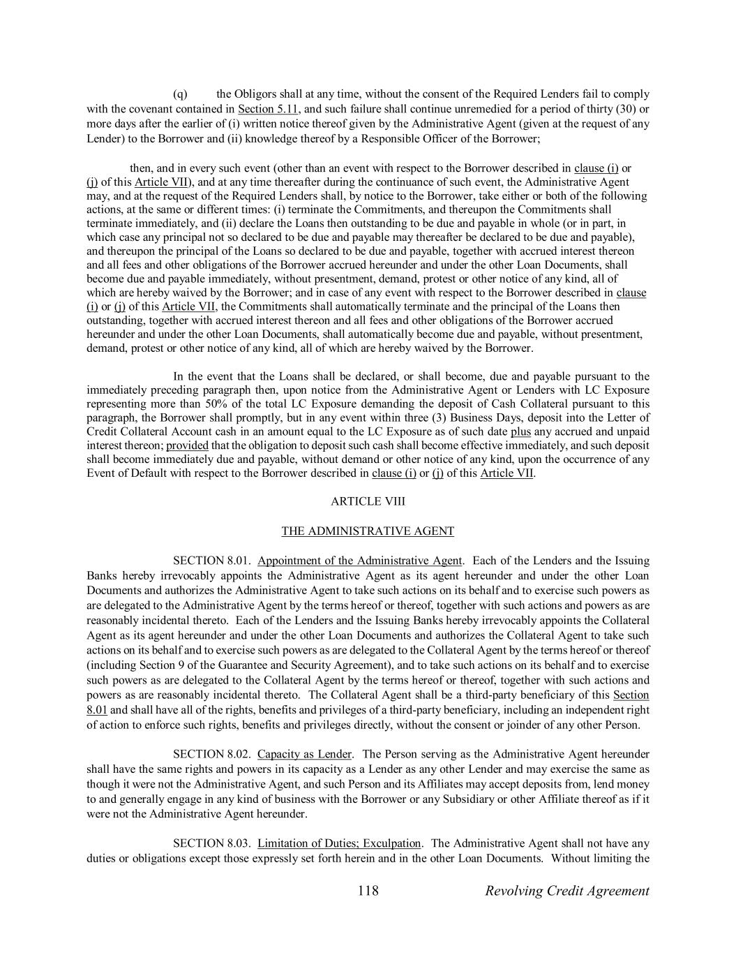 118 Revolving Credit Agreement (q) the Obligors shall at any time, without the consent of the Required Lenders fail to comply with the covenant contained in Section 5.11, and such failure shall continue unremedied for a period of thirty (30) or more days after the earlier of (i) written notice thereof given by the Administrative Agent (given at the request of any Lender) to the Borrower and (ii) knowledge thereof by a Responsible Officer of the Borrower; then, and in every such event (other than an event with respect to the Borrower described in clause (i) or (j) of this Article VII), and at any time thereafter during the continuance of such event, the Administrative Agent may, and at the request of the Required Lenders shall, by notice to the Borrower, take either or both of the following actions, at the same or different times: (i) terminate the Commitments, and thereupon the Commitments shall terminate immediately, and (ii) declare the Loans then outstanding to be due and payable in whole (or in part, in which case any principal not so declared to be due and payable may thereafter be declared to be due and payable), and thereupon the principal of the Loans so declared to be due and payable, together with accrued interest thereon and all fees and other obligations of the Borrower accrued hereunder and under the other Loan Documents, shall become due and payable immediately, without presentment, demand, protest or other notice of any kind, all of which are hereby waived by the Borrower; and in case of any event with respect to the Borrower described in clause (i) or (j) of this Article VII, the Commitments shall automatically terminate and the principal of the Loans then outstanding, together with accrued interest thereon and all fees and other obligations of the Borrower accrued hereunder and under the other Loan Documents, shall automatically become due and payable, without presentment, demand, protest or other notice of any kind, all of which are hereby waived by the Borrower. In the event that the Loans shall be declared, or shall become, due and payable pursuant to the immediately preceding paragraph then, upon notice from the Administrative Agent or Lenders with LC Exposure representing more than 50% of the total LC Exposure demanding the deposit of Cash Collateral pursuant to this paragraph, the Borrower shall promptly, but in any event within three (3) Business Days, deposit into the Letter of Credit Collateral Account cash in an amount equal to the LC Exposure as of such date plus any accrued and unpaid interest thereon; provided that the obligation to deposit such cash shall become effective immediately, and such deposit shall become immediately due and payable, without demand or other notice of any kind, upon the occurrence of any Event of Default with respect to the Borrower described in clause (i) or (j) of this Article VII. ARTICLE VIII THE ADMINISTRATIVE AGENT SECTION 8.01. Appointment of the Administrative Agent. Each of the Lenders and the Issuing Banks hereby irrevocably appoints the Administrative Agent as its agent hereunder and under the other Loan Documents and authorizes the Administrative Agent to take such actions on its behalf and to exercise such powers as are delegated to the Administrative Agent by the terms hereof or thereof, together with such actions and powers as are reasonably incidental thereto. Each of the Lenders and the Issuing Banks hereby irrevocably appoints the Collateral Agent as its agent hereunder and under the other Loan Documents and authorizes the Collateral Agent to take such actions on its behalf and to exercise such powers as are delegated to the Collateral Agent by the terms hereof or thereof (including Section 9 of the Guarantee and Security Agreement), and to take such actions on its behalf and to exercise such powers as are delegated to the Collateral Agent by the terms hereof or thereof, together with such actions and powers as are reasonably incidental thereto. The Collateral Agent shall be a third-party beneficiary of this Section 8.01 and shall have all of the rights, benefits and privileges of a third-party beneficiary, including an independent right of action to enforce such rights, benefits and privileges directly, without the consent or joinder of any other Person. SECTION 8.02. Capacity as Lender. The Person serving as the Administrative Agent hereunder shall have the same rights and powers in its capacity as a Lender as any other Lender and may exercise the same as though it were not the Administrative Agent, and such Person and its Affiliates may accept deposits from, lend money to and generally engage in any kind of business with the Borrower or any Subsidiary or other Affiliate thereof as if it were not the Administrative Agent hereunder. SECTION 8.03. Limitation of Duties; Exculpation. The Administrative Agent shall not have any duties or obligations except those expressly set forth herein and in the other Loan Documents. Without limiting the