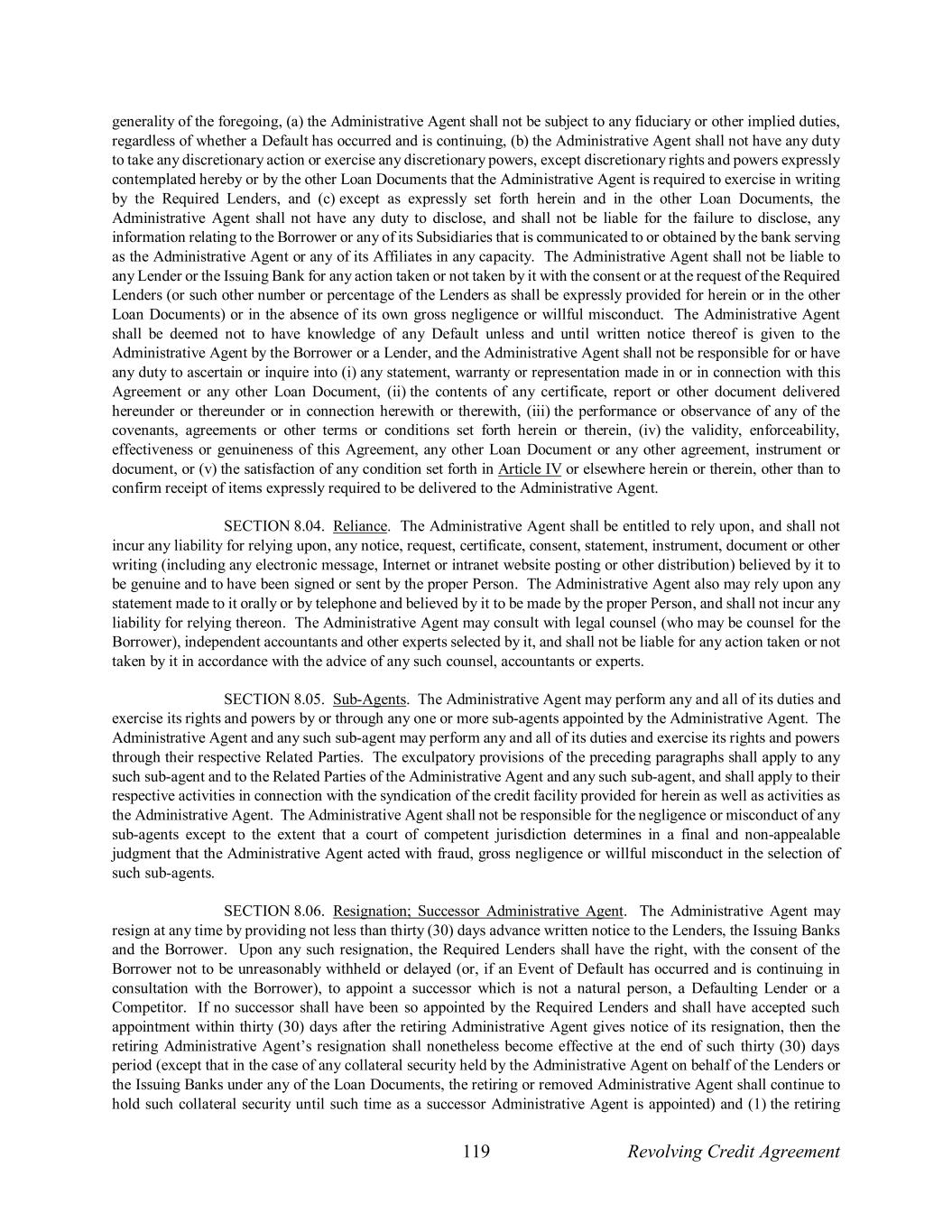 119 Revolving Credit Agreement generality of the foregoing, (a) the Administrative Agent shall not be subject to any fiduciary or other implied duties, regardless of whether a Default has occurred and is continuing, (b) the Administrative Agent shall not have any duty to take any discretionary action or exercise any discretionary powers, except discretionary rights and powers expressly contemplated hereby or by the other Loan Documents that the Administrative Agent is required to exercise in writing by the Required Lenders, and (c) except as expressly set forth herein and in the other Loan Documents, the Administrative Agent shall not have any duty to disclose, and shall not be liable for the failure to disclose, any information relating to the Borrower or any of its Subsidiaries that is communicated to or obtained by the bank serving as the Administrative Agent or any of its Affiliates in any capacity. The Administrative Agent shall not be liable to any Lender or the Issuing Bank for any action taken or not taken by it with the consent or at the request of the Required Lenders (or such other number or percentage of the Lenders as shall be expressly provided for herein or in the other Loan Documents) or in the absence of its own gross negligence or willful misconduct. The Administrative Agent shall be deemed not to have knowledge of any Default unless and until written notice thereof is given to the Administrative Agent by the Borrower or a Lender, and the Administrative Agent shall not be responsible for or have any duty to ascertain or inquire into (i) any statement, warranty or representation made in or in connection with this Agreement or any other Loan Document, (ii) the contents of any certificate, report or other document delivered hereunder or thereunder or in connection herewith or therewith, (iii) the performance or observance of any of the covenants, agreements or other terms or conditions set forth herein or therein, (iv) the validity, enforceability, effectiveness or genuineness of this Agreement, any other Loan Document or any other agreement, instrument or document, or (v) the satisfaction of any condition set forth in Article IV or elsewhere herein or therein, other than to confirm receipt of items expressly required to be delivered to the Administrative Agent. SECTION 8.04. Reliance. The Administrative Agent shall be entitled to rely upon, and shall not incur any liability for relying upon, any notice, request, certificate, consent, statement, instrument, document or other writing (including any electronic message, Internet or intranet website posting or other distribution) believed by it to be genuine and to have been signed or sent by the proper Person. The Administrative Agent also may rely upon any statement made to it orally or by telephone and believed by it to be made by the proper Person, and shall not incur any liability for relying thereon. The Administrative Agent may consult with legal counsel (who may be counsel for the Borrower), independent accountants and other experts selected by it, and shall not be liable for any action taken or not taken by it in accordance with the advice of any such counsel, accountants or experts. SECTION 8.05. Sub-Agents. The Administrative Agent may perform any and all of its duties and exercise its rights and powers by or through any one or more sub-agents appointed by the Administrative Agent. The Administrative Agent and any such sub-agent may perform any and all of its duties and exercise its rights and powers through their respective Related Parties. The exculpatory provisions of the preceding paragraphs shall apply to any such sub-agent and to the Related Parties of the Administrative Agent and any such sub-agent, and shall apply to their respective activities in connection with the syndication of the credit facility provided for herein as well as activities as the Administrative Agent. The Administrative Agent shall not be responsible for the negligence or misconduct of any sub-agents except to the extent that a court of competent jurisdiction determines in a final and non-appealable judgment that the Administrative Agent acted with fraud, gross negligence or willful misconduct in the selection of such sub-agents. SECTION 8.06. Resignation; Successor Administrative Agent. The Administrative Agent may resign at any time by providing not less than thirty (30) days advance written notice to the Lenders, the Issuing Banks and the Borrower. Upon any such resignation, the Required Lenders shall have the right, with the consent of the Borrower not to be unreasonably withheld or delayed (or, if an Event of Default has occurred and is continuing in consultation with the Borrower), to appoint a successor which is not a natural person, a Defaulting Lender or a Competitor. If no successor shall have been so appointed by the Required Lenders and shall have accepted such appointment within thirty (30) days after the retiring Administrative Agent gives notice of its resignation, then the retiring Administrative Agent’s resignation shall nonetheless become effective at the end of such thirty (30) days period (except that in the case of any collateral security held by the Administrative Agent on behalf of the Lenders or the Issuing Banks under any of the Loan Documents, the retiring or removed Administrative Agent shall continue to hold such collateral security until such time as a successor Administrative Agent is appointed) and (1) the retiring
