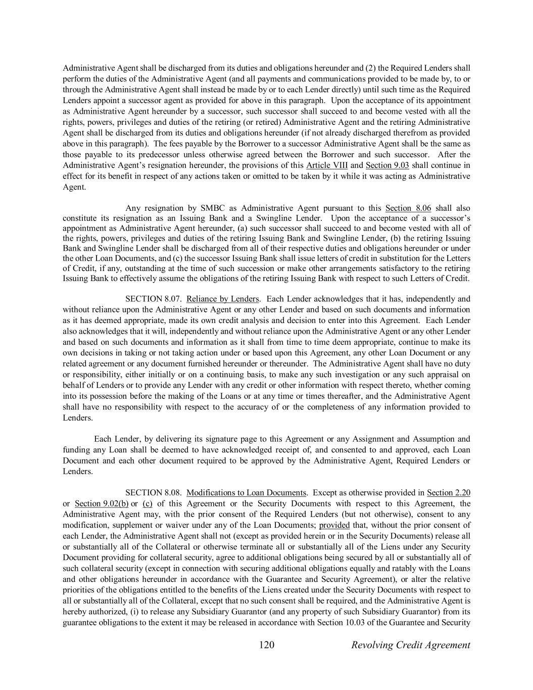 120 Revolving Credit Agreement Administrative Agent shall be discharged from its duties and obligations hereunder and (2) the Required Lenders shall perform the duties of the Administrative Agent (and all payments and communications provided to be made by, to or through the Administrative Agent shall instead be made by or to each Lender directly) until such time as the Required Lenders appoint a successor agent as provided for above in this paragraph. Upon the acceptance of its appointment as Administrative Agent hereunder by a successor, such successor shall succeed to and become vested with all the rights, powers, privileges and duties of the retiring (or retired) Administrative Agent and the retiring Administrative Agent shall be discharged from its duties and obligations hereunder (if not already discharged therefrom as provided above in this paragraph). The fees payable by the Borrower to a successor Administrative Agent shall be the same as those payable to its predecessor unless otherwise agreed between the Borrower and such successor. After the Administrative Agent’s resignation hereunder, the provisions of this Article VIII and Section 9.03 shall continue in effect for its benefit in respect of any actions taken or omitted to be taken by it while it was acting as Administrative Agent. Any resignation by SMBC as Administrative Agent pursuant to this Section 8.06 shall also constitute its resignation as an Issuing Bank and a Swingline Lender. Upon the acceptance of a successor’s appointment as Administrative Agent hereunder, (a) such successor shall succeed to and become vested with all of the rights, powers, privileges and duties of the retiring Issuing Bank and Swingline Lender, (b) the retiring Issuing Bank and Swingline Lender shall be discharged from all of their respective duties and obligations hereunder or under the other Loan Documents, and (c) the successor Issuing Bank shall issue letters of credit in substitution for the Letters of Credit, if any, outstanding at the time of such succession or make other arrangements satisfactory to the retiring Issuing Bank to effectively assume the obligations of the retiring Issuing Bank with respect to such Letters of Credit. SECTION 8.07. Reliance by Lenders. Each Lender acknowledges that it has, independently and without reliance upon the Administrative Agent or any other Lender and based on such documents and information as it has deemed appropriate, made its own credit analysis and decision to enter into this Agreement. Each Lender also acknowledges that it will, independently and without reliance upon the Administrative Agent or any other Lender and based on such documents and information as it shall from time to time deem appropriate, continue to make its own decisions in taking or not taking action under or based upon this Agreement, any other Loan Document or any related agreement or any document furnished hereunder or thereunder. The Administrative Agent shall have no duty or responsibility, either initially or on a continuing basis, to make any such investigation or any such appraisal on behalf of Lenders or to provide any Lender with any credit or other information with respect thereto, whether coming into its possession before the making of the Loans or at any time or times thereafter, and the Administrative Agent shall have no responsibility with respect to the accuracy of or the completeness of any information provided to Lenders. Each Lender, by delivering its signature page to this Agreement or any Assignment and Assumption and funding any Loan shall be deemed to have acknowledged receipt of, and consented to and approved, each Loan Document and each other document required to be approved by the Administrative Agent, Required Lenders or Lenders. SECTION 8.08. Modifications to Loan Documents. Except as otherwise provided in Section 2.20 or Section 9.02(b) or (c) of this Agreement or the Security Documents with respect to this Agreement, the Administrative Agent may, with the prior consent of the Required Lenders (but not otherwise), consent to any modification, supplement or waiver under any of the Loan Documents; provided that, without the prior consent of each Lender, the Administrative Agent shall not (except as provided herein or in the Security Documents) release all or substantially all of the Collateral or otherwise terminate all or substantially all of the Liens under any Security Document providing for collateral security, agree to additional obligations being secured by all or substantially all of such collateral security (except in connection with securing additional obligations equally and ratably with the Loans and other obligations hereunder in accordance with the Guarantee and Security Agreement), or alter the relative priorities of the obligations entitled to the benefits of the Liens created under the Security Documents with respect to all or substantially all of the Collateral, except that no such consent shall be required, and the Administrative Agent is hereby authorized, (i) to release any Subsidiary Guarantor (and any property of such Subsidiary Guarantor) from its guarantee obligations to the extent it may be released in accordance with Section 10.03 of the Guarantee and Security
