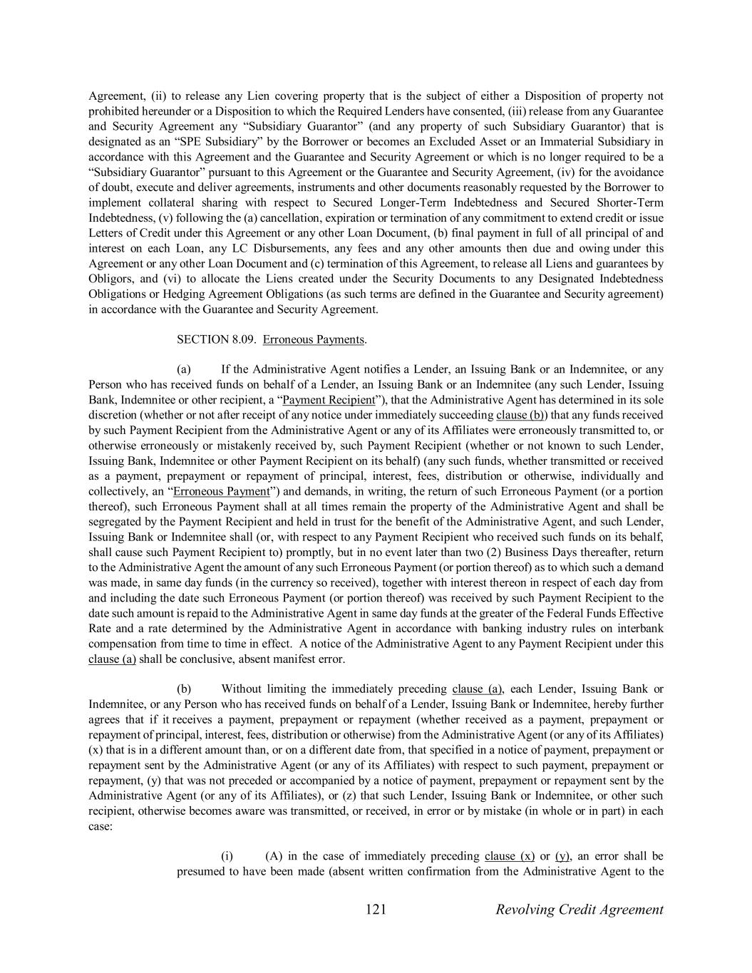 121 Revolving Credit Agreement Agreement, (ii) to release any Lien covering property that is the subject of either a Disposition of property not prohibited hereunder or a Disposition to which the Required Lenders have consented, (iii) release from any Guarantee and Security Agreement any “Subsidiary Guarantor” (and any property of such Subsidiary Guarantor) that is designated as an “SPE Subsidiary” by the Borrower or becomes an Excluded Asset or an Immaterial Subsidiary in accordance with this Agreement and the Guarantee and Security Agreement or which is no longer required to be a “Subsidiary Guarantor” pursuant to this Agreement or the Guarantee and Security Agreement, (iv) for the avoidance of doubt, execute and deliver agreements, instruments and other documents reasonably requested by the Borrower to implement collateral sharing with respect to Secured Longer-Term Indebtedness and Secured Shorter-Term Indebtedness, (v) following the (a) cancellation, expiration or termination of any commitment to extend credit or issue Letters of Credit under this Agreement or any other Loan Document, (b) final payment in full of all principal of and interest on each Loan, any LC Disbursements, any fees and any other amounts then due and owing under this Agreement or any other Loan Document and (c) termination of this Agreement, to release all Liens and guarantees by Obligors, and (vi) to allocate the Liens created under the Security Documents to any Designated Indebtedness Obligations or Hedging Agreement Obligations (as such terms are defined in the Guarantee and Security agreement) in accordance with the Guarantee and Security Agreement. SECTION 8.09. Erroneous Payments. (a) If the Administrative Agent notifies a Lender, an Issuing Bank or an Indemnitee, or any Person who has received funds on behalf of a Lender, an Issuing Bank or an Indemnitee (any such Lender, Issuing Bank, Indemnitee or other recipient, a “Payment Recipient”), that the Administrative Agent has determined in its sole discretion (whether or not after receipt of any notice under immediately succeeding clause (b)) that any funds received by such Payment Recipient from the Administrative Agent or any of its Affiliates were erroneously transmitted to, or otherwise erroneously or mistakenly received by, such Payment Recipient (whether or not known to such Lender, Issuing Bank, Indemnitee or other Payment Recipient on its behalf) (any such funds, whether transmitted or received as a payment, prepayment or repayment of principal, interest, fees, distribution or otherwise, individually and collectively, an “Erroneous Payment”) and demands, in writing, the return of such Erroneous Payment (or a portion thereof), such Erroneous Payment shall at all times remain the property of the Administrative Agent and shall be segregated by the Payment Recipient and held in trust for the benefit of the Administrative Agent, and such Lender, Issuing Bank or Indemnitee shall (or, with respect to any Payment Recipient who received such funds on its behalf, shall cause such Payment Recipient to) promptly, but in no event later than two (2) Business Days thereafter, return to the Administrative Agent the amount of any such Erroneous Payment (or portion thereof) as to which such a demand was made, in same day funds (in the currency so received), together with interest thereon in respect of each day from and including the date such Erroneous Payment (or portion thereof) was received by such Payment Recipient to the date such amount is repaid to the Administrative Agent in same day funds at the greater of the Federal Funds Effective Rate and a rate determined by the Administrative Agent in accordance with banking industry rules on interbank compensation from time to time in effect. A notice of the Administrative Agent to any Payment Recipient under this clause (a) shall be conclusive, absent manifest error. (b) Without limiting the immediately preceding clause (a), each Lender, Issuing Bank or Indemnitee, or any Person who has received funds on behalf of a Lender, Issuing Bank or Indemnitee, hereby further agrees that if it receives a payment, prepayment or repayment (whether received as a payment, prepayment or repayment of principal, interest, fees, distribution or otherwise) from the Administrative Agent (or any of its Affiliates) (x) that is in a different amount than, or on a different date from, that specified in a notice of payment, prepayment or repayment sent by the Administrative Agent (or any of its Affiliates) with respect to such payment, prepayment or repayment, (y) that was not preceded or accompanied by a notice of payment, prepayment or repayment sent by the Administrative Agent (or any of its Affiliates), or (z) that such Lender, Issuing Bank or Indemnitee, or other such recipient, otherwise becomes aware was transmitted, or received, in error or by mistake (in whole or in part) in each case: (i) (A) in the case of immediately preceding clause (x) or (y), an error shall be presumed to have been made (absent written confirmation from the Administrative Agent to the