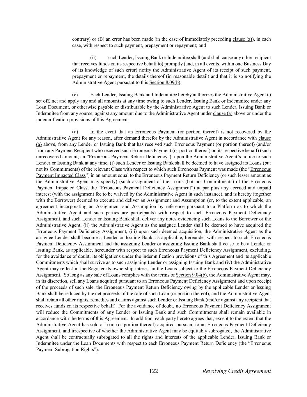 122 Revolving Credit Agreement contrary) or (B) an error has been made (in the case of immediately preceding clause (z)), in each case, with respect to such payment, prepayment or repayment; and (ii) such Lender, Issuing Bank or Indemnitee shall (and shall cause any other recipient that receives funds on its respective behalf to) promptly (and, in all events, within one Business Day of its knowledge of such error) notify the Administrative Agent of its receipt of such payment, prepayment or repayment, the details thereof (in reasonable detail) and that it is so notifying the Administrative Agent pursuant to this Section 8.09(b). (c) Each Lender, Issuing Bank and Indemnitee hereby authorizes the Administrative Agent to set off, net and apply any and all amounts at any time owing to such Lender, Issuing Bank or Indemnitee under any Loan Document, or otherwise payable or distributable by the Administrative Agent to such Lender, Issuing Bank or Indemnitee from any source, against any amount due to the Administrative Agent under clause (a) above or under the indemnification provisions of this Agreement. (d) In the event that an Erroneous Payment (or portion thereof) is not recovered by the Administrative Agent for any reason, after demand therefor by the Administrative Agent in accordance with clause (a) above, from any Lender or Issuing Bank that has received such Erroneous Payment (or portion thereof) (and/or from any Payment Recipient who received such Erroneous Payment (or portion thereof) on its respective behalf) (such unrecovered amount, an “Erroneous Payment Return Deficiency”), upon the Administrative Agent’s notice to such Lender or Issuing Bank at any time, (i) such Lender or Issuing Bank shall be deemed to have assigned its Loans (but not its Commitments) of the relevant Class with respect to which such Erroneous Payment was made (the “Erroneous Payment Impacted Class”) in an amount equal to the Erroneous Payment Return Deficiency (or such lesser amount as the Administrative Agent may specify) (such assignment of the Loans (but not Commitments) of the Erroneous Payment Impacted Class, the “Erroneous Payment Deficiency Assignment”) at par plus any accrued and unpaid interest (with the assignment fee to be waived by the Administrative Agent in such instance), and is hereby (together with the Borrower) deemed to execute and deliver an Assignment and Assumption (or, to the extent applicable, an agreement incorporating an Assignment and Assumption by reference pursuant to a Platform as to which the Administrative Agent and such parties are participants) with respect to such Erroneous Payment Deficiency Assignment, and such Lender or Issuing Bank shall deliver any notes evidencing such Loans to the Borrower or the Administrative Agent, (ii) the Administrative Agent as the assignee Lender shall be deemed to have acquired the Erroneous Payment Deficiency Assignment, (iii) upon such deemed acquisition, the Administrative Agent as the assignee Lender shall become a Lender or Issuing Bank, as applicable, hereunder with respect to such Erroneous Payment Deficiency Assignment and the assigning Lender or assigning Issuing Bank shall cease to be a Lender or Issuing Bank, as applicable, hereunder with respect to such Erroneous Payment Deficiency Assignment, excluding, for the avoidance of doubt, its obligations under the indemnification provisions of this Agreement and its applicable Commitments which shall survive as to such assigning Lender or assigning Issuing Bank and (iv) the Administrative Agent may reflect in the Register its ownership interest in the Loans subject to the Erroneous Payment Deficiency Assignment. So long as any sale of Loans complies with the terms of Section 9.04(b), the Administrative Agent may, in its discretion, sell any Loans acquired pursuant to an Erroneous Payment Deficiency Assignment and upon receipt of the proceeds of such sale, the Erroneous Payment Return Deficiency owing by the applicable Lender or Issuing Bank shall be reduced by the net proceeds of the sale of such Loan (or portion thereof), and the Administrative Agent shall retain all other rights, remedies and claims against such Lender or Issuing Bank (and/or against any recipient that receives funds on its respective behalf). For the avoidance of doubt, no Erroneous Payment Deficiency Assignment will reduce the Commitments of any Lender or Issuing Bank and such Commitments shall remain available in accordance with the terms of this Agreement. In addition, each party hereto agrees that, except to the extent that the Administrative Agent has sold a Loan (or portion thereof) acquired pursuant to an Erroneous Payment Deficiency Assignment, and irrespective of whether the Administrative Agent may be equitably subrogated, the Administrative Agent shall be contractually subrogated to all the rights and interests of the applicable Lender, Issuing Bank or Indemnitee under the Loan Documents with respect to each Erroneous Payment Return Deficiency (the “Erroneous Payment Subrogation Rights”).