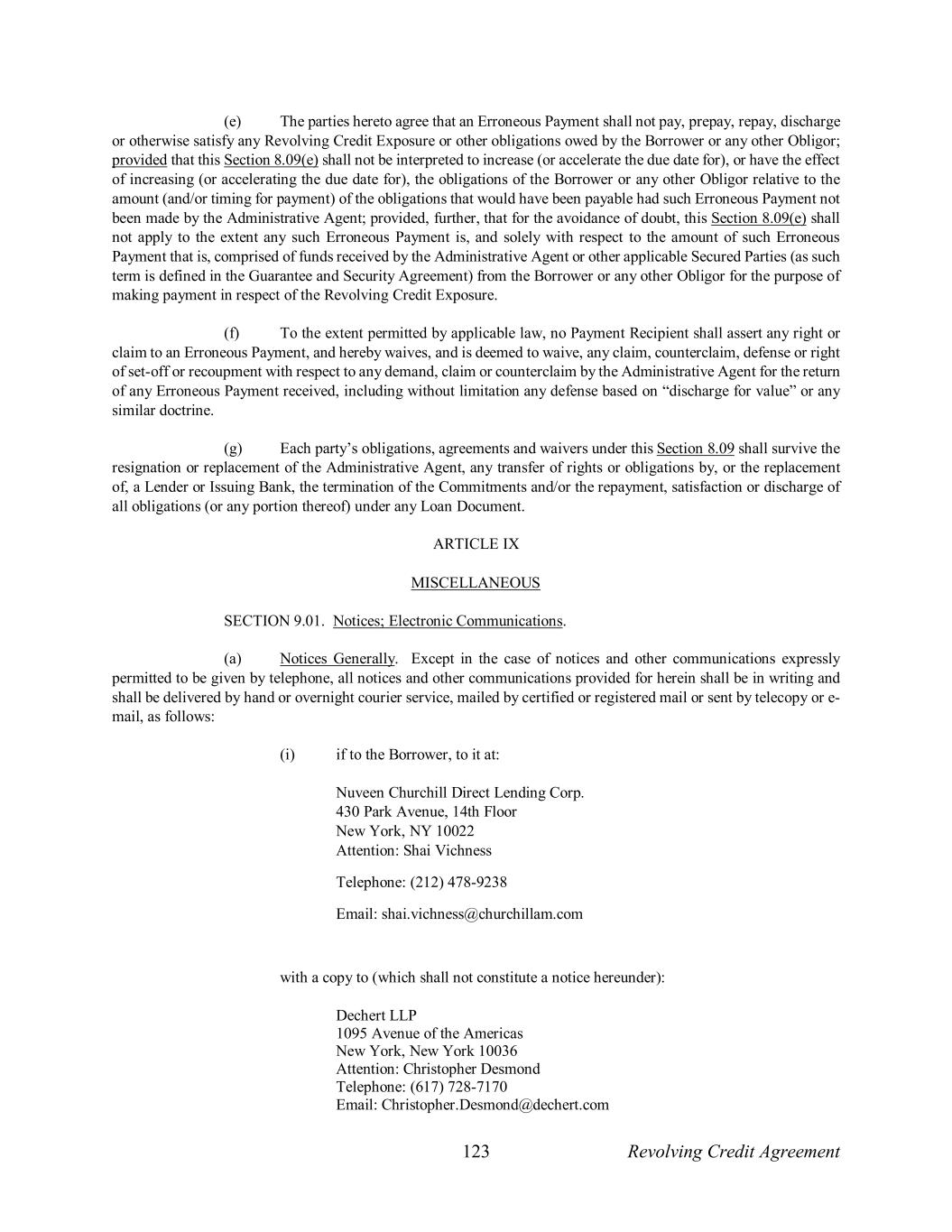 123 Revolving Credit Agreement (e) The parties hereto agree that an Erroneous Payment shall not pay, prepay, repay, discharge or otherwise satisfy any Revolving Credit Exposure or other obligations owed by the Borrower or any other Obligor; provided that this Section 8.09(e) shall not be interpreted to increase (or accelerate the due date for), or have the effect of increasing (or accelerating the due date for), the obligations of the Borrower or any other Obligor relative to the amount (and/or timing for payment) of the obligations that would have been payable had such Erroneous Payment not been made by the Administrative Agent; provided, further, that for the avoidance of doubt, this Section 8.09(e) shall not apply to the extent any such Erroneous Payment is, and solely with respect to the amount of such Erroneous Payment that is, comprised of funds received by the Administrative Agent or other applicable Secured Parties (as such term is defined in the Guarantee and Security Agreement) from the Borrower or any other Obligor for the purpose of making payment in respect of the Revolving Credit Exposure. (f) To the extent permitted by applicable law, no Payment Recipient shall assert any right or claim to an Erroneous Payment, and hereby waives, and is deemed to waive, any claim, counterclaim, defense or right of set-off or recoupment with respect to any demand, claim or counterclaim by the Administrative Agent for the return of any Erroneous Payment received, including without limitation any defense based on “discharge for value” or any similar doctrine. (g) Each party’s obligations, agreements and waivers under this Section 8.09 shall survive the resignation or replacement of the Administrative Agent, any transfer of rights or obligations by, or the replacement of, a Lender or Issuing Bank, the termination of the Commitments and/or the repayment, satisfaction or discharge of all obligations (or any portion thereof) under any Loan Document. ARTICLE IX MISCELLANEOUS SECTION 9.01. Notices; Electronic Communications. (a) Notices Generally. Except in the case of notices and other communications expressly permitted to be given by telephone, all notices and other communications provided for herein shall be in writing and shall be delivered by hand or overnight courier service, mailed by certified or registered mail or sent by telecopy or e- mail, as follows: (i) if to the Borrower, to it at: Nuveen Churchill Direct Lending Corp. 430 Park Avenue, 14th Floor New York, NY 10022 Attention: Shai Vichness Telephone: (212) 478-9238 Email: shai.vichness@churchillam.com with a copy to (which shall not constitute a notice hereunder): Dechert LLP 1095 Avenue of the Americas New York, New York 10036 Attention: Christopher Desmond Telephone: (617) 728-7170 Email: Christopher.Desmond@dechert.com