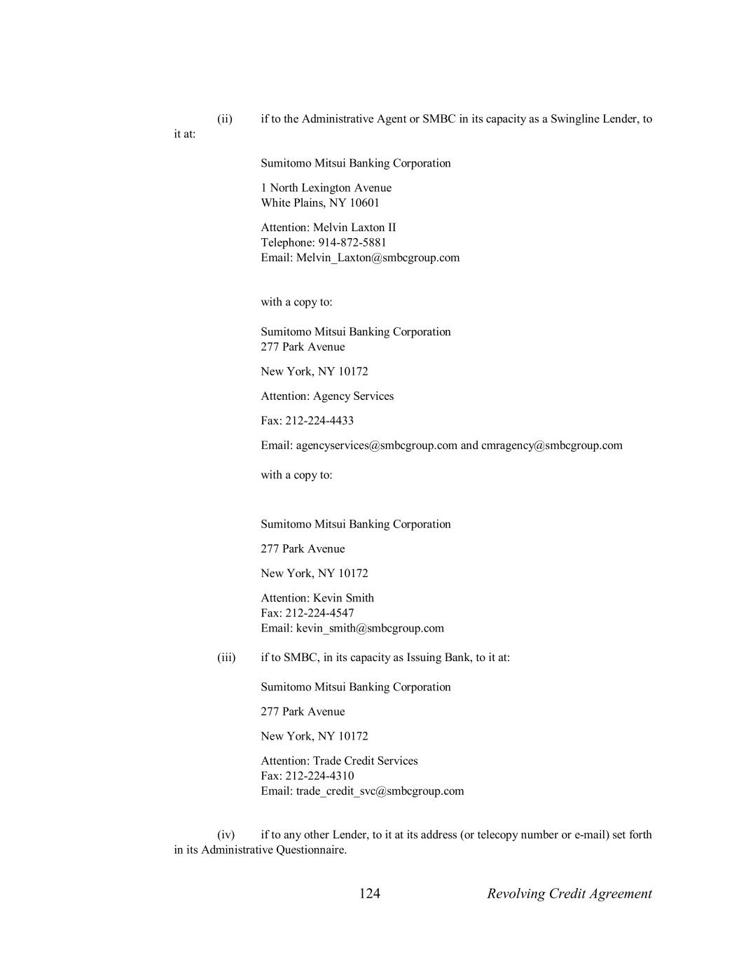 124 Revolving Credit Agreement (ii) if to the Administrative Agent or SMBC in its capacity as a Swingline Lender, to it at: Sumitomo Mitsui Banking Corporation 1 North Lexington Avenue White Plains, NY 10601 Attention: Melvin Laxton II Telephone: 914-872-5881 Email: Melvin_Laxton@smbcgroup.com with a copy to: Sumitomo Mitsui Banking Corporation 277 Park Avenue New York, NY 10172 Attention: Agency Services Fax: 212-224-4433 Email: agencyservices@smbcgroup.com and cmragency@smbcgroup.com with a copy to: Sumitomo Mitsui Banking Corporation 277 Park Avenue New York, NY 10172 Attention: Kevin Smith Fax: 212-224-4547 Email: kevin_smith@smbcgroup.com (iii) if to SMBC, in its capacity as Issuing Bank, to it at: Sumitomo Mitsui Banking Corporation 277 Park Avenue New York, NY 10172 Attention: Trade Credit Services Fax: 212-224-4310 Email: trade_credit_svc@smbcgroup.com (iv) if to any other Lender, to it at its address (or telecopy number or e-mail) set forth in its Administrative Questionnaire.