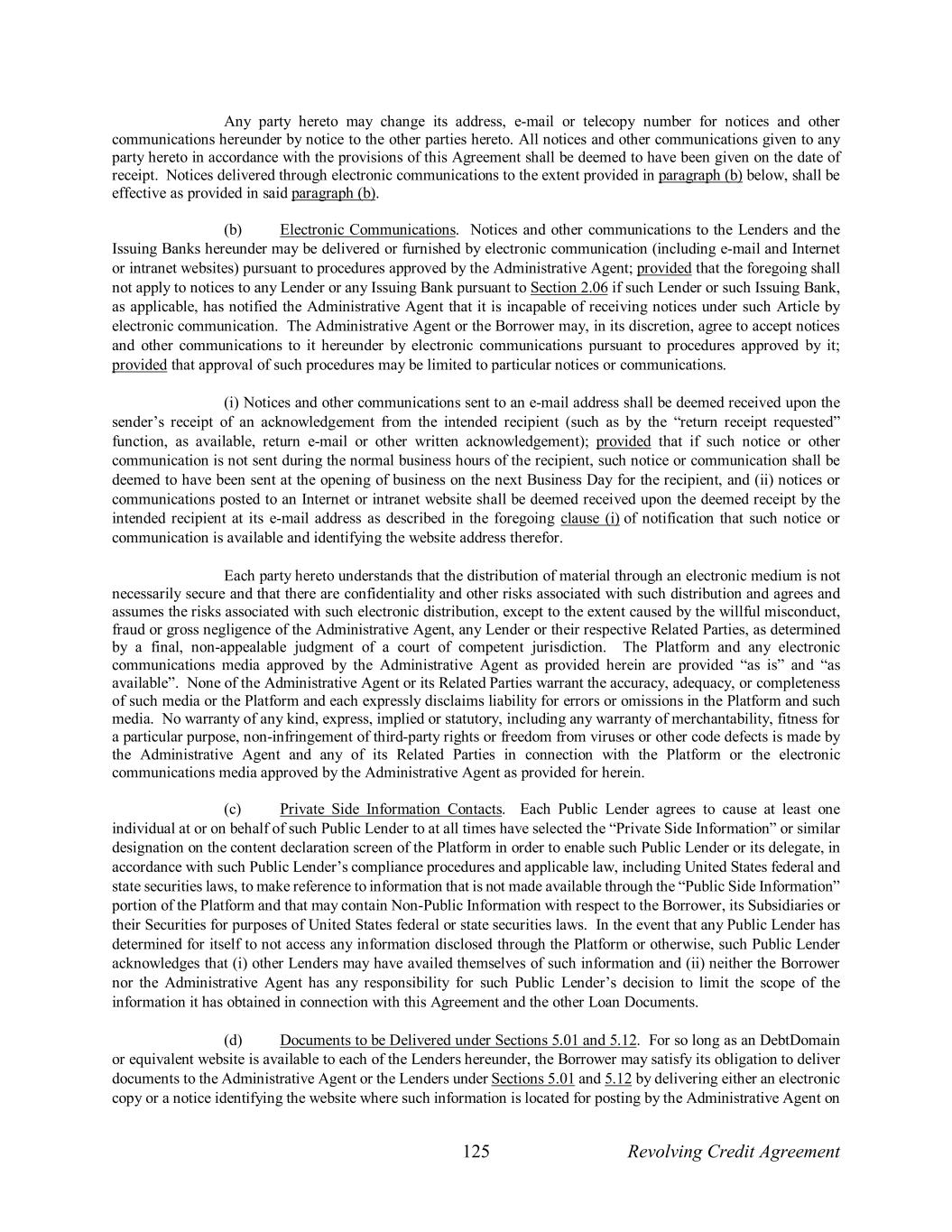 125 Revolving Credit Agreement Any party hereto may change its address, e-mail or telecopy number for notices and other communications hereunder by notice to the other parties hereto. All notices and other communications given to any party hereto in accordance with the provisions of this Agreement shall be deemed to have been given on the date of receipt. Notices delivered through electronic communications to the extent provided in paragraph (b) below, shall be effective as provided in said paragraph (b). (b) Electronic Communications. Notices and other communications to the Lenders and the Issuing Banks hereunder may be delivered or furnished by electronic communication (including e-mail and Internet or intranet websites) pursuant to procedures approved by the Administrative Agent; provided that the foregoing shall not apply to notices to any Lender or any Issuing Bank pursuant to Section 2.06 if such Lender or such Issuing Bank, as applicable, has notified the Administrative Agent that it is incapable of receiving notices under such Article by electronic communication. The Administrative Agent or the Borrower may, in its discretion, agree to accept notices and other communications to it hereunder by electronic communications pursuant to procedures approved by it; provided that approval of such procedures may be limited to particular notices or communications. (i) Notices and other communications sent to an e-mail address shall be deemed received upon the sender’s receipt of an acknowledgement from the intended recipient (such as by the “return receipt requested” function, as available, return e-mail or other written acknowledgement); provided that if such notice or other communication is not sent during the normal business hours of the recipient, such notice or communication shall be deemed to have been sent at the opening of business on the next Business Day for the recipient, and (ii) notices or communications posted to an Internet or intranet website shall be deemed received upon the deemed receipt by the intended recipient at its e-mail address as described in the foregoing clause (i) of notification that such notice or communication is available and identifying the website address therefor. Each party hereto understands that the distribution of material through an electronic medium is not necessarily secure and that there are confidentiality and other risks associated with such distribution and agrees and assumes the risks associated with such electronic distribution, except to the extent caused by the willful misconduct, fraud or gross negligence of the Administrative Agent, any Lender or their respective Related Parties, as determined by a final, non-appealable judgment of a court of competent jurisdiction. The Platform and any electronic communications media approved by the Administrative Agent as provided herein are provided “as is” and “as available”. None of the Administrative Agent or its Related Parties warrant the accuracy, adequacy, or completeness of such media or the Platform and each expressly disclaims liability for errors or omissions in the Platform and such media. No warranty of any kind, express, implied or statutory, including any warranty of merchantability, fitness for a particular purpose, non-infringement of third-party rights or freedom from viruses or other code defects is made by the Administrative Agent and any of its Related Parties in connection with the Platform or the electronic communications media approved by the Administrative Agent as provided for herein. (c) Private Side Information Contacts. Each Public Lender agrees to cause at least one individual at or on behalf of such Public Lender to at all times have selected the “Private Side Information” or similar designation on the content declaration screen of the Platform in order to enable such Public Lender or its delegate, in accordance with such Public Lender’s compliance procedures and applicable law, including United States federal and state securities laws, to make reference to information that is not made available through the “Public Side Information” portion of the Platform and that may contain Non-Public Information with respect to the Borrower, its Subsidiaries or their Securities for purposes of United States federal or state securities laws. In the event that any Public Lender has determined for itself to not access any information disclosed through the Platform or otherwise, such Public Lender acknowledges that (i) other Lenders may have availed themselves of such information and (ii) neither the Borrower nor the Administrative Agent has any responsibility for such Public Lender’s decision to limit the scope of the information it has obtained in connection with this Agreement and the other Loan Documents. (d) Documents to be Delivered under Sections 5.01 and 5.12. For so long as an DebtDomain or equivalent website is available to each of the Lenders hereunder, the Borrower may satisfy its obligation to deliver documents to the Administrative Agent or the Lenders under Sections 5.01 and 5.12 by delivering either an electronic copy or a notice identifying the website where such information is located for posting by the Administrative Agent on