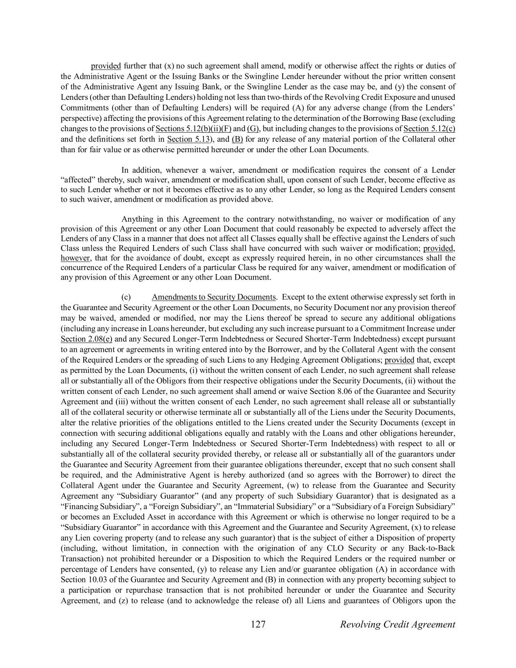 127 Revolving Credit Agreement provided further that (x) no such agreement shall amend, modify or otherwise affect the rights or duties of the Administrative Agent or the Issuing Banks or the Swingline Lender hereunder without the prior written consent of the Administrative Agent any Issuing Bank, or the Swingline Lender as the case may be, and (y) the consent of Lenders (other than Defaulting Lenders) holding not less than two-thirds of the Revolving Credit Exposure and unused Commitments (other than of Defaulting Lenders) will be required (A) for any adverse change (from the Lenders’ perspective) affecting the provisions of this Agreement relating to the determination of the Borrowing Base (excluding changes to the provisions of Sections 5.12(b)(ii)(F) and (G), but including changes to the provisions of Section 5.12(c) and the definitions set forth in Section 5.13), and (B) for any release of any material portion of the Collateral other than for fair value or as otherwise permitted hereunder or under the other Loan Documents. In addition, whenever a waiver, amendment or modification requires the consent of a Lender “affected” thereby, such waiver, amendment or modification shall, upon consent of such Lender, become effective as to such Lender whether or not it becomes effective as to any other Lender, so long as the Required Lenders consent to such waiver, amendment or modification as provided above. Anything in this Agreement to the contrary notwithstanding, no waiver or modification of any provision of this Agreement or any other Loan Document that could reasonably be expected to adversely affect the Lenders of any Class in a manner that does not affect all Classes equally shall be effective against the Lenders of such Class unless the Required Lenders of such Class shall have concurred with such waiver or modification; provided, however, that for the avoidance of doubt, except as expressly required herein, in no other circumstances shall the concurrence of the Required Lenders of a particular Class be required for any waiver, amendment or modification of any provision of this Agreement or any other Loan Document. (c) Amendments to Security Documents. Except to the extent otherwise expressly set forth in the Guarantee and Security Agreement or the other Loan Documents, no Security Document nor any provision thereof may be waived, amended or modified, nor may the Liens thereof be spread to secure any additional obligations (including any increase in Loans hereunder, but excluding any such increase pursuant to a Commitment Increase under Section 2.08(e) and any Secured Longer-Term Indebtedness or Secured Shorter-Term Indebtedness) except pursuant to an agreement or agreements in writing entered into by the Borrower, and by the Collateral Agent with the consent of the Required Lenders or the spreading of such Liens to any Hedging Agreement Obligations; provided that, except as permitted by the Loan Documents, (i) without the written consent of each Lender, no such agreement shall release all or substantially all of the Obligors from their respective obligations under the Security Documents, (ii) without the written consent of each Lender, no such agreement shall amend or waive Section 8.06 of the Guarantee and Security Agreement and (iii) without the written consent of each Lender, no such agreement shall release all or substantially all of the collateral security or otherwise terminate all or substantially all of the Liens under the Security Documents, alter the relative priorities of the obligations entitled to the Liens created under the Security Documents (except in connection with securing additional obligations equally and ratably with the Loans and other obligations hereunder, including any Secured Longer-Term Indebtedness or Secured Shorter-Term Indebtedness) with respect to all or substantially all of the collateral security provided thereby, or release all or substantially all of the guarantors under the Guarantee and Security Agreement from their guarantee obligations thereunder, except that no such consent shall be required, and the Administrative Agent is hereby authorized (and so agrees with the Borrower) to direct the Collateral Agent under the Guarantee and Security Agreement, (w) to release from the Guarantee and Security Agreement any “Subsidiary Guarantor” (and any property of such Subsidiary Guarantor) that is designated as a “Financing Subsidiary”, a “Foreign Subsidiary”, an “Immaterial Subsidiary” or a “Subsidiary of a Foreign Subsidiary” or becomes an Excluded Asset in accordance with this Agreement or which is otherwise no longer required to be a “Subsidiary Guarantor” in accordance with this Agreement and the Guarantee and Security Agreement, (x) to release any Lien covering property (and to release any such guarantor) that is the subject of either a Disposition of property (including, without limitation, in connection with the origination of any CLO Security or any Back-to-Back Transaction) not prohibited hereunder or a Disposition to which the Required Lenders or the required number or percentage of Lenders have consented, (y) to release any Lien and/or guarantee obligation (A) in accordance with Section 10.03 of the Guarantee and Security Agreement and (B) in connection with any property becoming subject to a participation or repurchase transaction that is not prohibited hereunder or under the Guarantee and Security Agreement, and (z) to release (and to acknowledge the release of) all Liens and guarantees of Obligors upon the