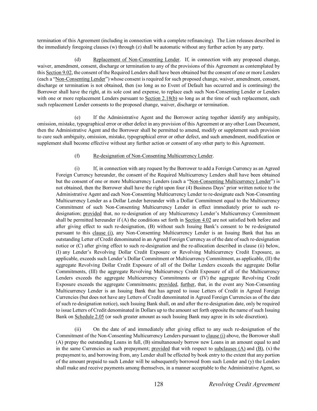 128 Revolving Credit Agreement termination of this Agreement (including in connection with a complete refinancing). The Lien releases described in the immediately foregoing clauses (w) through (z) shall be automatic without any further action by any party. (d) Replacement of Non-Consenting Lender. If, in connection with any proposed change, waiver, amendment, consent, discharge or termination to any of the provisions of this Agreement as contemplated by this Section 9.02, the consent of the Required Lenders shall have been obtained but the consent of one or more Lenders (each a “Non-Consenting Lender”) whose consent is required for such proposed change, waiver, amendment, consent, discharge or termination is not obtained, then (so long as no Event of Default has occurred and is continuing) the Borrower shall have the right, at its sole cost and expense, to replace each such Non-Consenting Lender or Lenders with one or more replacement Lenders pursuant to Section 2.18(b) so long as at the time of such replacement, each such replacement Lender consents to the proposed change, waiver, discharge or termination. (e) If the Administrative Agent and the Borrower acting together identify any ambiguity, omission, mistake, typographical error or other defect in any provision of this Agreement or any other Loan Document, then the Administrative Agent and the Borrower shall be permitted to amend, modify or supplement such provision to cure such ambiguity, omission, mistake, typographical error or other defect, and such amendment, modification or supplement shall become effective without any further action or consent of any other party to this Agreement. (f) Re-designation of Non-Consenting Multicurrency Lender. (i) If, in connection with any request by the Borrower to add a Foreign Currency as an Agreed Foreign Currency hereunder, the consent of the Required Multicurrency Lenders shall have been obtained but the consent of one or more Multicurrency Lenders (each a “Non-Consenting Multicurrency Lender”) is not obtained, then the Borrower shall have the right upon four (4) Business Days’ prior written notice to the Administrative Agent and each Non-Consenting Multicurrency Lender to re-designate each Non-Consenting Multicurrency Lender as a Dollar Lender hereunder with a Dollar Commitment equal to the Multicurrency Commitment of such Non-Consenting Multicurrency Lender in effect immediately prior to such re- designation; provided that, no re-designation of any Multicurrency Lender’s Multicurrency Commitment shall be permitted hereunder if (A) the conditions set forth in Section 4.02 are not satisfied both before and after giving effect to such re-designation, (B) without such Issuing Bank’s consent to be re-designated pursuant to this clause (i), any Non-Consenting Multicurrency Lender is an Issuing Bank that has an outstanding Letter of Credit denominated in an Agreed Foreign Currency as of the date of such re-designation notice or (C) after giving effect to such re-designation and the re-allocation described in clause (ii) below, (I) any Lender’s Revolving Dollar Credit Exposure or Revolving Multicurrency Credit Exposure, as applicable, exceeds such Lender’s Dollar Commitment or Multicurrency Commitment, as applicable, (II) the aggregate Revolving Dollar Credit Exposure of all of the Dollar Lenders exceeds the aggregate Dollar Commitments, (III) the aggregate Revolving Multicurrency Credit Exposure of all of the Multicurrency Lenders exceeds the aggregate Multicurrency Commitments or (IV) the aggregate Revolving Credit Exposure exceeds the aggregate Commitments; provided, further, that, in the event any Non-Consenting Multicurrency Lender is an Issuing Bank that has agreed to issue Letters of Credit in Agreed Foreign Currencies (but does not have any Letters of Credit denominated in Agreed Foreign Currencies as of the date of such re-designation notice), such Issuing Bank shall, on and after the re-designation date, only be required to issue Letters of Credit denominated in Dollars up to the amount set forth opposite the name of such Issuing Bank on Schedule 2.05 (or such greater amount as such Issuing Bank may agree in its sole discretion). (ii) On the date of and immediately after giving effect to any such re-designation of the Commitment of the Non-Consenting Multicurrency Lenders pursuant to clause (i) above, the Borrower shall (A) prepay the outstanding Loans in full, (B) simultaneously borrow new Loans in an amount equal to and in the same Currencies as such prepayment; provided that with respect to subclauses (A) and (B), (x) the prepayment to, and borrowing from, any Lender shall be effected by book entry to the extent that any portion of the amount prepaid to such Lender will be subsequently borrowed from such Lender and (y) the Lenders shall make and receive payments among themselves, in a manner acceptable to the Administrative Agent, so