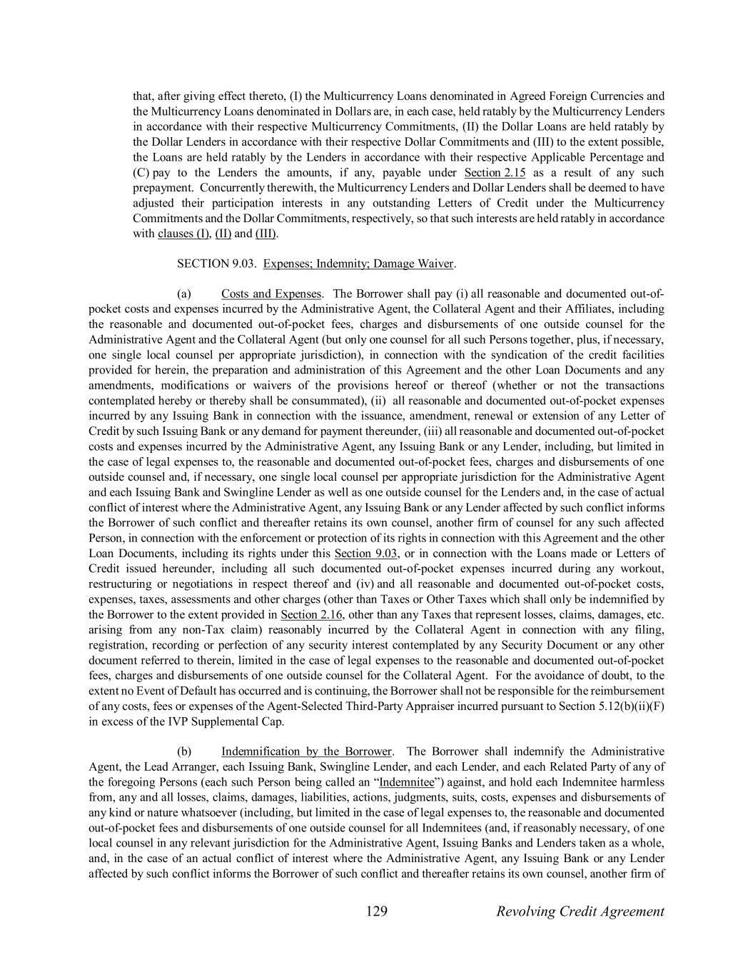 129 Revolving Credit Agreement that, after giving effect thereto, (I) the Multicurrency Loans denominated in Agreed Foreign Currencies and the Multicurrency Loans denominated in Dollars are, in each case, held ratably by the Multicurrency Lenders in accordance with their respective Multicurrency Commitments, (II) the Dollar Loans are held ratably by the Dollar Lenders in accordance with their respective Dollar Commitments and (III) to the extent possible, the Loans are held ratably by the Lenders in accordance with their respective Applicable Percentage and (C) pay to the Lenders the amounts, if any, payable under Section 2.15 as a result of any such prepayment. Concurrently therewith, the Multicurrency Lenders and Dollar Lenders shall be deemed to have adjusted their participation interests in any outstanding Letters of Credit under the Multicurrency Commitments and the Dollar Commitments, respectively, so that such interests are held ratably in accordance with clauses (I), (II) and (III). SECTION 9.03. Expenses; Indemnity; Damage Waiver. (a) Costs and Expenses. The Borrower shall pay (i) all reasonable and documented out-of- pocket costs and expenses incurred by the Administrative Agent, the Collateral Agent and their Affiliates, including the reasonable and documented out-of-pocket fees, charges and disbursements of one outside counsel for the Administrative Agent and the Collateral Agent (but only one counsel for all such Persons together, plus, if necessary, one single local counsel per appropriate jurisdiction), in connection with the syndication of the credit facilities provided for herein, the preparation and administration of this Agreement and the other Loan Documents and any amendments, modifications or waivers of the provisions hereof or thereof (whether or not the transactions contemplated hereby or thereby shall be consummated), (ii) all reasonable and documented out-of-pocket expenses incurred by any Issuing Bank in connection with the issuance, amendment, renewal or extension of any Letter of Credit by such Issuing Bank or any demand for payment thereunder, (iii) all reasonable and documented out-of-pocket costs and expenses incurred by the Administrative Agent, any Issuing Bank or any Lender, including, but limited in the case of legal expenses to, the reasonable and documented out-of-pocket fees, charges and disbursements of one outside counsel and, if necessary, one single local counsel per appropriate jurisdiction for the Administrative Agent and each Issuing Bank and Swingline Lender as well as one outside counsel for the Lenders and, in the case of actual conflict of interest where the Administrative Agent, any Issuing Bank or any Lender affected by such conflict informs the Borrower of such conflict and thereafter retains its own counsel, another firm of counsel for any such affected Person, in connection with the enforcement or protection of its rights in connection with this Agreement and the other Loan Documents, including its rights under this Section 9.03, or in connection with the Loans made or Letters of Credit issued hereunder, including all such documented out-of-pocket expenses incurred during any workout, restructuring or negotiations in respect thereof and (iv) and all reasonable and documented out-of-pocket costs, expenses, taxes, assessments and other charges (other than Taxes or Other Taxes which shall only be indemnified by the Borrower to the extent provided in Section 2.16, other than any Taxes that represent losses, claims, damages, etc. arising from any non-Tax claim) reasonably incurred by the Collateral Agent in connection with any filing, registration, recording or perfection of any security interest contemplated by any Security Document or any other document referred to therein, limited in the case of legal expenses to the reasonable and documented out-of-pocket fees, charges and disbursements of one outside counsel for the Collateral Agent. For the avoidance of doubt, to the extent no Event of Default has occurred and is continuing, the Borrower shall not be responsible for the reimbursement of any costs, fees or expenses of the Agent-Selected Third-Party Appraiser incurred pursuant to Section 5.12(b)(ii)(F) in excess of the IVP Supplemental Cap. (b) Indemnification by the Borrower. The Borrower shall indemnify the Administrative Agent, the Lead Arranger, each Issuing Bank, Swingline Lender, and each Lender, and each Related Party of any of the foregoing Persons (each such Person being called an “Indemnitee”) against, and hold each Indemnitee harmless from, any and all losses, claims, damages, liabilities, actions, judgments, suits, costs, expenses and disbursements of any kind or nature whatsoever (including, but limited in the case of legal expenses to, the reasonable and documented out-of-pocket fees and disbursements of one outside counsel for all Indemnitees (and, if reasonably necessary, of one local counsel in any relevant jurisdiction for the Administrative Agent, Issuing Banks and Lenders taken as a whole, and, in the case of an actual conflict of interest where the Administrative Agent, any Issuing Bank or any Lender affected by such conflict informs the Borrower of such conflict and thereafter retains its own counsel, another firm of