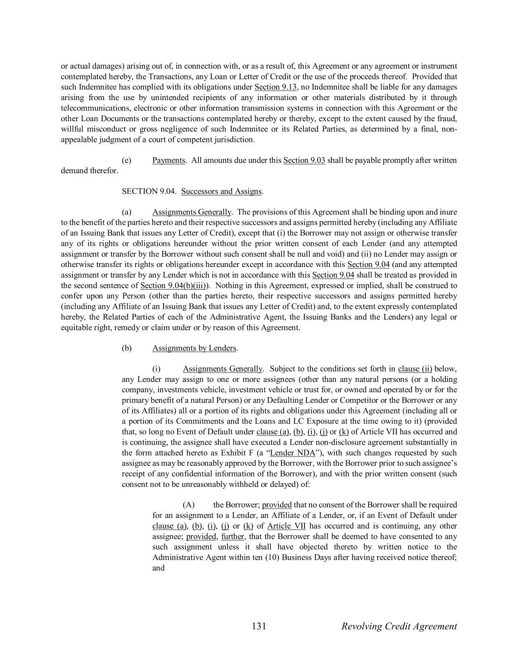 131 Revolving Credit Agreement or actual damages) arising out of, in connection with, or as a result of, this Agreement or any agreement or instrument contemplated hereby, the Transactions, any Loan or Letter of Credit or the use of the proceeds thereof. Provided that such Indemnitee has complied with its obligations under Section 9.13, no Indemnitee shall be liable for any damages arising from the use by unintended recipients of any information or other materials distributed by it through telecommunications, electronic or other information transmission systems in connection with this Agreement or the other Loan Documents or the transactions contemplated hereby or thereby, except to the extent caused by the fraud, willful misconduct or gross negligence of such Indemnitee or its Related Parties, as determined by a final, non- appealable judgment of a court of competent jurisdiction. (e) Payments. All amounts due under this Section 9.03 shall be payable promptly after written demand therefor. SECTION 9.04. Successors and Assigns. (a) Assignments Generally. The provisions of this Agreement shall be binding upon and inure to the benefit of the parties hereto and their respective successors and assigns permitted hereby (including any Affiliate of an Issuing Bank that issues any Letter of Credit), except that (i) the Borrower may not assign or otherwise transfer any of its rights or obligations hereunder without the prior written consent of each Lender (and any attempted assignment or transfer by the Borrower without such consent shall be null and void) and (ii) no Lender may assign or otherwise transfer its rights or obligations hereunder except in accordance with this Section 9.04 (and any attempted assignment or transfer by any Lender which is not in accordance with this Section 9.04 shall be treated as provided in the second sentence of Section 9.04(b)(iii)). Nothing in this Agreement, expressed or implied, shall be construed to confer upon any Person (other than the parties hereto, their respective successors and assigns permitted hereby (including any Affiliate of an Issuing Bank that issues any Letter of Credit) and, to the extent expressly contemplated hereby, the Related Parties of each of the Administrative Agent, the Issuing Banks and the Lenders) any legal or equitable right, remedy or claim under or by reason of this Agreement. (b) Assignments by Lenders. (i) Assignments Generally. Subject to the conditions set forth in clause (ii) below, any Lender may assign to one or more assignees (other than any natural persons (or a holding company, investments vehicle, investment vehicle or trust for, or owned and operated by or for the primary benefit of a natural Person) or any Defaulting Lender or Competitor or the Borrower or any of its Affiliates) all or a portion of its rights and obligations under this Agreement (including all or a portion of its Commitments and the Loans and LC Exposure at the time owing to it) (provided that, so long no Event of Default under clause (a), (b), (i), (j) or (k) of Article VII has occurred and is continuing, the assignee shall have executed a Lender non-disclosure agreement substantially in the form attached hereto as Exhibit F (a “Lender NDA”), with such changes requested by such assignee as may be reasonably approved by the Borrower, with the Borrower prior to such assignee’s receipt of any confidential information of the Borrower), and with the prior written consent (such consent not to be unreasonably withheld or delayed) of: (A) the Borrower; provided that no consent of the Borrower shall be required for an assignment to a Lender, an Affiliate of a Lender, or, if an Event of Default under clause (a), (b), (i), (j) or (k) of Article VII has occurred and is continuing, any other assignee; provided, further, that the Borrower shall be deemed to have consented to any such assignment unless it shall have objected thereto by written notice to the Administrative Agent within ten (10) Business Days after having received notice thereof; and