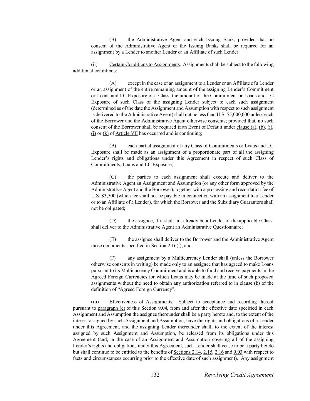 132 Revolving Credit Agreement (B) the Administrative Agent and each Issuing Bank; provided that no consent of the Administrative Agent or the Issuing Banks shall be required for an assignment by a Lender to another Lender or an Affiliate of such Lender. (ii) Certain Conditions to Assignments. Assignments shall be subject to the following additional conditions: (A) except in the case of an assignment to a Lender or an Affiliate of a Lender or an assignment of the entire remaining amount of the assigning Lender’s Commitment or Loans and LC Exposure of a Class, the amount of the Commitment or Loans and LC Exposure of such Class of the assigning Lender subject to each such assignment (determined as of the date the Assignment and Assumption with respect to such assignment is delivered to the Administrative Agent) shall not be less than U.S. $5,000,000 unless each of the Borrower and the Administrative Agent otherwise consents; provided that, no such consent of the Borrower shall be required if an Event of Default under clause (a), (b), (i), (j) or (k) of Article VII has occurred and is continuing; (B) each partial assignment of any Class of Commitments or Loans and LC Exposure shall be made as an assignment of a proportionate part of all the assigning Lender’s rights and obligations under this Agreement in respect of such Class of Commitments, Loans and LC Exposure; (C) the parties to each assignment shall execute and deliver to the Administrative Agent an Assignment and Assumption (or any other form approved by the Administrative Agent and the Borrower), together with a processing and recordation fee of U.S. $3,500 (which fee shall not be payable in connection with an assignment to a Lender or to an Affiliate of a Lender), for which the Borrower and the Subsidiary Guarantors shall not be obligated; (D) the assignee, if it shall not already be a Lender of the applicable Class, shall deliver to the Administrative Agent an Administrative Questionnaire; (E) the assignee shall deliver to the Borrower and the Administrative Agent those documents specified in Section 2.16(f); and (F) any assignment by a Multicurrency Lender shall (unless the Borrower otherwise consents in writing) be made only to an assignee that has agreed to make Loans pursuant to its Multicurrency Commitment and is able to fund and receive payments in the Agreed Foreign Currencies for which Loans may be made at the time of such proposed assignments without the need to obtain any authorization referred to in clause (b) of the definition of “Agreed Foreign Currency”. (iii) Effectiveness of Assignments. Subject to acceptance and recording thereof pursuant to paragraph (c) of this Section 9.04, from and after the effective date specified in each Assignment and Assumption the assignee thereunder shall be a party hereto and, to the extent of the interest assigned by such Assignment and Assumption, have the rights and obligations of a Lender under this Agreement, and the assigning Lender thereunder shall, to the extent of the interest assigned by such Assignment and Assumption, be released from its obligations under this Agreement (and, in the case of an Assignment and Assumption covering all of the assigning Lender’s rights and obligations under this Agreement, such Lender shall cease to be a party hereto but shall continue to be entitled to the benefits of Sections 2.14, 2.15, 2.16 and 9.03 with respect to facts and circumstances occurring prior to the effective date of such assignment). Any assignment