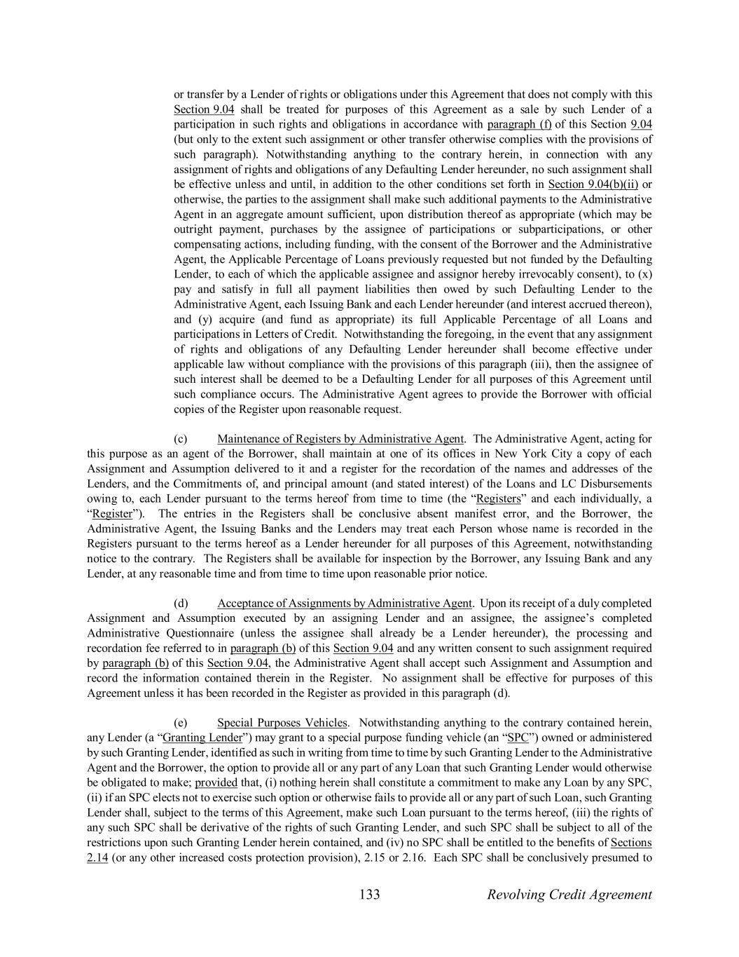 133 Revolving Credit Agreement or transfer by a Lender of rights or obligations under this Agreement that does not comply with this Section 9.04 shall be treated for purposes of this Agreement as a sale by such Lender of a participation in such rights and obligations in accordance with paragraph (f) of this Section 9.04 (but only to the extent such assignment or other transfer otherwise complies with the provisions of such paragraph). Notwithstanding anything to the contrary herein, in connection with any assignment of rights and obligations of any Defaulting Lender hereunder, no such assignment shall be effective unless and until, in addition to the other conditions set forth in Section 9.04(b)(ii) or otherwise, the parties to the assignment shall make such additional payments to the Administrative Agent in an aggregate amount sufficient, upon distribution thereof as appropriate (which may be outright payment, purchases by the assignee of participations or subparticipations, or other compensating actions, including funding, with the consent of the Borrower and the Administrative Agent, the Applicable Percentage of Loans previously requested but not funded by the Defaulting Lender, to each of which the applicable assignee and assignor hereby irrevocably consent), to (x) pay and satisfy in full all payment liabilities then owed by such Defaulting Lender to the Administrative Agent, each Issuing Bank and each Lender hereunder (and interest accrued thereon), and (y) acquire (and fund as appropriate) its full Applicable Percentage of all Loans and participations in Letters of Credit. Notwithstanding the foregoing, in the event that any assignment of rights and obligations of any Defaulting Lender hereunder shall become effective under applicable law without compliance with the provisions of this paragraph (iii), then the assignee of such interest shall be deemed to be a Defaulting Lender for all purposes of this Agreement until such compliance occurs. The Administrative Agent agrees to provide the Borrower with official copies of the Register upon reasonable request. (c) Maintenance of Registers by Administrative Agent. The Administrative Agent, acting for this purpose as an agent of the Borrower, shall maintain at one of its offices in New York City a copy of each Assignment and Assumption delivered to it and a register for the recordation of the names and addresses of the Lenders, and the Commitments of, and principal amount (and stated interest) of the Loans and LC Disbursements owing to, each Lender pursuant to the terms hereof from time to time (the “Registers” and each individually, a “Register”). The entries in the Registers shall be conclusive absent manifest error, and the Borrower, the Administrative Agent, the Issuing Banks and the Lenders may treat each Person whose name is recorded in the Registers pursuant to the terms hereof as a Lender hereunder for all purposes of this Agreement, notwithstanding notice to the contrary. The Registers shall be available for inspection by the Borrower, any Issuing Bank and any Lender, at any reasonable time and from time to time upon reasonable prior notice. (d) Acceptance of Assignments by Administrative Agent. Upon its receipt of a duly completed Assignment and Assumption executed by an assigning Lender and an assignee, the assignee’s completed Administrative Questionnaire (unless the assignee shall already be a Lender hereunder), the processing and recordation fee referred to in paragraph (b) of this Section 9.04 and any written consent to such assignment required by paragraph (b) of this Section 9.04, the Administrative Agent shall accept such Assignment and Assumption and record the information contained therein in the Register. No assignment shall be effective for purposes of this Agreement unless it has been recorded in the Register as provided in this paragraph (d). (e) Special Purposes Vehicles. Notwithstanding anything to the contrary contained herein, any Lender (a “Granting Lender”) may grant to a special purpose funding vehicle (an “SPC”) owned or administered by such Granting Lender, identified as such in writing from time to time by such Granting Lender to the Administrative Agent and the Borrower, the option to provide all or any part of any Loan that such Granting Lender would otherwise be obligated to make; provided that, (i) nothing herein shall constitute a commitment to make any Loan by any SPC, (ii) if an SPC elects not to exercise such option or otherwise fails to provide all or any part of such Loan, such Granting Lender shall, subject to the terms of this Agreement, make such Loan pursuant to the terms hereof, (iii) the rights of any such SPC shall be derivative of the rights of such Granting Lender, and such SPC shall be subject to all of the restrictions upon such Granting Lender herein contained, and (iv) no SPC shall be entitled to the benefits of Sections 2.14 (or any other increased costs protection provision), 2.15 or 2.16. Each SPC shall be conclusively presumed to