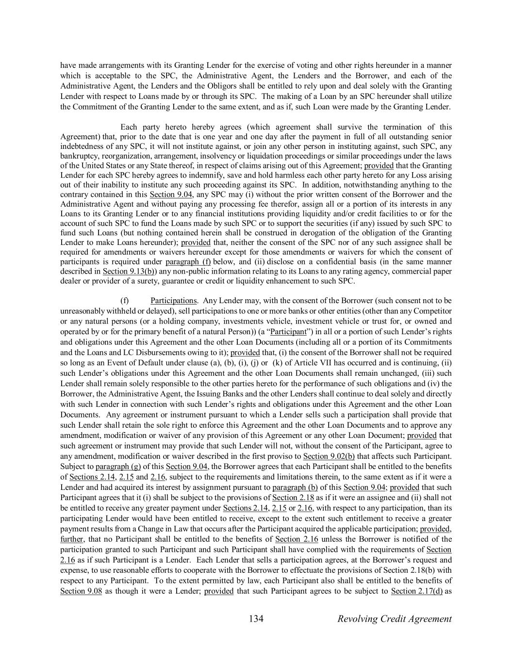 134 Revolving Credit Agreement have made arrangements with its Granting Lender for the exercise of voting and other rights hereunder in a manner which is acceptable to the SPC, the Administrative Agent, the Lenders and the Borrower, and each of the Administrative Agent, the Lenders and the Obligors shall be entitled to rely upon and deal solely with the Granting Lender with respect to Loans made by or through its SPC. The making of a Loan by an SPC hereunder shall utilize the Commitment of the Granting Lender to the same extent, and as if, such Loan were made by the Granting Lender. Each party hereto hereby agrees (which agreement shall survive the termination of this Agreement) that, prior to the date that is one year and one day after the payment in full of all outstanding senior indebtedness of any SPC, it will not institute against, or join any other person in instituting against, such SPC, any bankruptcy, reorganization, arrangement, insolvency or liquidation proceedings or similar proceedings under the laws of the United States or any State thereof, in respect of claims arising out of this Agreement; provided that the Granting Lender for each SPC hereby agrees to indemnify, save and hold harmless each other party hereto for any Loss arising out of their inability to institute any such proceeding against its SPC. In addition, notwithstanding anything to the contrary contained in this Section 9.04, any SPC may (i) without the prior written consent of the Borrower and the Administrative Agent and without paying any processing fee therefor, assign all or a portion of its interests in any Loans to its Granting Lender or to any financial institutions providing liquidity and/or credit facilities to or for the account of such SPC to fund the Loans made by such SPC or to support the securities (if any) issued by such SPC to fund such Loans (but nothing contained herein shall be construed in derogation of the obligation of the Granting Lender to make Loans hereunder); provided that, neither the consent of the SPC nor of any such assignee shall be required for amendments or waivers hereunder except for those amendments or waivers for which the consent of participants is required under paragraph (f) below, and (ii) disclose on a confidential basis (in the same manner described in Section 9.13(b)) any non-public information relating to its Loans to any rating agency, commercial paper dealer or provider of a surety, guarantee or credit or liquidity enhancement to such SPC. (f) Participations. Any Lender may, with the consent of the Borrower (such consent not to be unreasonably withheld or delayed), sell participations to one or more banks or other entities (other than any Competitor or any natural persons (or a holding company, investments vehicle, investment vehicle or trust for, or owned and operated by or for the primary benefit of a natural Person)) (a “Participant”) in all or a portion of such Lender’s rights and obligations under this Agreement and the other Loan Documents (including all or a portion of its Commitments and the Loans and LC Disbursements owing to it); provided that, (i) the consent of the Borrower shall not be required so long as an Event of Default under clause (a), (b), (i), (j) or (k) of Article VII has occurred and is continuing, (ii) such Lender’s obligations under this Agreement and the other Loan Documents shall remain unchanged, (iii) such Lender shall remain solely responsible to the other parties hereto for the performance of such obligations and (iv) the Borrower, the Administrative Agent, the Issuing Banks and the other Lenders shall continue to deal solely and directly with such Lender in connection with such Lender’s rights and obligations under this Agreement and the other Loan Documents. Any agreement or instrument pursuant to which a Lender sells such a participation shall provide that such Lender shall retain the sole right to enforce this Agreement and the other Loan Documents and to approve any amendment, modification or waiver of any provision of this Agreement or any other Loan Document; provided that such agreement or instrument may provide that such Lender will not, without the consent of the Participant, agree to any amendment, modification or waiver described in the first proviso to Section 9.02(b) that affects such Participant. Subject to paragraph (g) of this Section 9.04, the Borrower agrees that each Participant shall be entitled to the benefits of Sections 2.14, 2.15 and 2.16, subject to the requirements and limitations therein, to the same extent as if it were a Lender and had acquired its interest by assignment pursuant to paragraph (b) of this Section 9.04; provided that such Participant agrees that it (i) shall be subject to the provisions of Section 2.18 as if it were an assignee and (ii) shall not be entitled to receive any greater payment under Sections 2.14, 2.15 or 2.16, with respect to any participation, than its participating Lender would have been entitled to receive, except to the extent such entitlement to receive a greater payment results from a Change in Law that occurs after the Participant acquired the applicable participation; provided, further, that no Participant shall be entitled to the benefits of Section 2.16 unless the Borrower is notified of the participation granted to such Participant and such Participant shall have complied with the requirements of Section 2.16 as if such Participant is a Lender. Each Lender that sells a participation agrees, at the Borrower’s request and expense, to use reasonable efforts to cooperate with the Borrower to effectuate the provisions of Section 2.18(b) with respect to any Participant. To the extent permitted by law, each Participant also shall be entitled to the benefits of Section 9.08 as though it were a Lender; provided that such Participant agrees to be subject to Section 2.17(d) as
