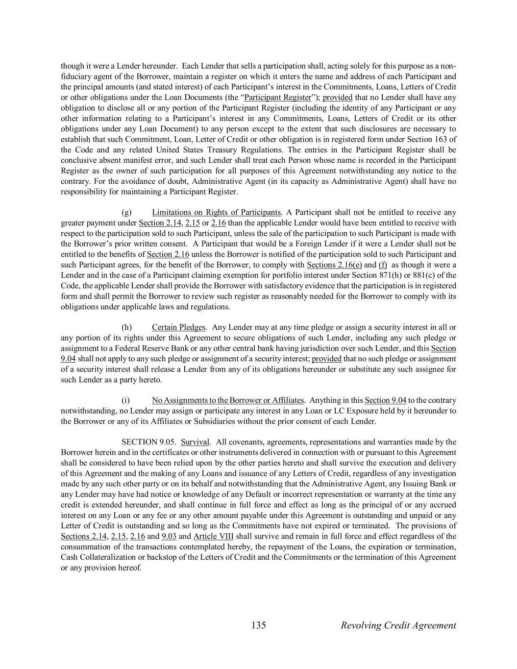 135 Revolving Credit Agreement though it were a Lender hereunder. Each Lender that sells a participation shall, acting solely for this purpose as a non- fiduciary agent of the Borrower, maintain a register on which it enters the name and address of each Participant and the principal amounts (and stated interest) of each Participant’s interest in the Commitments, Loans, Letters of Credit or other obligations under the Loan Documents (the “Participant Register”); provided that no Lender shall have any obligation to disclose all or any portion of the Participant Register (including the identity of any Participant or any other information relating to a Participant’s interest in any Commitments, Loans, Letters of Credit or its other obligations under any Loan Document) to any person except to the extent that such disclosures are necessary to establish that such Commitment, Loan, Letter of Credit or other obligation is in registered form under Section 163 of the Code and any related United States Treasury Regulations. The entries in the Participant Register shall be conclusive absent manifest error, and such Lender shall treat each Person whose name is recorded in the Participant Register as the owner of such participation for all purposes of this Agreement notwithstanding any notice to the contrary. For the avoidance of doubt, Administrative Agent (in its capacity as Administrative Agent) shall have no responsibility for maintaining a Participant Register. (g) Limitations on Rights of Participants. A Participant shall not be entitled to receive any greater payment under Section 2.14, 2.15 or 2.16 than the applicable Lender would have been entitled to receive with respect to the participation sold to such Participant, unless the sale of the participation to such Participant is made with the Borrower’s prior written consent. A Participant that would be a Foreign Lender if it were a Lender shall not be entitled to the benefits of Section 2.16 unless the Borrower is notified of the participation sold to such Participant and such Participant agrees, for the benefit of the Borrower, to comply with Sections 2.16(e) and (f) as though it were a Lender and in the case of a Participant claiming exemption for portfolio interest under Section 871(h) or 881(c) of the Code, the applicable Lender shall provide the Borrower with satisfactory evidence that the participation is in registered form and shall permit the Borrower to review such register as reasonably needed for the Borrower to comply with its obligations under applicable laws and regulations. (h) Certain Pledges. Any Lender may at any time pledge or assign a security interest in all or any portion of its rights under this Agreement to secure obligations of such Lender, including any such pledge or assignment to a Federal Reserve Bank or any other central bank having jurisdiction over such Lender, and this Section 9.04 shall not apply to any such pledge or assignment of a security interest; provided that no such pledge or assignment of a security interest shall release a Lender from any of its obligations hereunder or substitute any such assignee for such Lender as a party hereto. (i) No Assignments to the Borrower or Affiliates. Anything in this Section 9.04 to the contrary notwithstanding, no Lender may assign or participate any interest in any Loan or LC Exposure held by it hereunder to the Borrower or any of its Affiliates or Subsidiaries without the prior consent of each Lender. SECTION 9.05. Survival. All covenants, agreements, representations and warranties made by the Borrower herein and in the certificates or other instruments delivered in connection with or pursuant to this Agreement shall be considered to have been relied upon by the other parties hereto and shall survive the execution and delivery of this Agreement and the making of any Loans and issuance of any Letters of Credit, regardless of any investigation made by any such other party or on its behalf and notwithstanding that the Administrative Agent, any Issuing Bank or any Lender may have had notice or knowledge of any Default or incorrect representation or warranty at the time any credit is extended hereunder, and shall continue in full force and effect as long as the principal of or any accrued interest on any Loan or any fee or any other amount payable under this Agreement is outstanding and unpaid or any Letter of Credit is outstanding and so long as the Commitments have not expired or terminated. The provisions of Sections 2.14, 2.15, 2.16 and 9.03 and Article VIII shall survive and remain in full force and effect regardless of the consummation of the transactions contemplated hereby, the repayment of the Loans, the expiration or termination, Cash Collateralization or backstop of the Letters of Credit and the Commitments or the termination of this Agreement or any provision hereof.